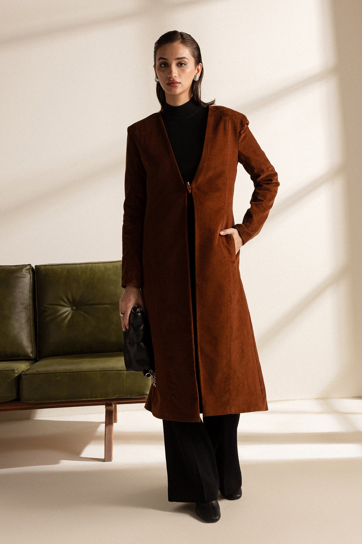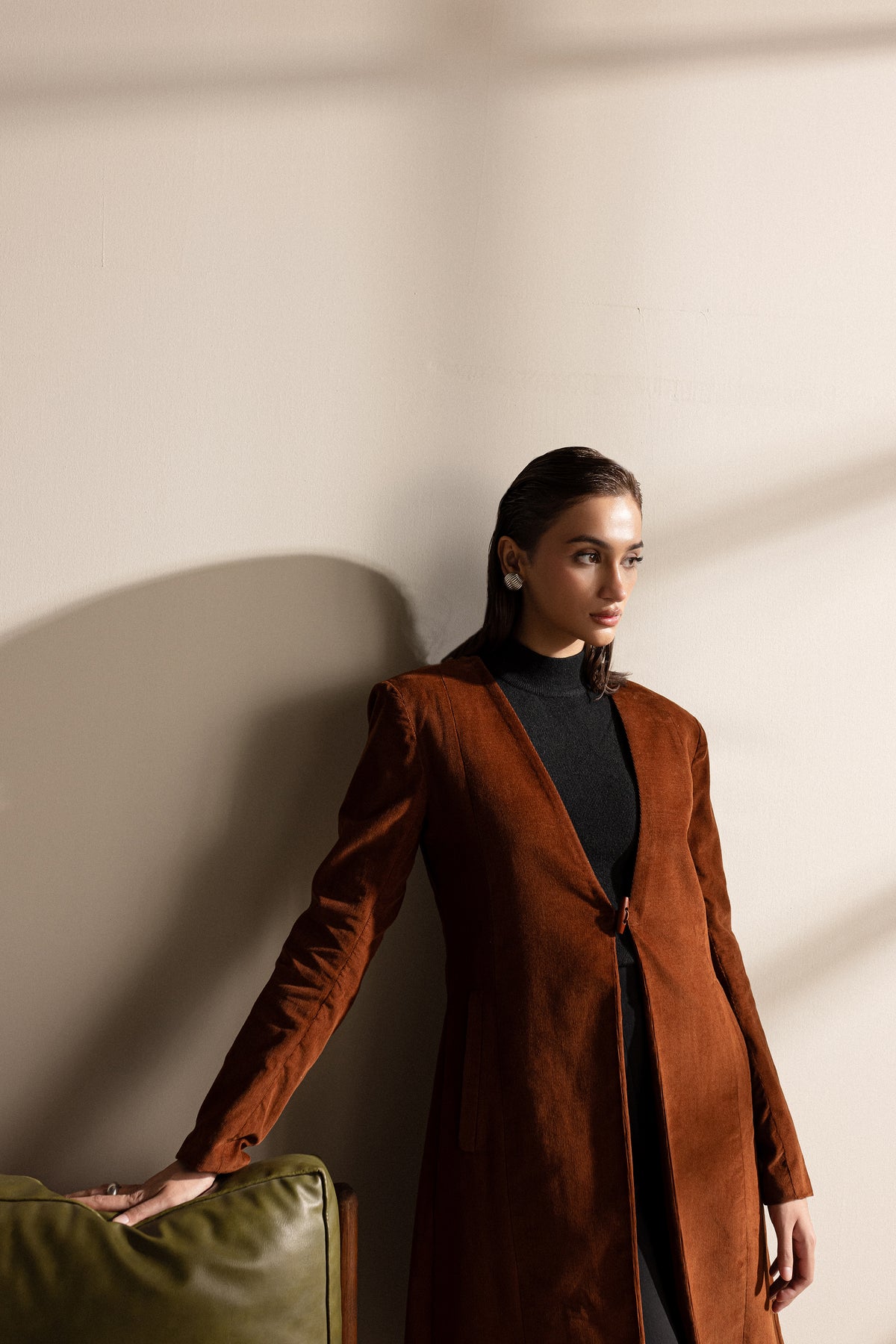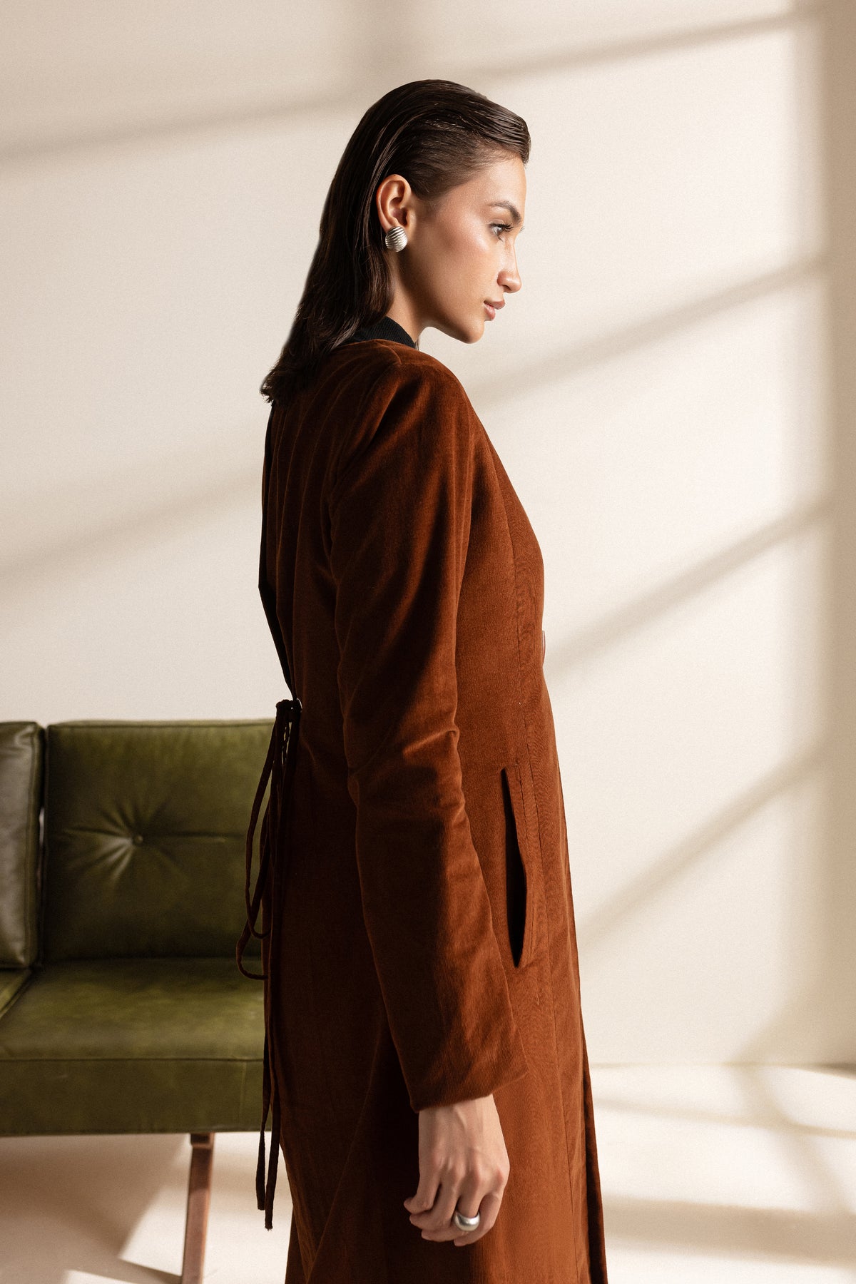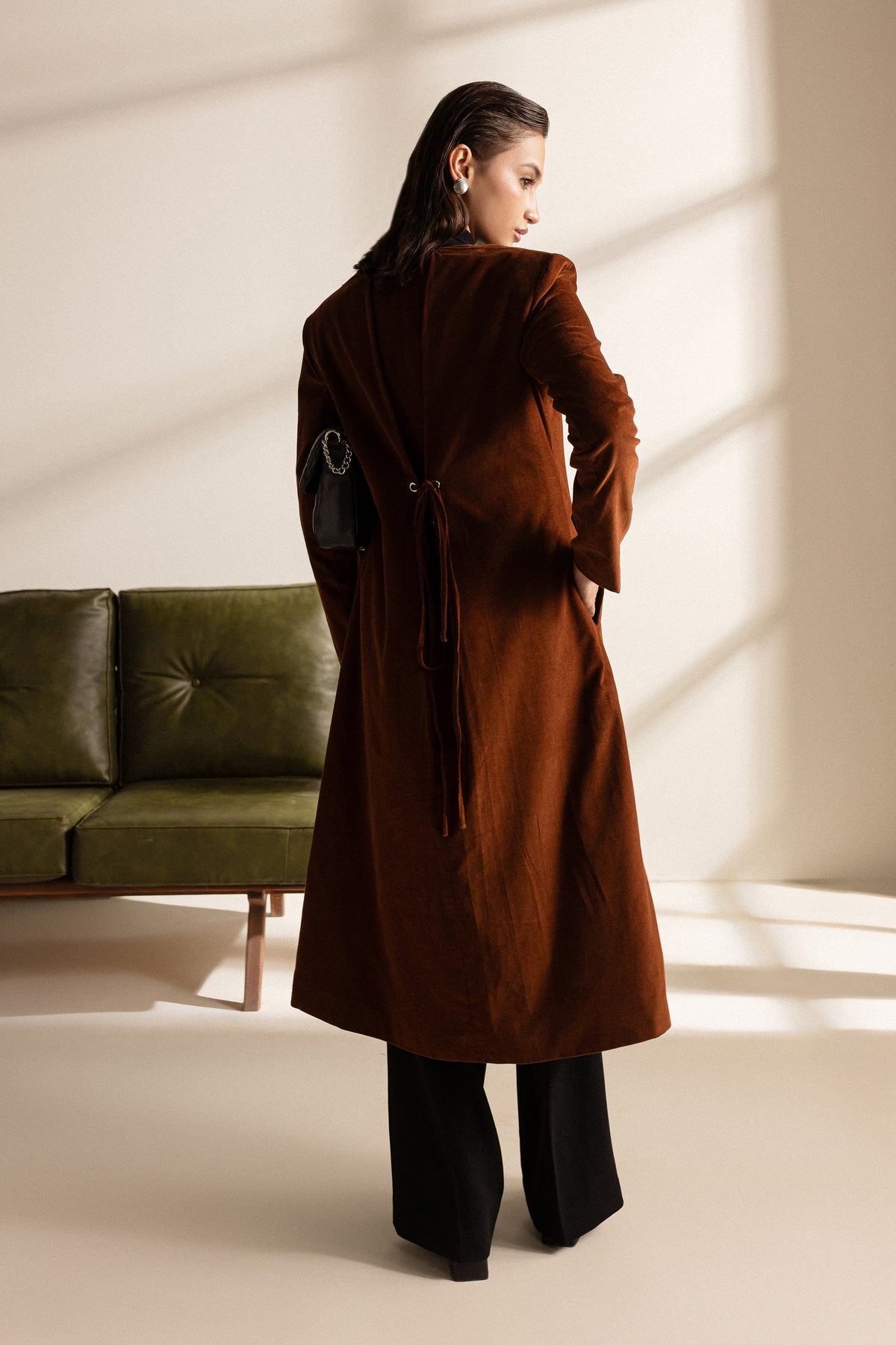 Available in a warm brown shade, this long, paneled coat shares the same refined design as the black variant. Its structured panels and clean lines ensure a flattering fit, while the rich brown corduroy fabric adds warmth and texture to the ensemble. A perfect choice for those looking for a versatile yet standout outerwear piece.
