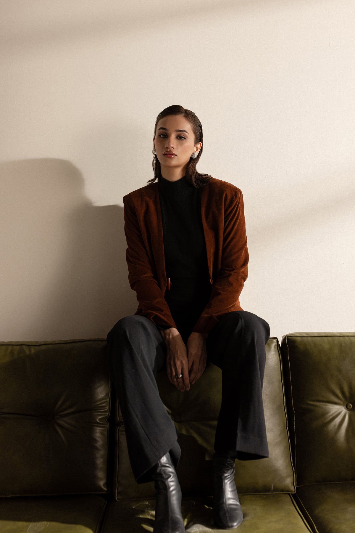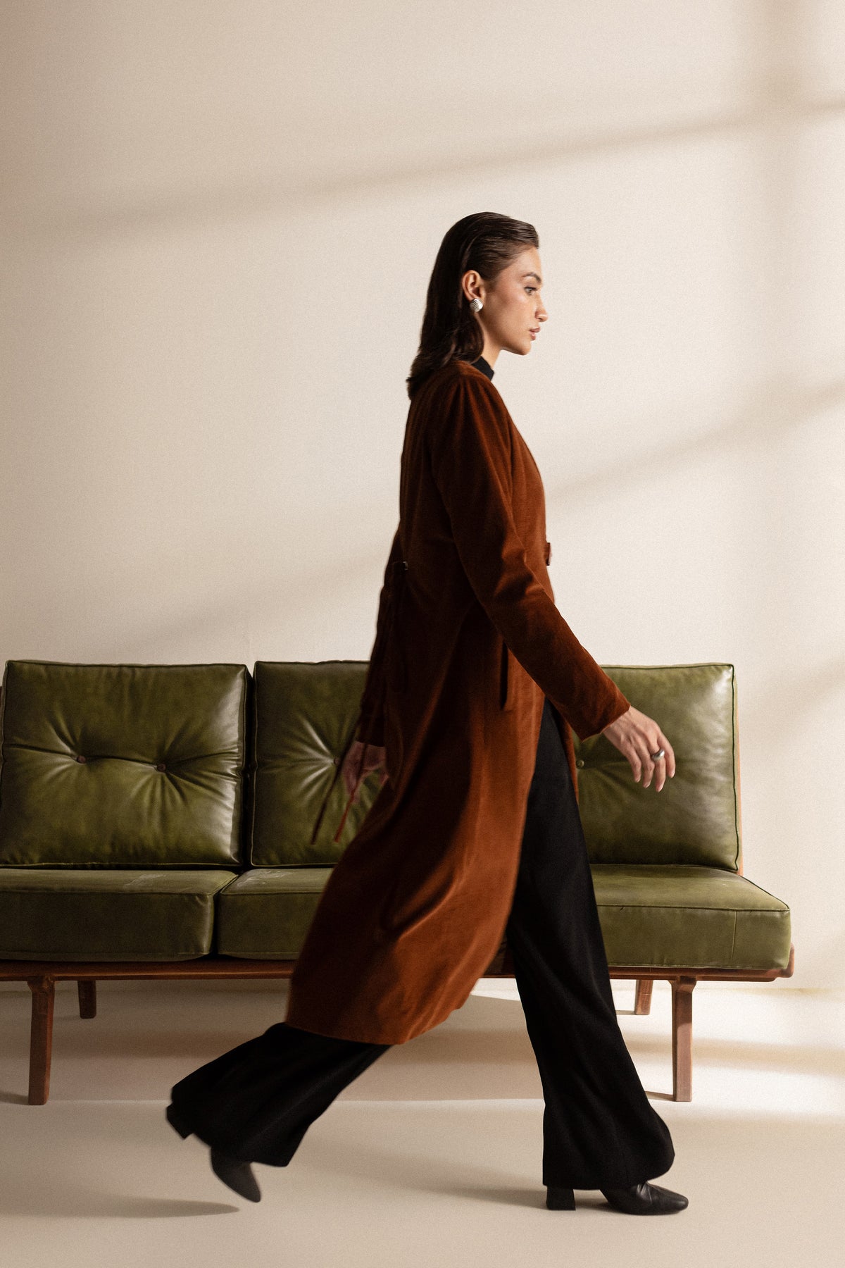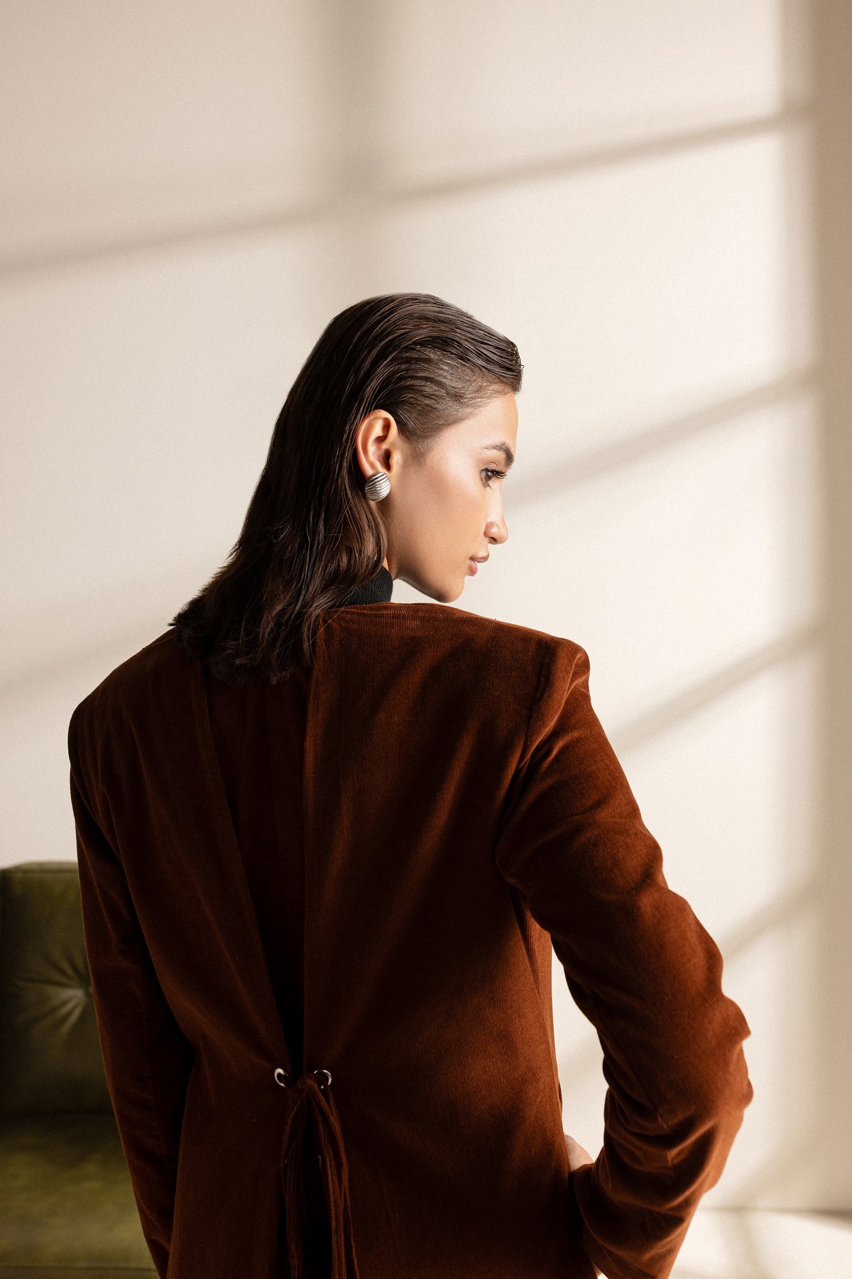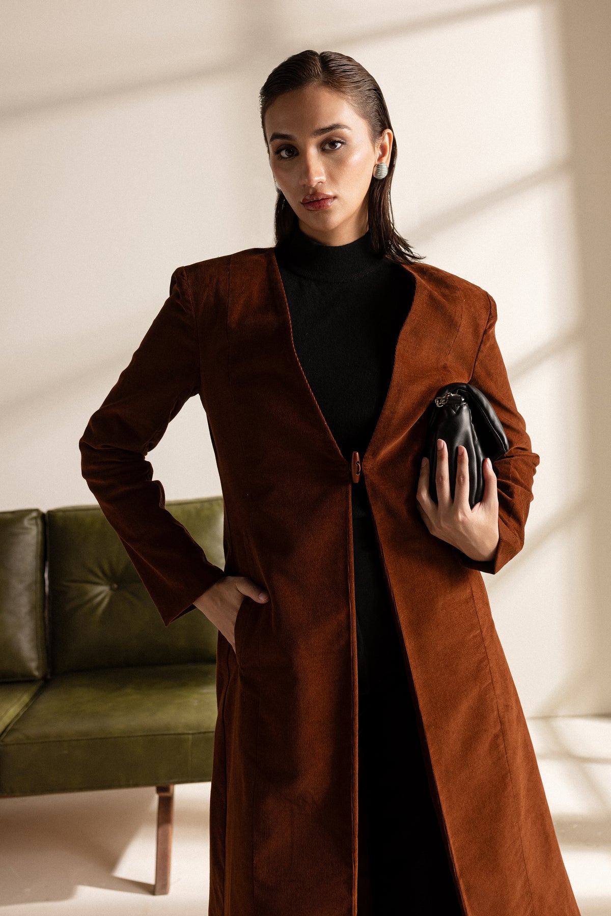 Available in a warm brown shade, this long, paneled coat shares the same refined design as the black variant. Its structured panels and clean lines ensure a flattering fit, while the rich brown corduroy fabric adds warmth and texture to the ensemble. A perfect choice for those looking for a versatile yet standout outerwear piece.