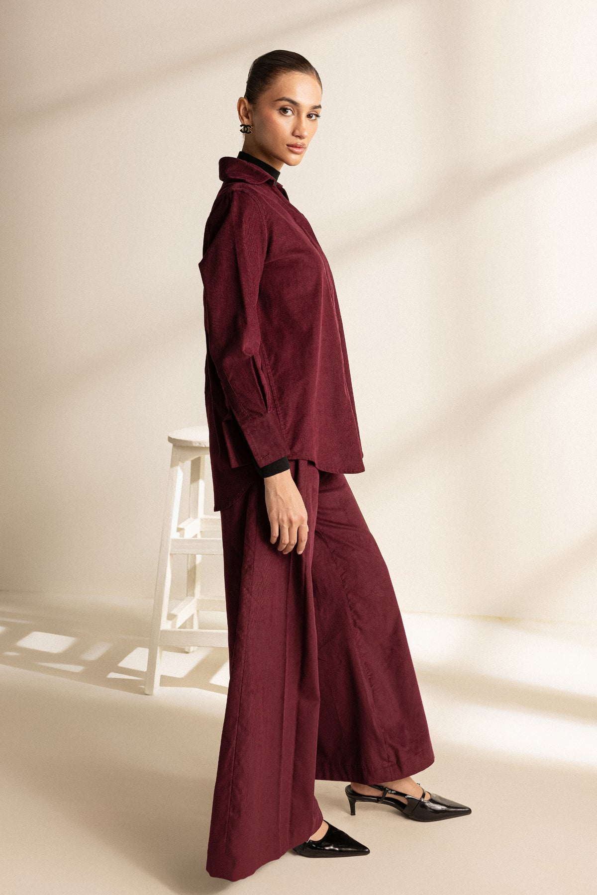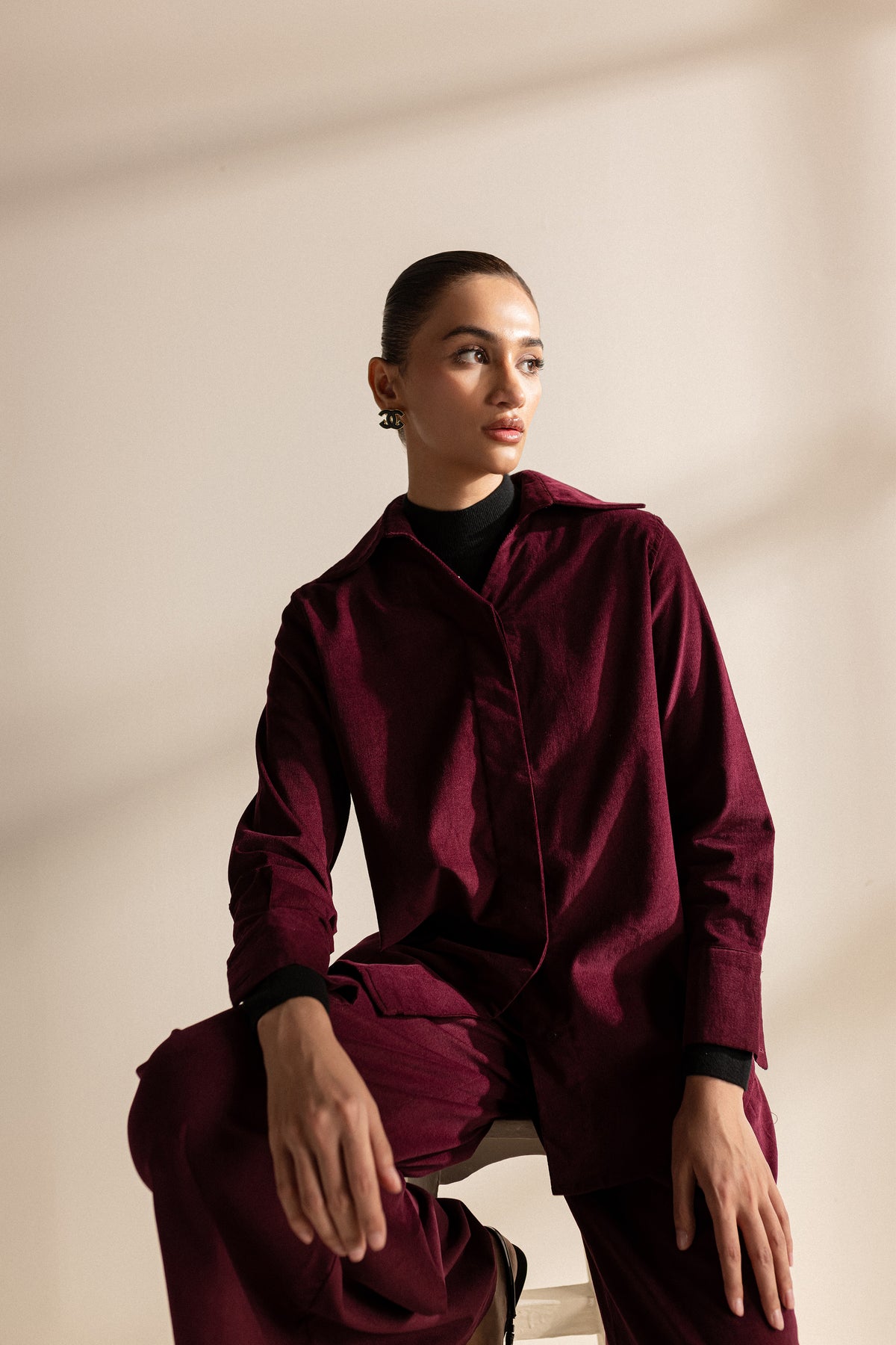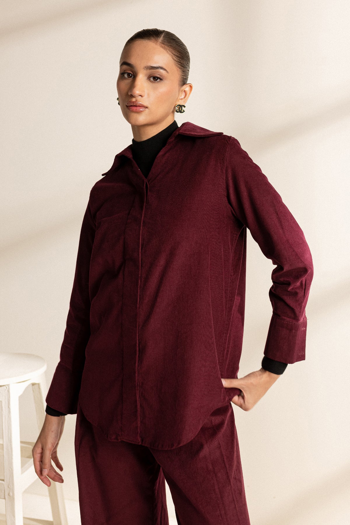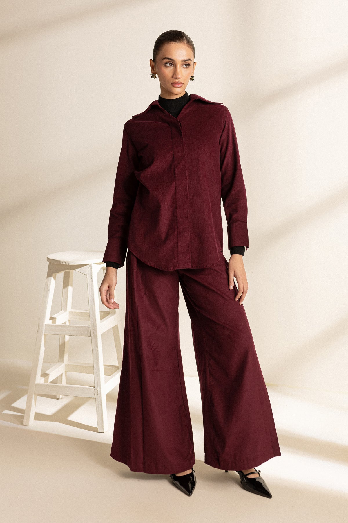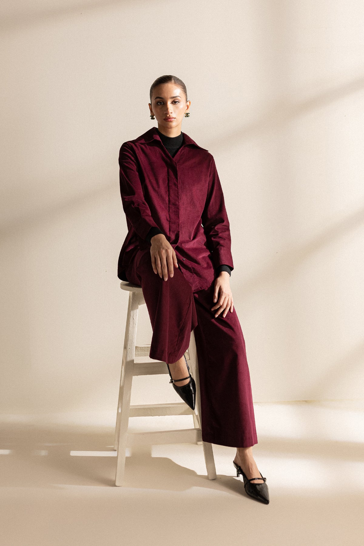 Bold and dramatic, the burgundy corduroy set is designed for those who want to make a statement. The button-down collar shirt is tailored to provide a flattering fit with clean lines while the deep burgundy color adds richness and depth.