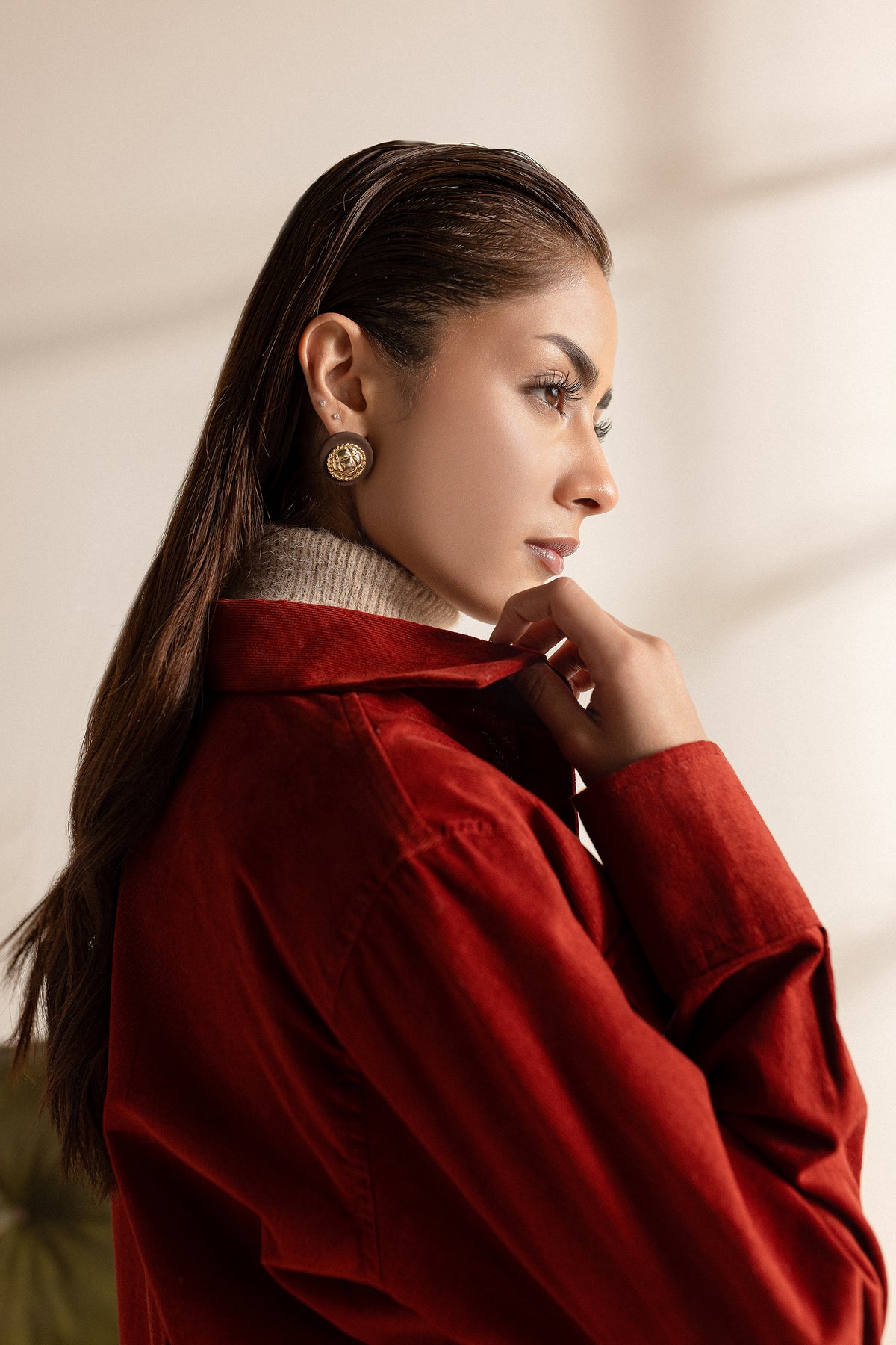In a rich orange color, this corduroy set combines functionality with style. The button-down collar shirt features a structured design with spacious pockets, offering both practicality and a smart, polished look. The shirt’s slightly relaxed fit creates a balanced silhouette, enhanced by the warm, earthy tone of the rust color.
