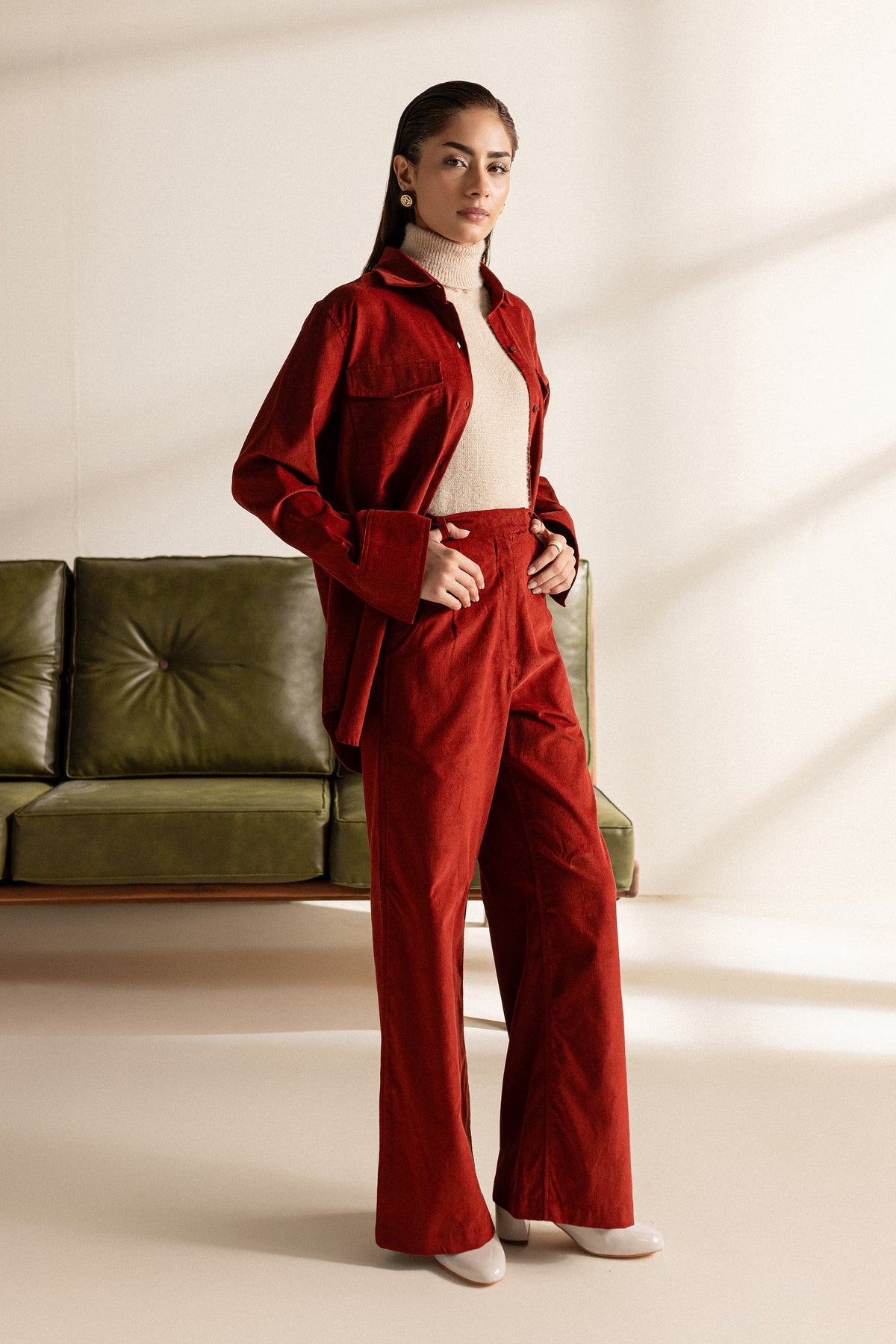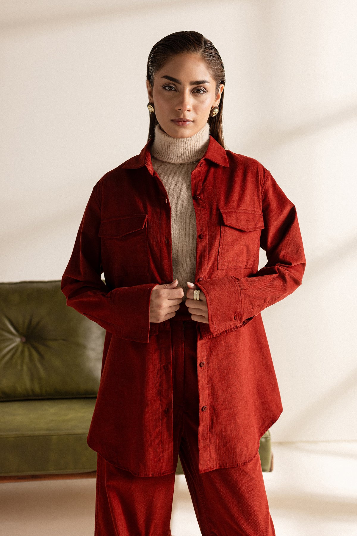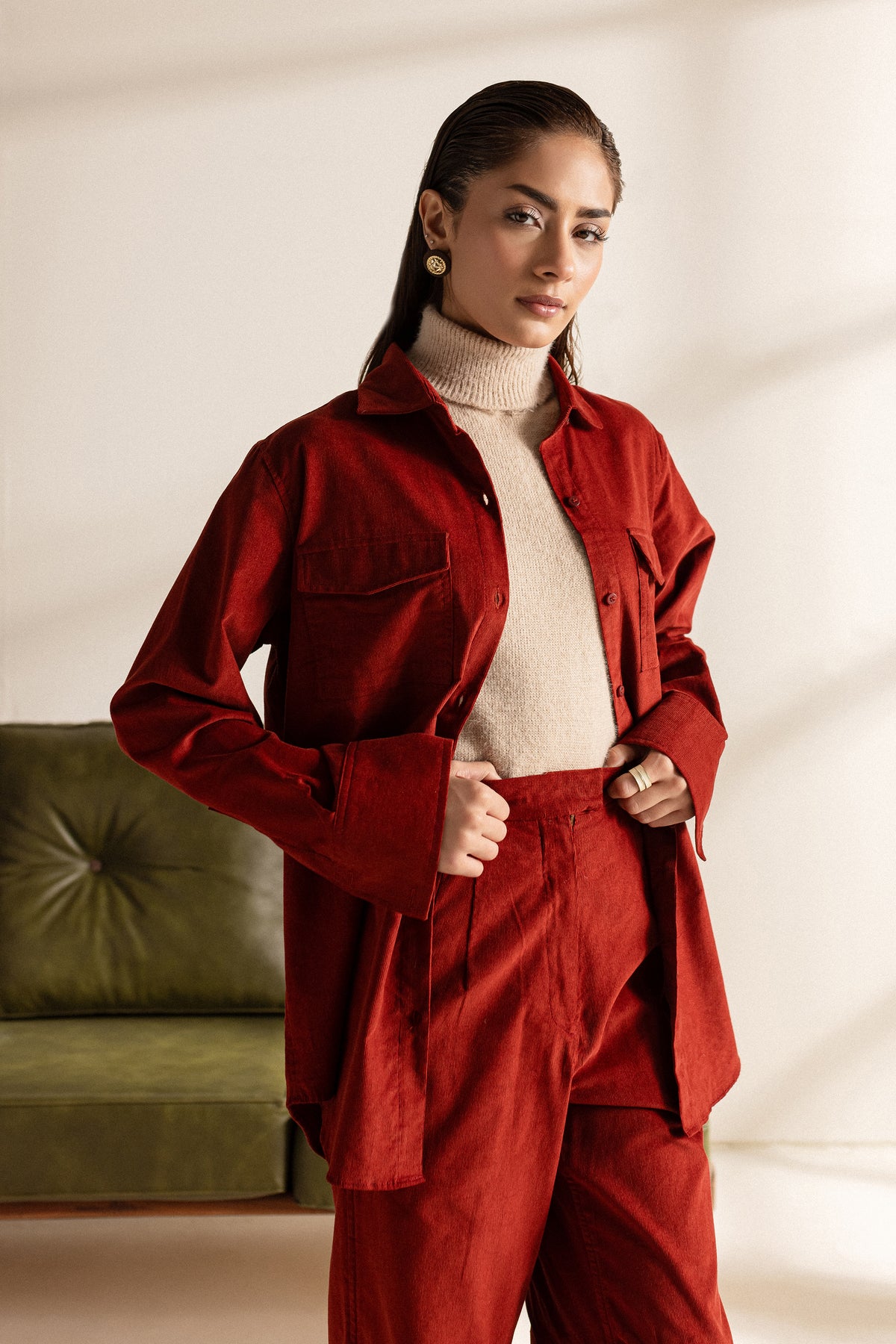 Paired with streamlined corduroy pants, the set delivers a sleek and tailored finish that’s perfect for everyday wear. The pants are fitted and streamlined, creating a smooth silhouette that complements the shirt’s relaxed structure making this set an ideal blend of comfort and sophistication.