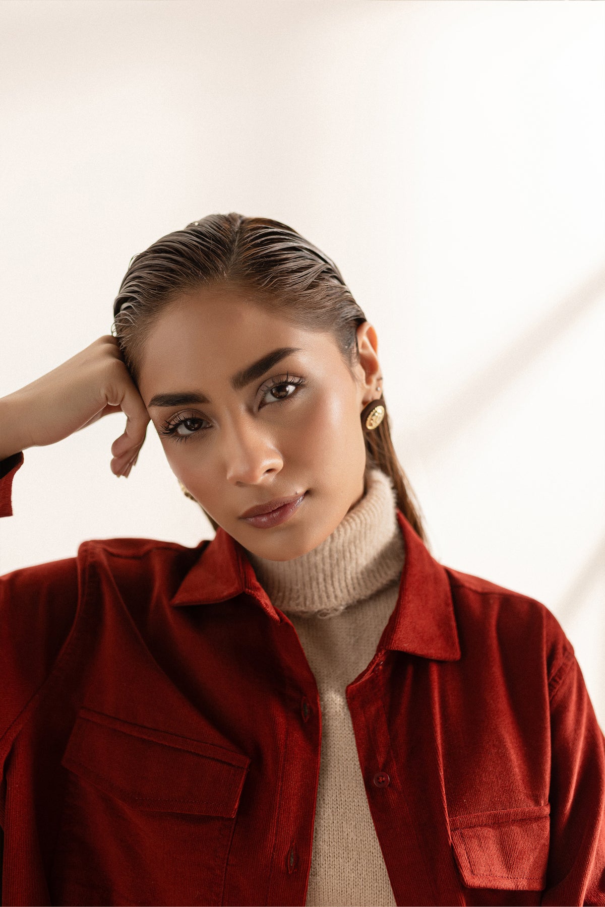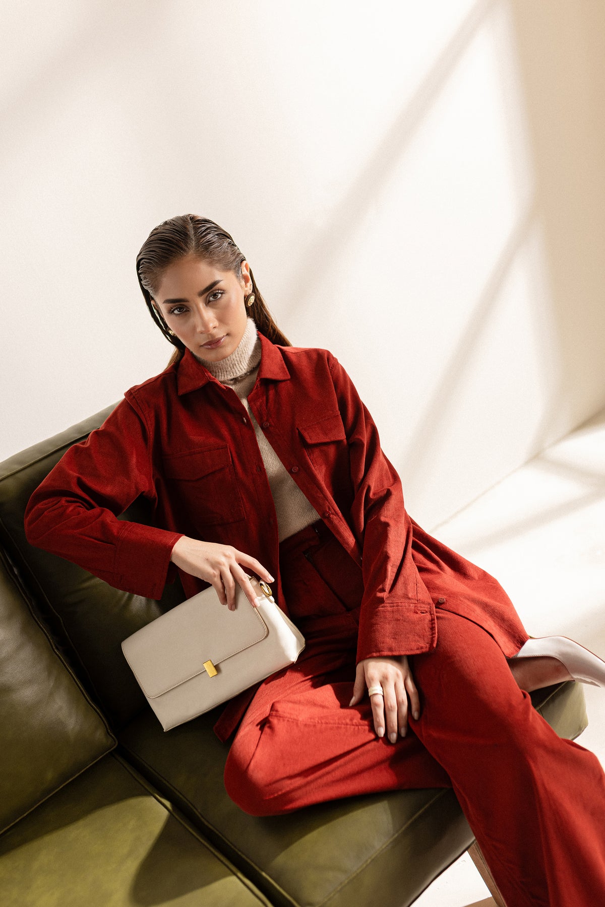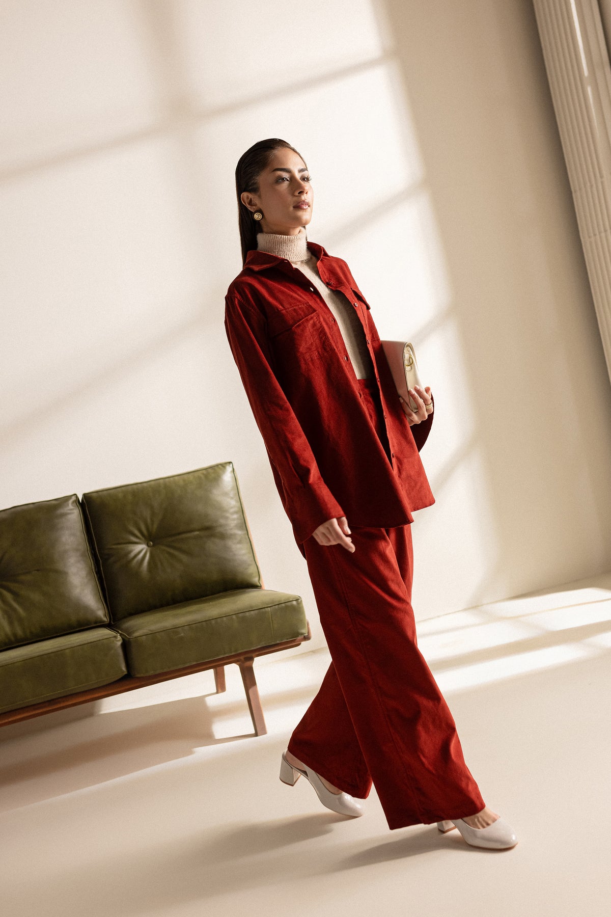 Paired with streamlined corduroy pants, the set delivers a sleek and tailored finish that’s perfect for everyday wear. The pants are fitted and streamlined, creating a smooth silhouette that complements the shirt’s relaxed structure making this set an ideal blend of comfort and sophistication.
