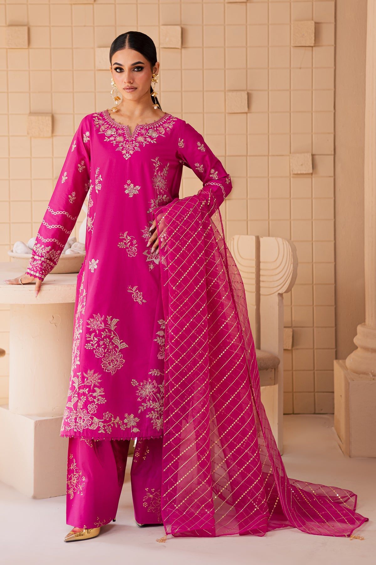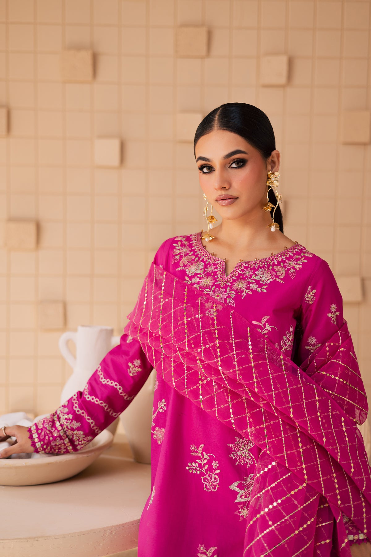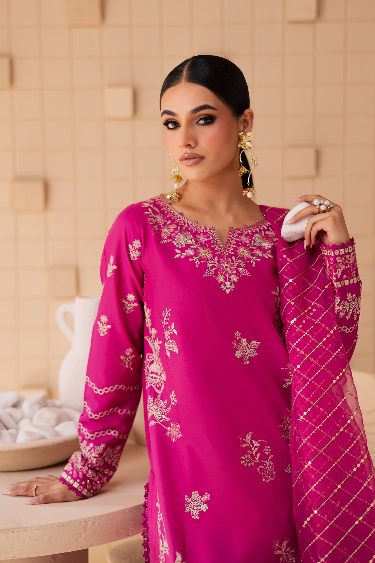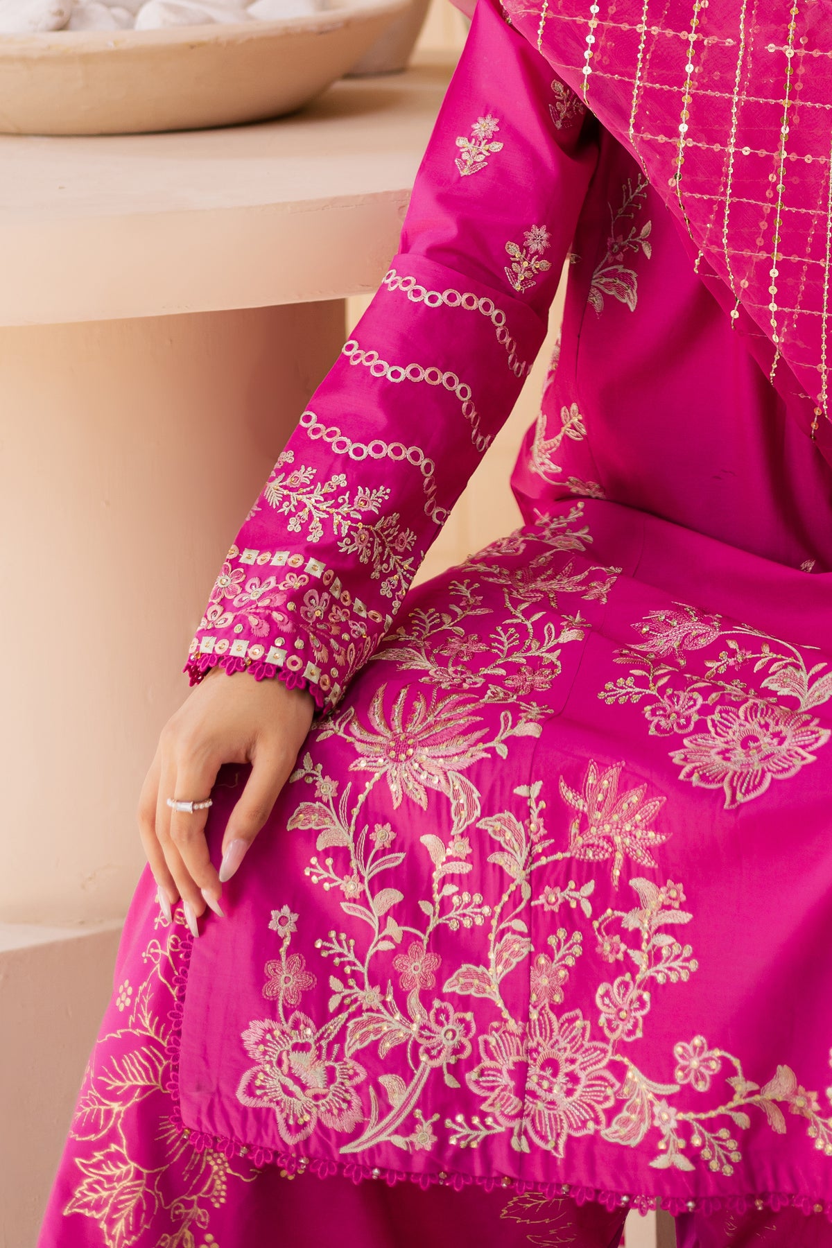 A hot pink panelled pima lawn shirt crafted from premium pima fabric, featuring all-over embroidery on the shirt and sleeves. The design is beautifully accented with lace and crystal detailing along the sleeve hems, neckline, and shirt hem—bringing a perfect balance of sparkle and sophistication.