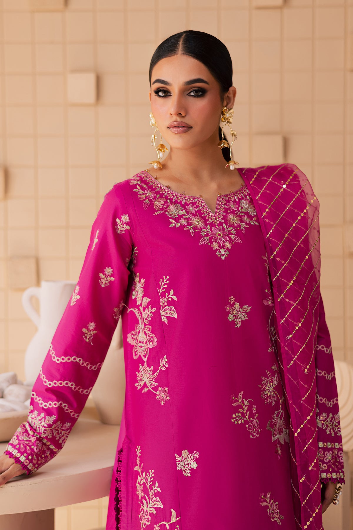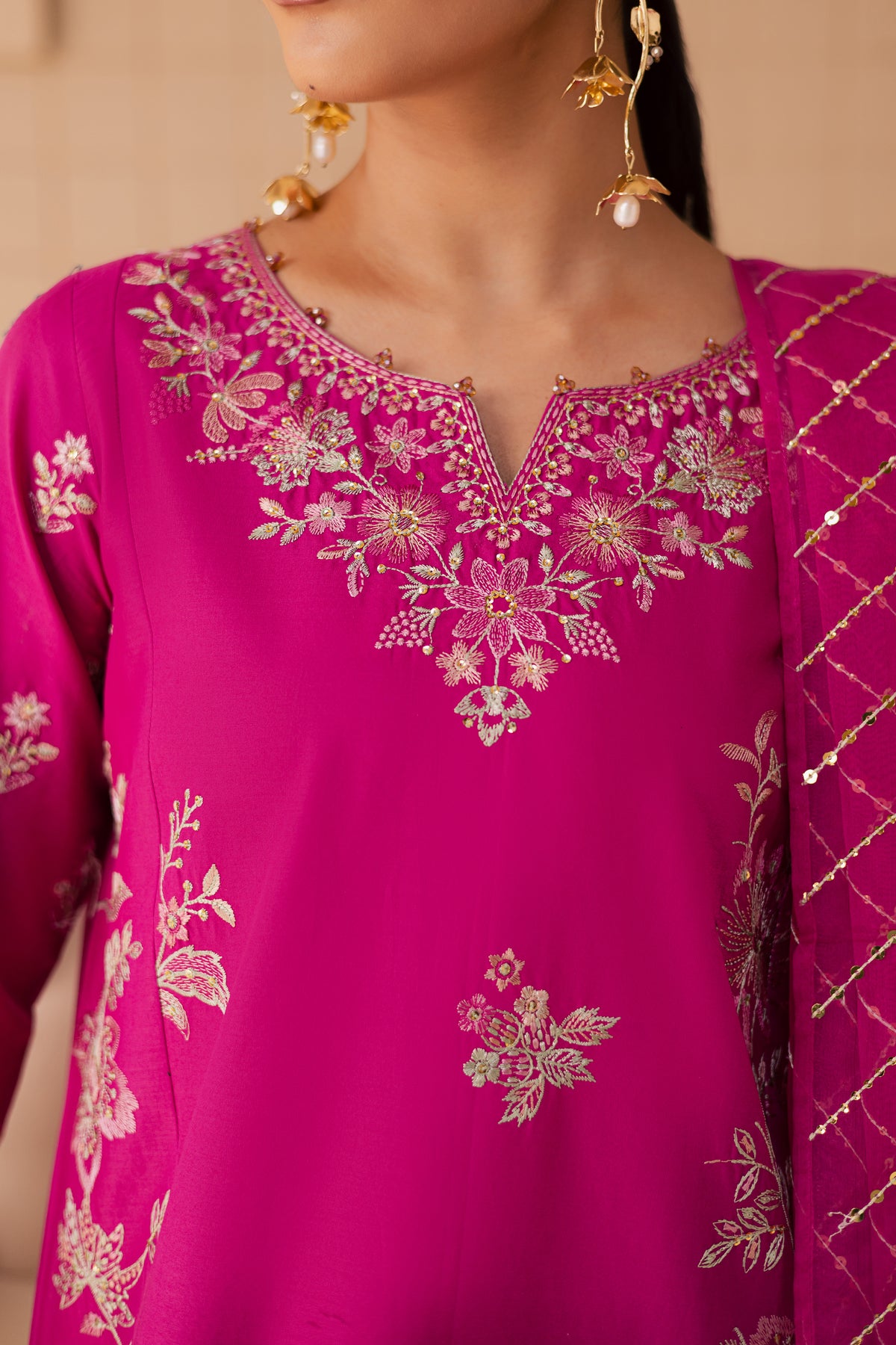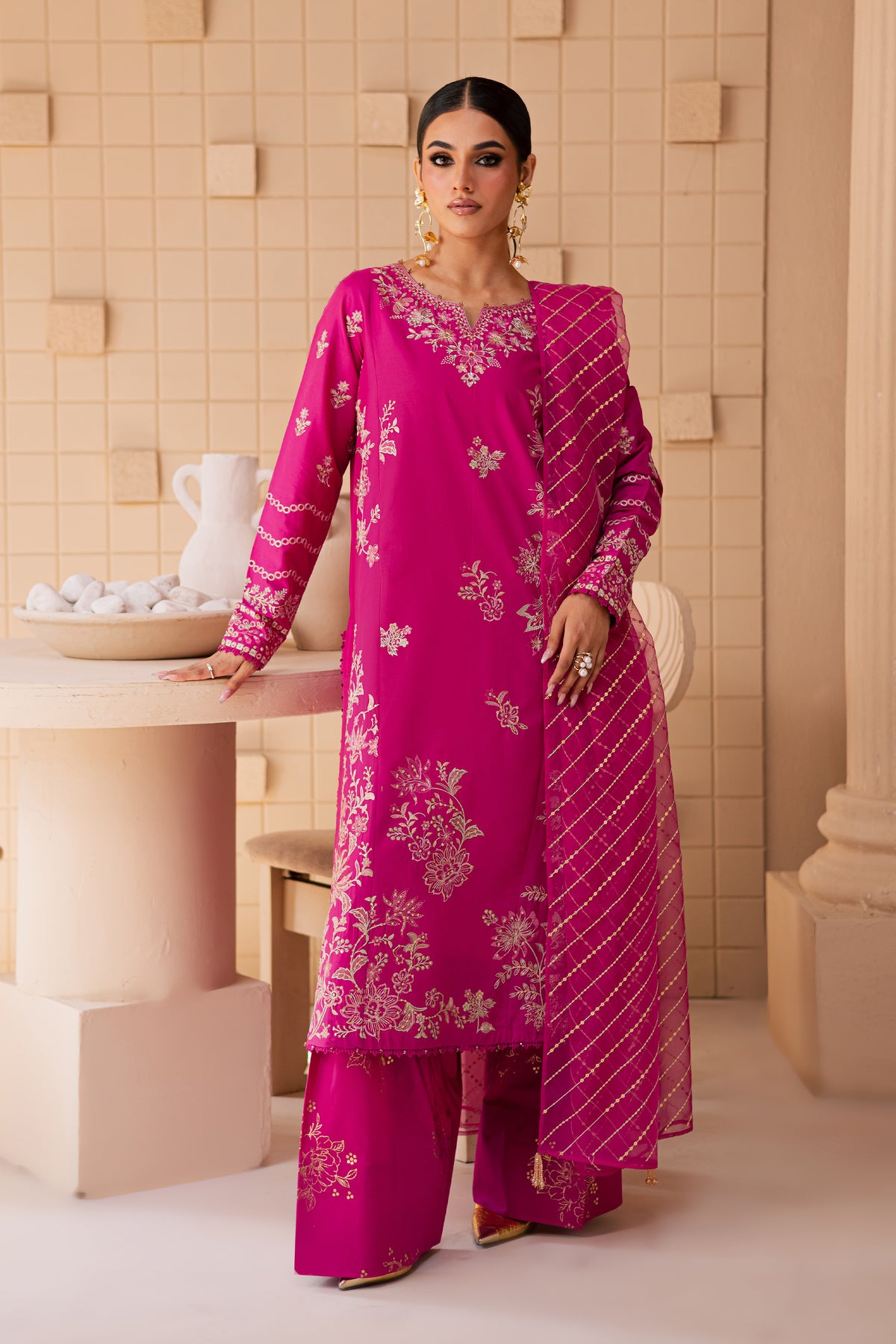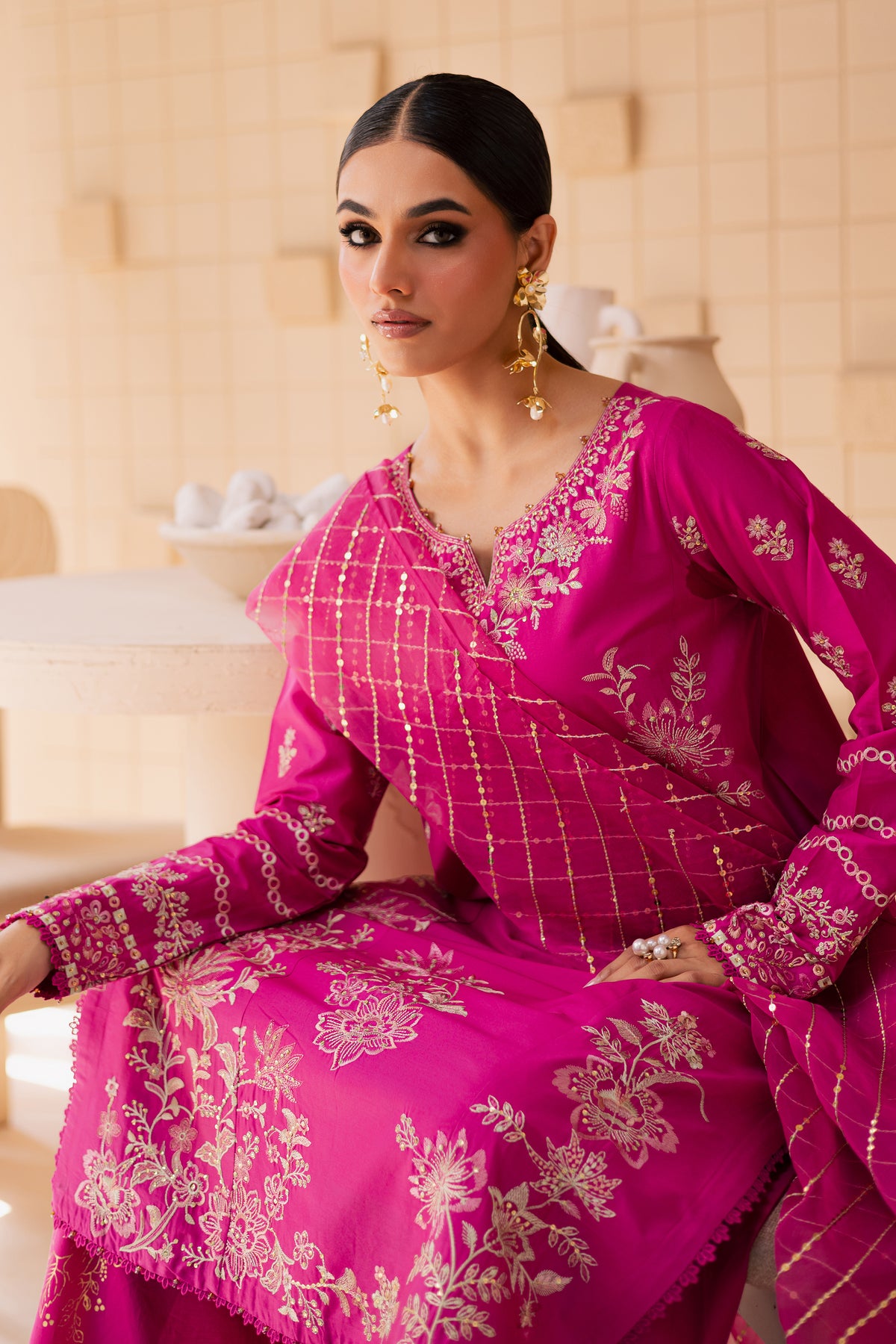 A hot pink panelled pima lawn shirt crafted from premium pima fabric, featuring all-over embroidery on the shirt and sleeves. The design is beautifully accented with lace and crystal detailing along the sleeve hems, neckline, and shirt hem—bringing a perfect balance of sparkle and sophistication.