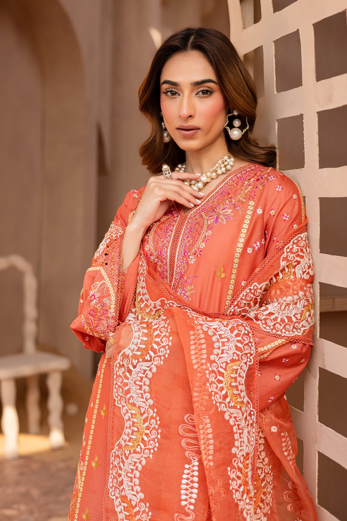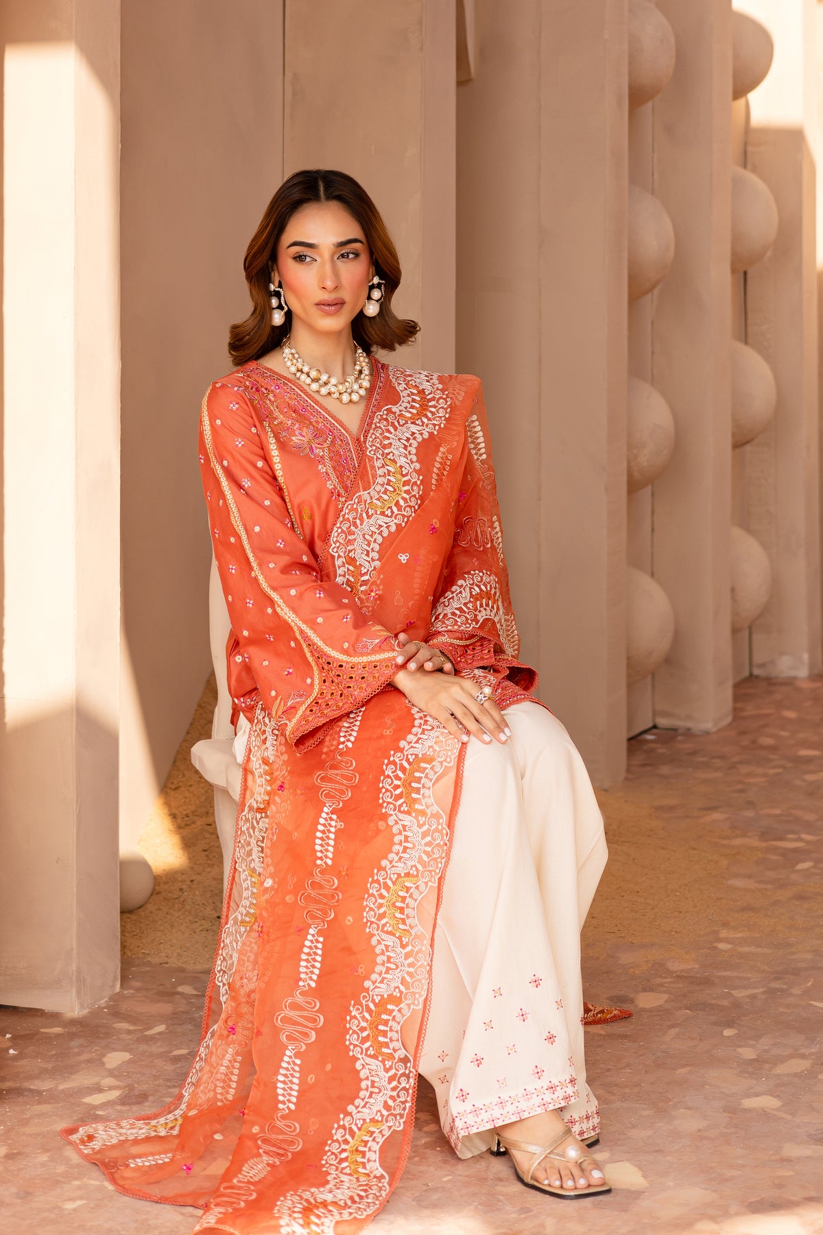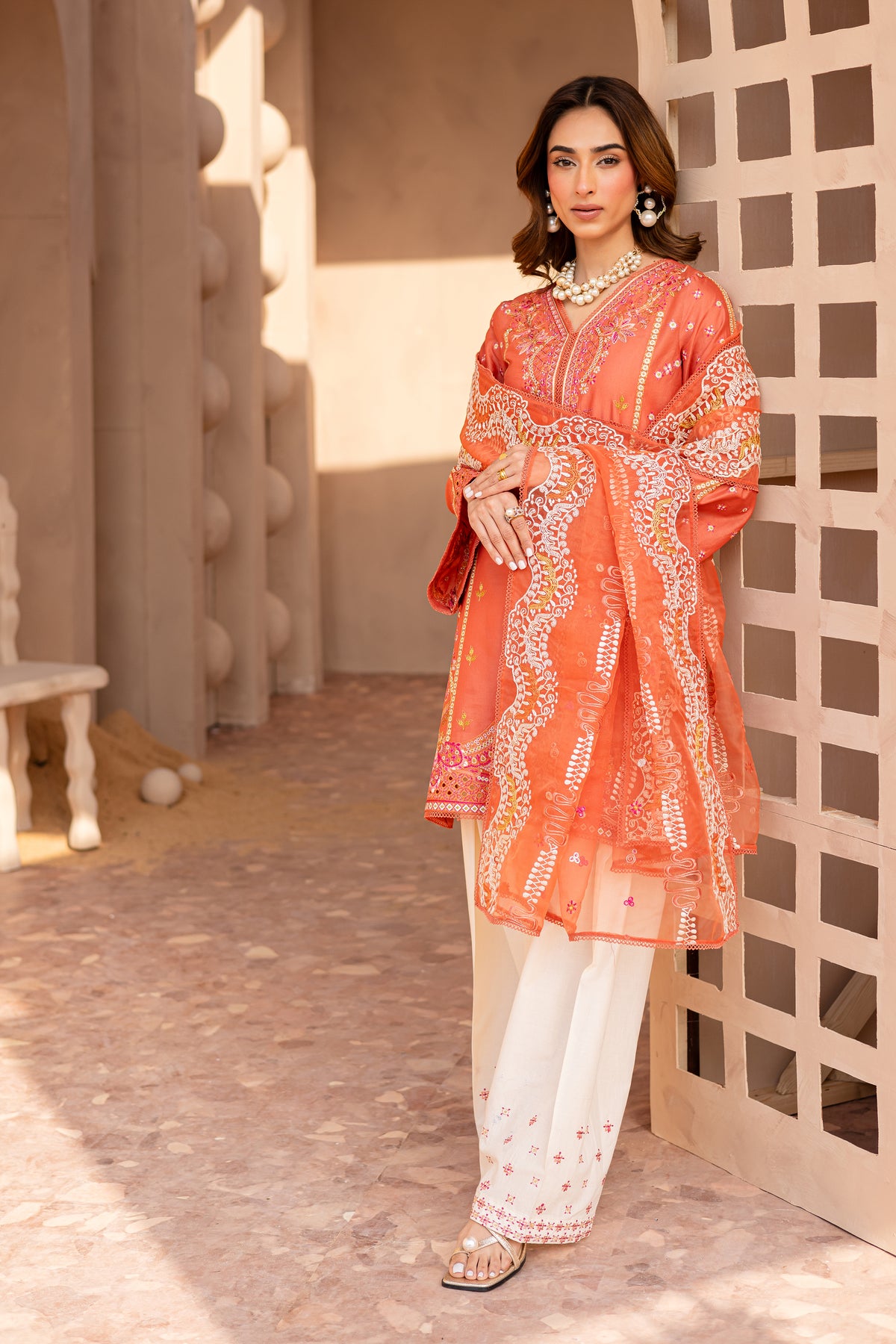 The look is further elevated with a coral organza dupatta, showcasing statement embroidery that makes a stunning, eye-catching statement. This ensemble combines classic charm with modern sophistication for a refined, timeless appeal.