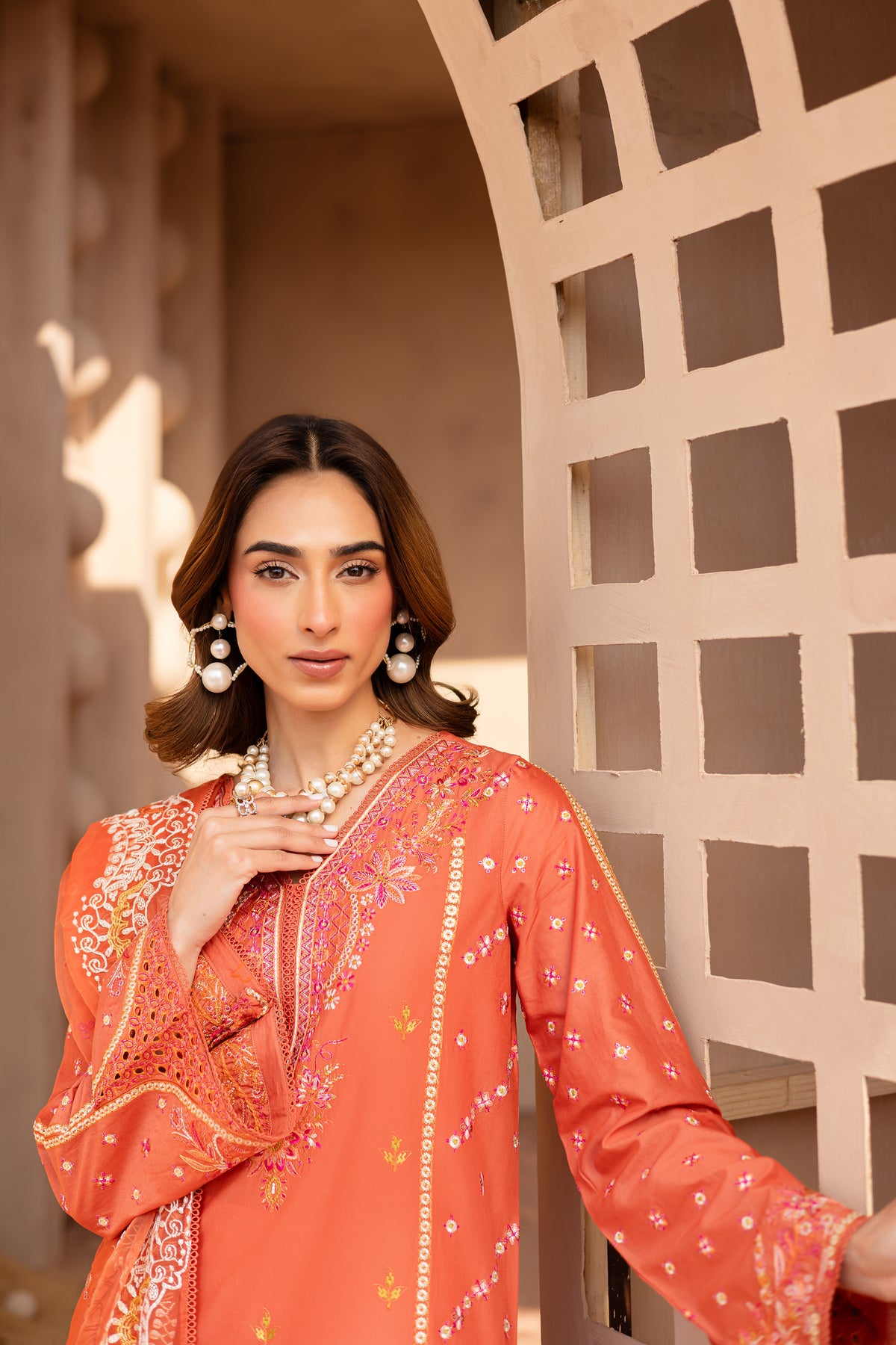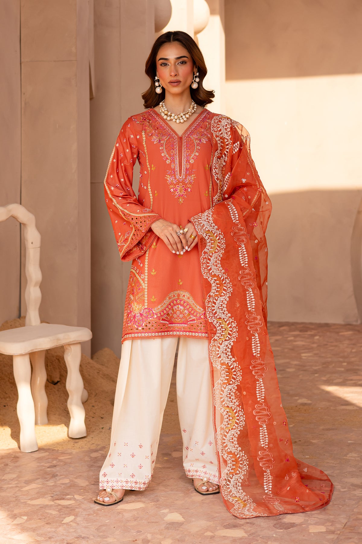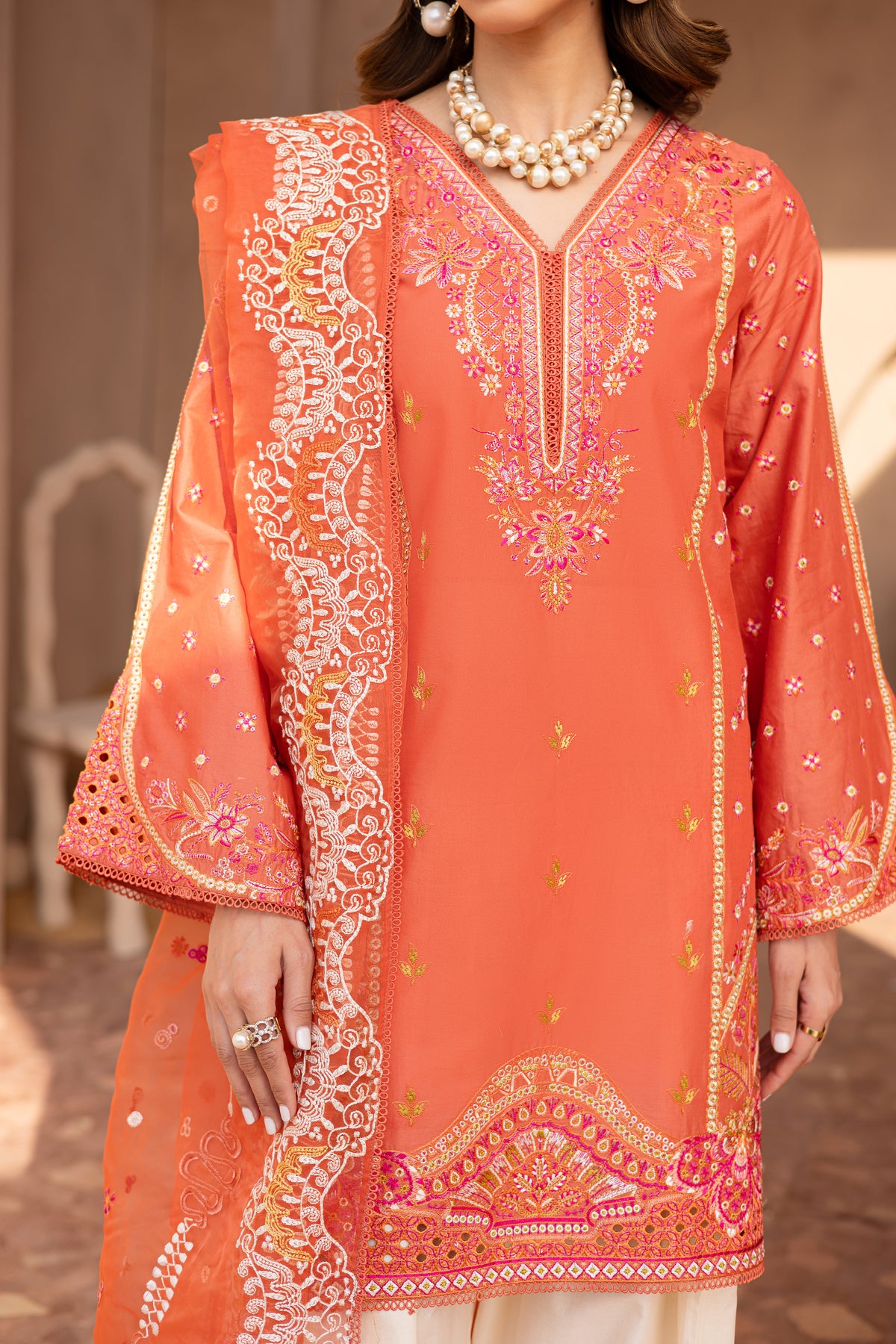 The look is further elevated with a coral organza dupatta, showcasing statement embroidery that makes a stunning, eye-catching statement. This ensemble combines classic charm with modern sophistication for a refined, timeless appeal.