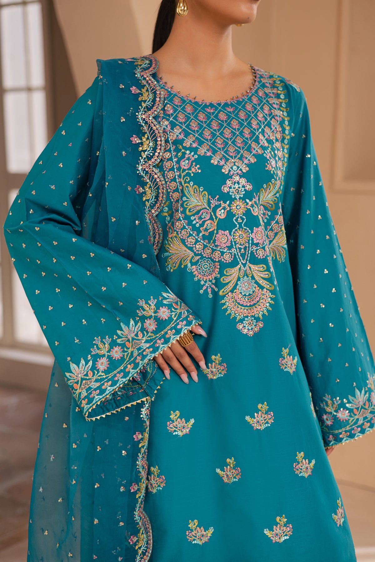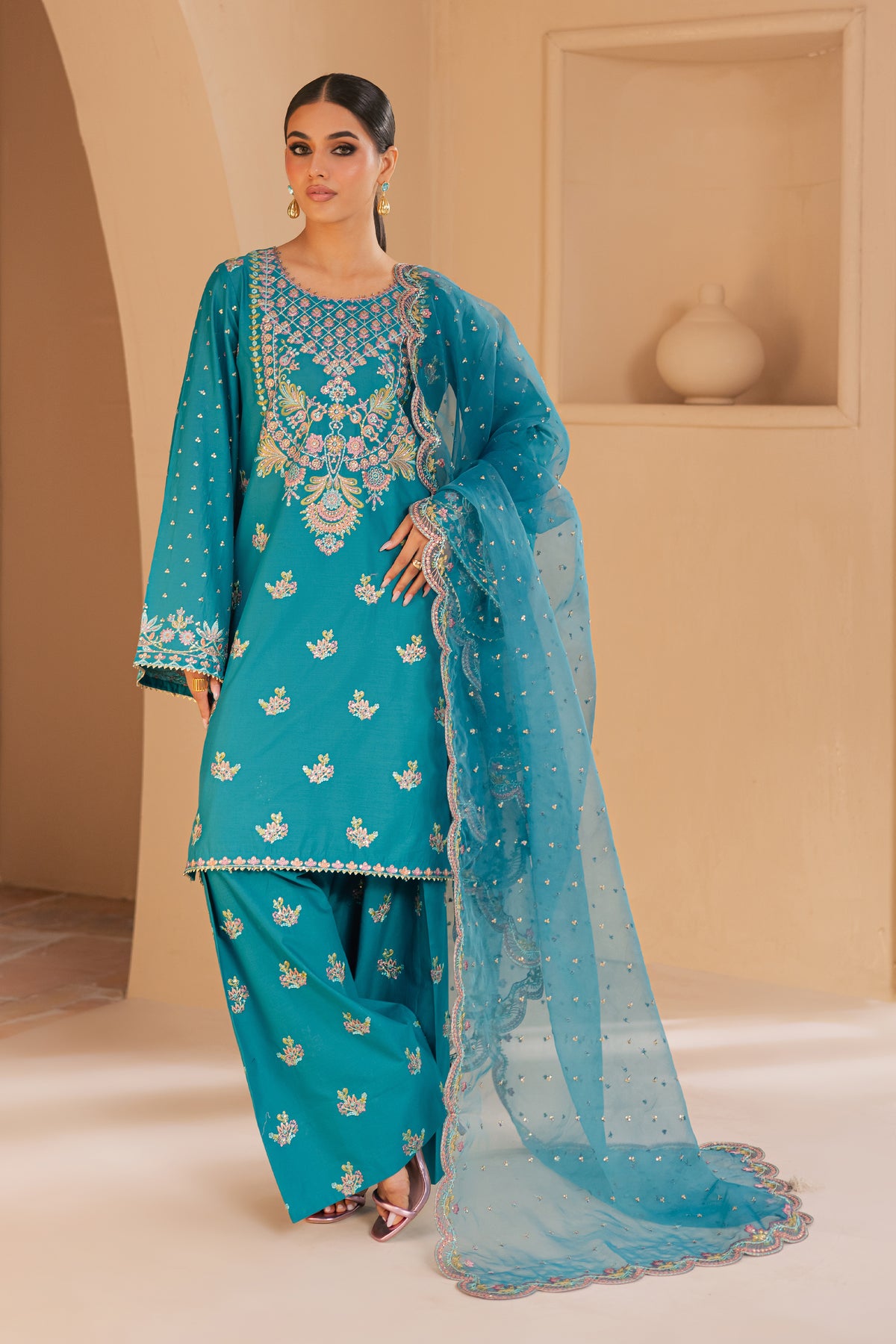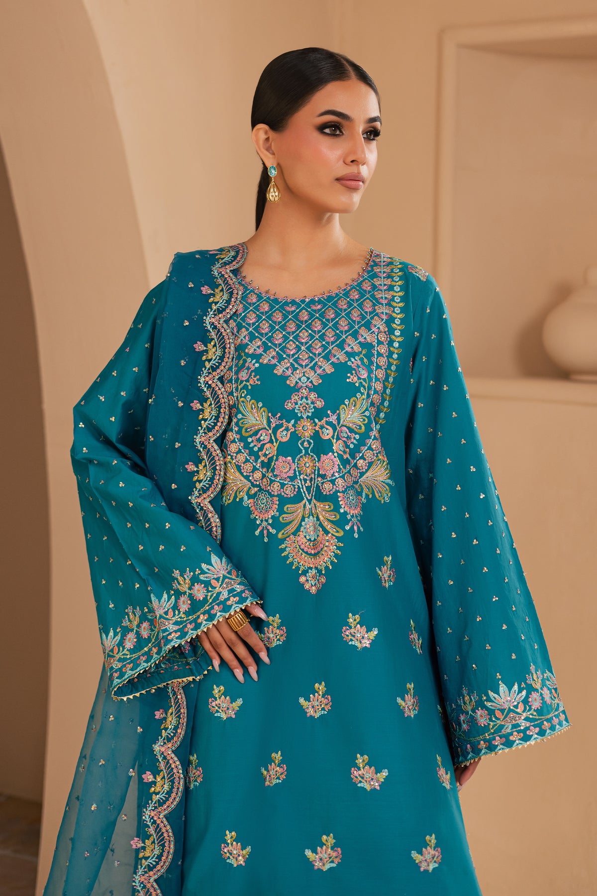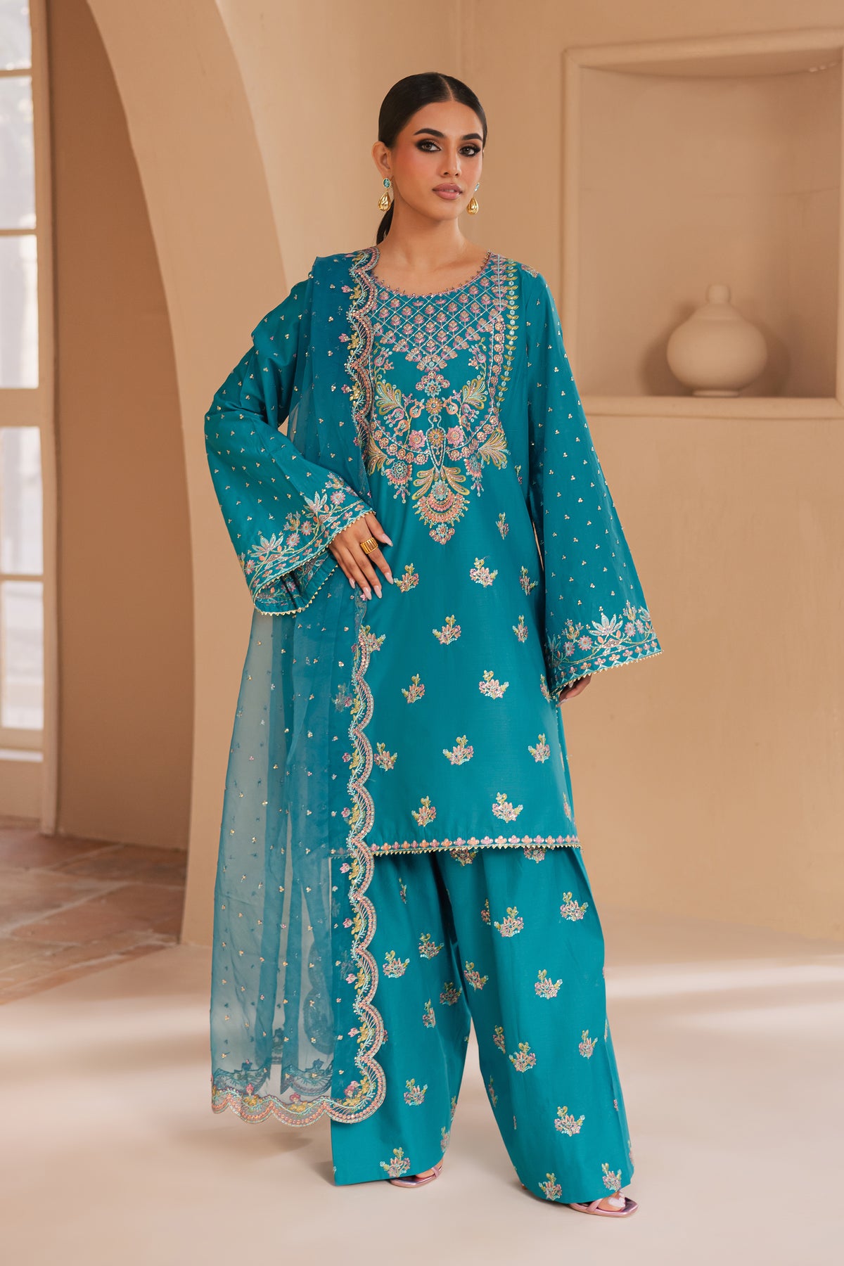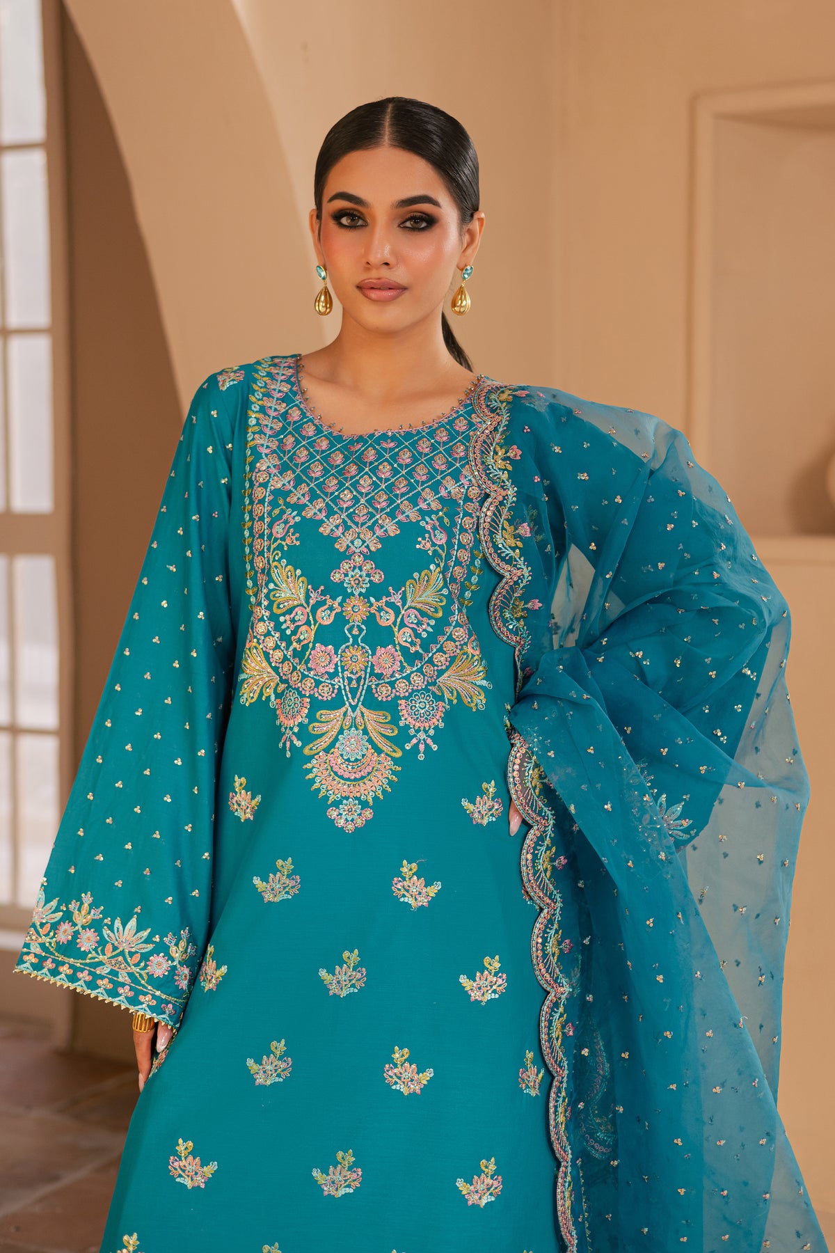 A rich teal pima lawn shirt fully embroidered with colorful threads and soft sequin accents, creating a festive and vibrant look. The design features a round neckline adorned with pearl detailing, relaxed sleeves, and golden tilla lace finishing along the sleeves and shirt hem - adding a touch of traditional elegance.