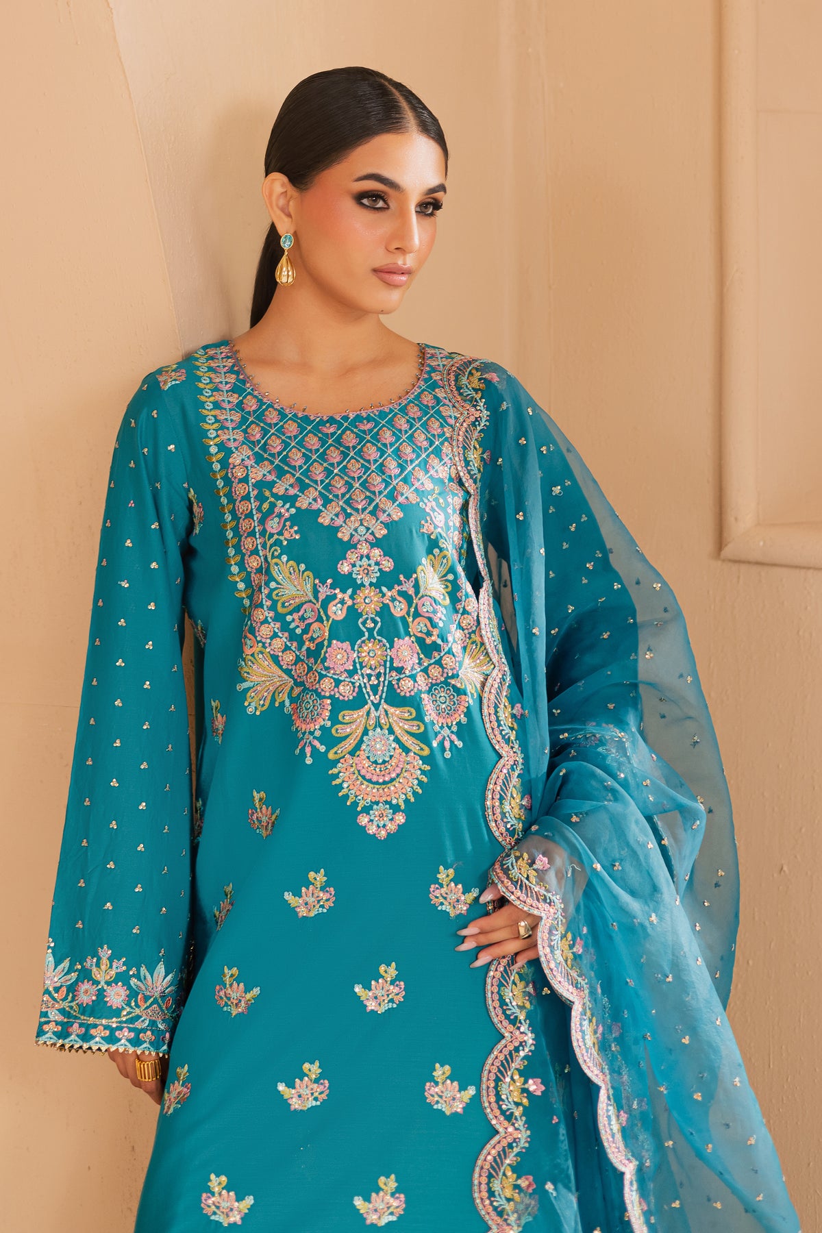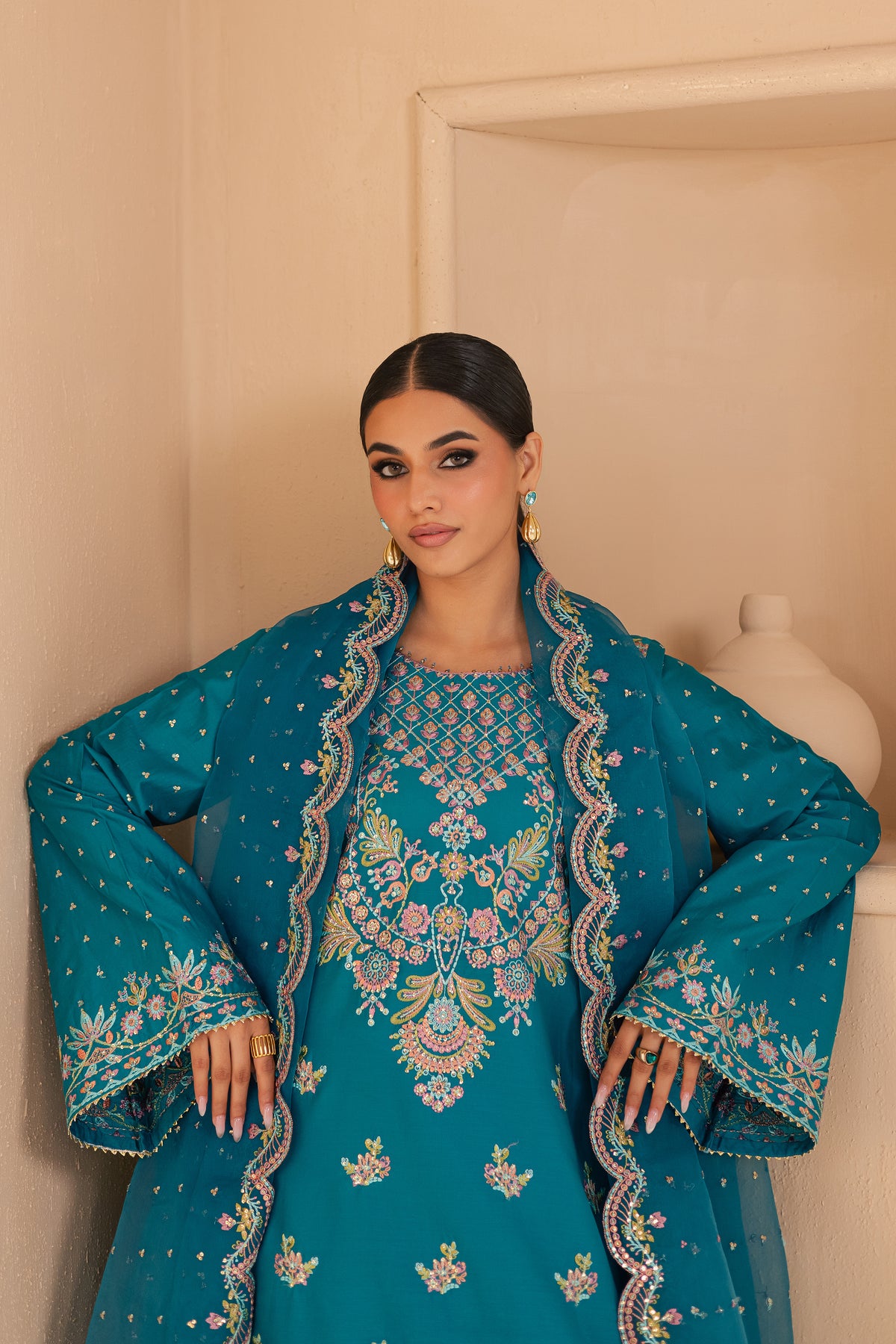 Paired with a classic cambric farshi shalwar, beautifully adorned with all-over floral embroidery that adds volume, movement, and a timeless, traditional flair.