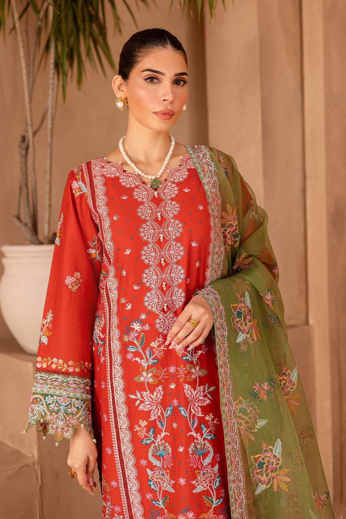 This elegant long, panelled pima lawn deep rust shirt is adorned with intricate embroidery, complemented by contrasting organza borders on the shirt and sleeve hems. The neckline features delicate pearl detailing, further enhanced by ethereal organza petal accents, creating a sophisticated and graceful look.