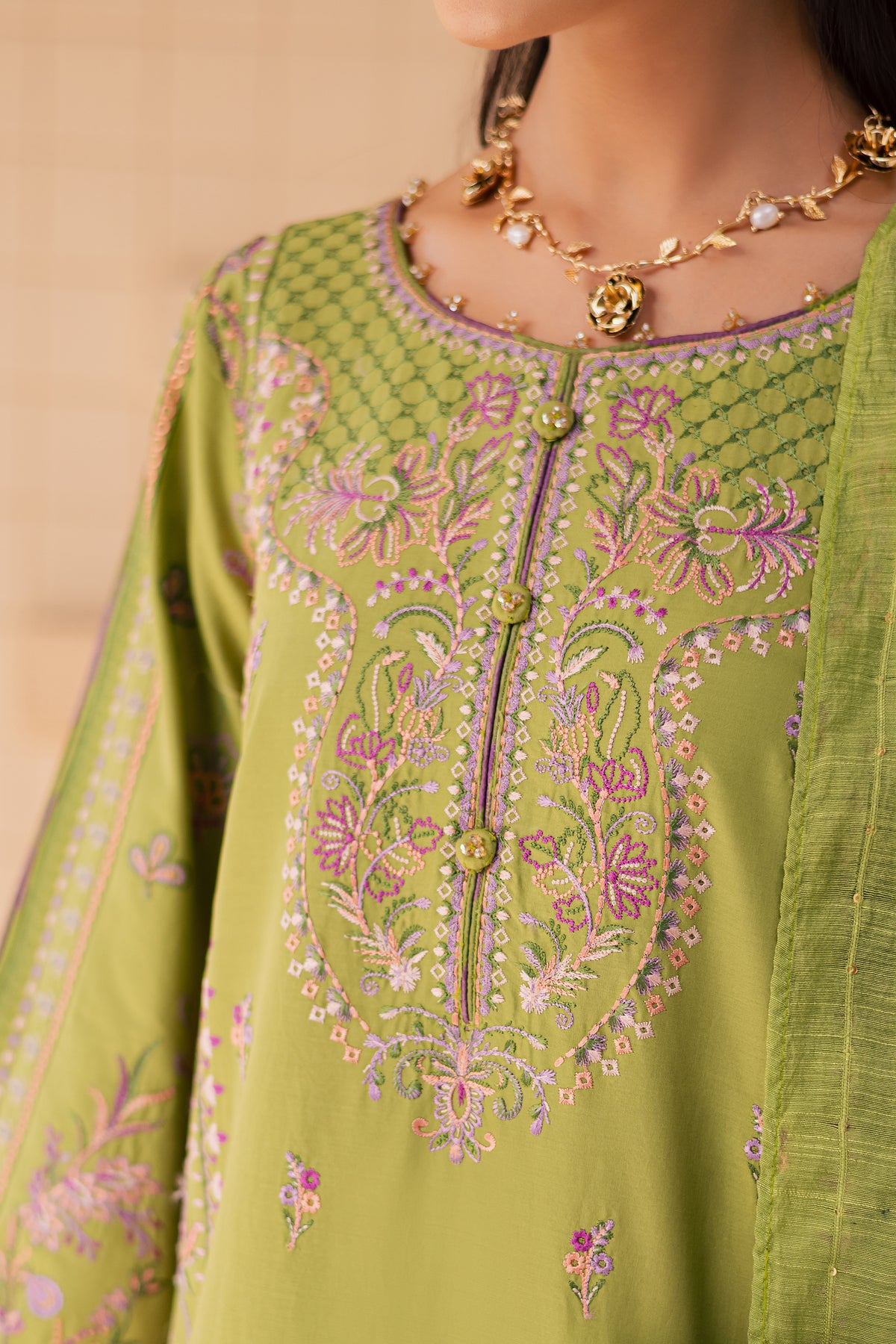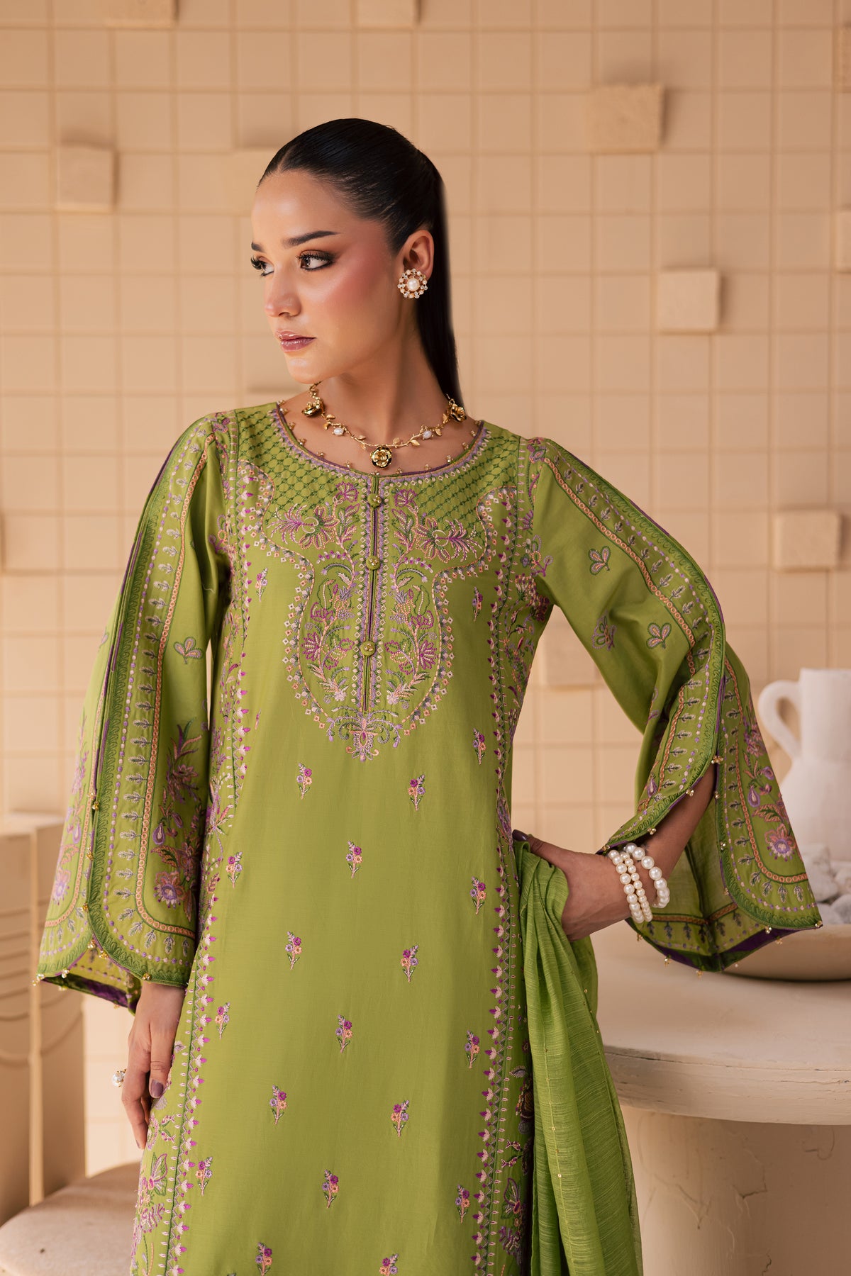 A turtle green panelled pima lawn shirt crafted from premium pima fabric, featuring intricate embroidery and a curved rounded hem sleeve with a subtle slit. The design is elevated with printed piping and organza embroidered borders along the hem, while crystal embellishments add a refined sparkle to the sleeve hem, shirt hem, and neckline.