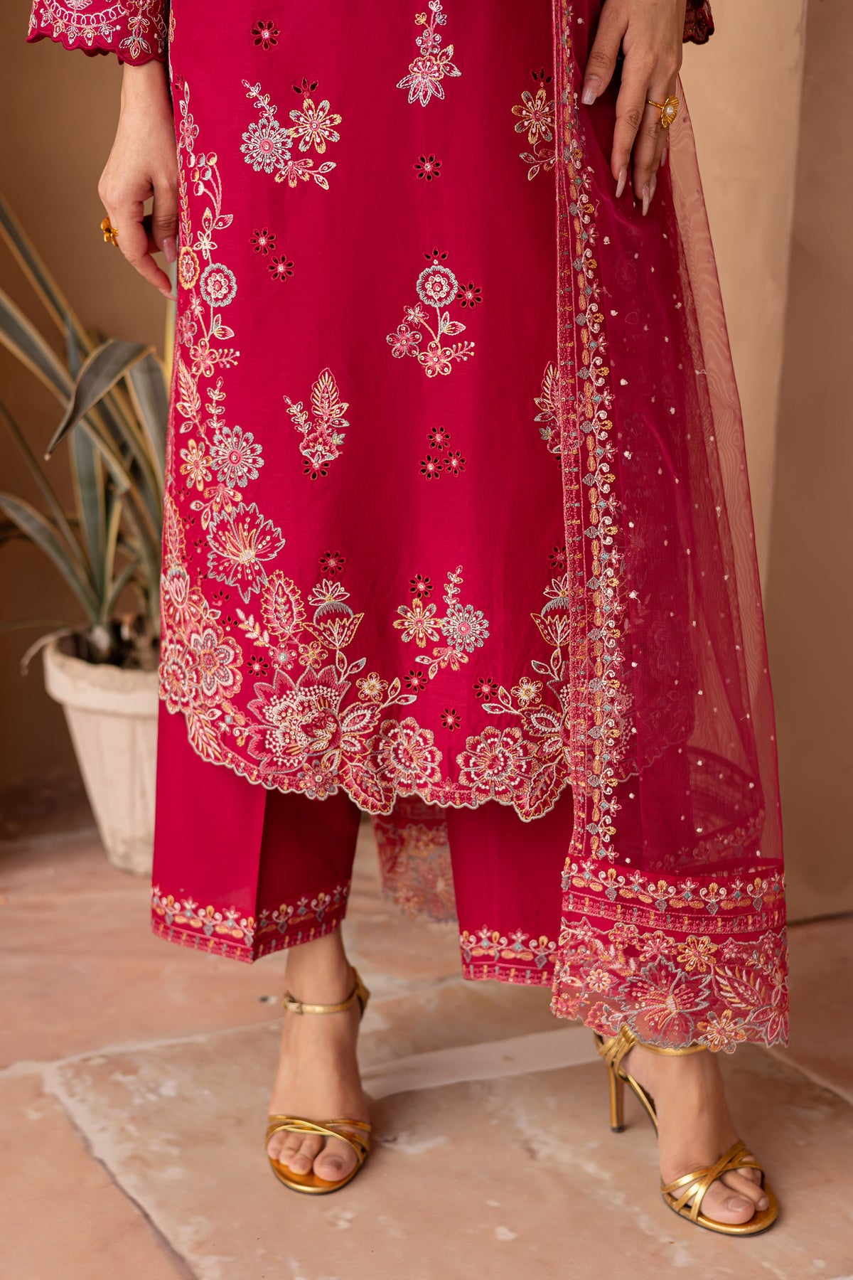This elegant pima lawn pink long shirt features a circular hem with delicate cutwork along the edges, adding a unique touch to its design. The shirt is adorned with a heavily embroidered neckline and sleeves, with intricate bowring detailing that enhances its charm.