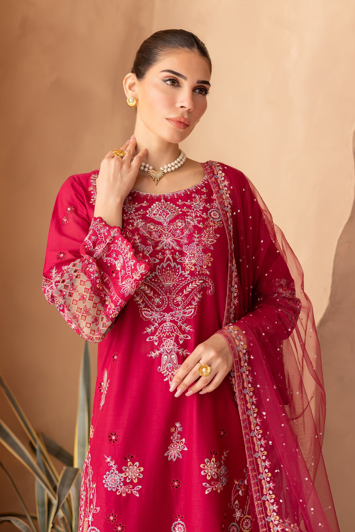 The look is completed with a heavily embroidered net dupatta, which adds a layer of sophistication and elegance, perfectly complementing the intricate work on the shirt and sleeves.