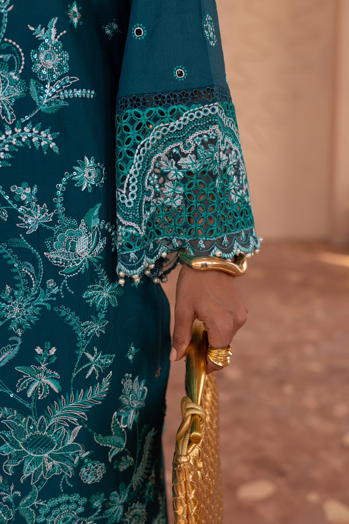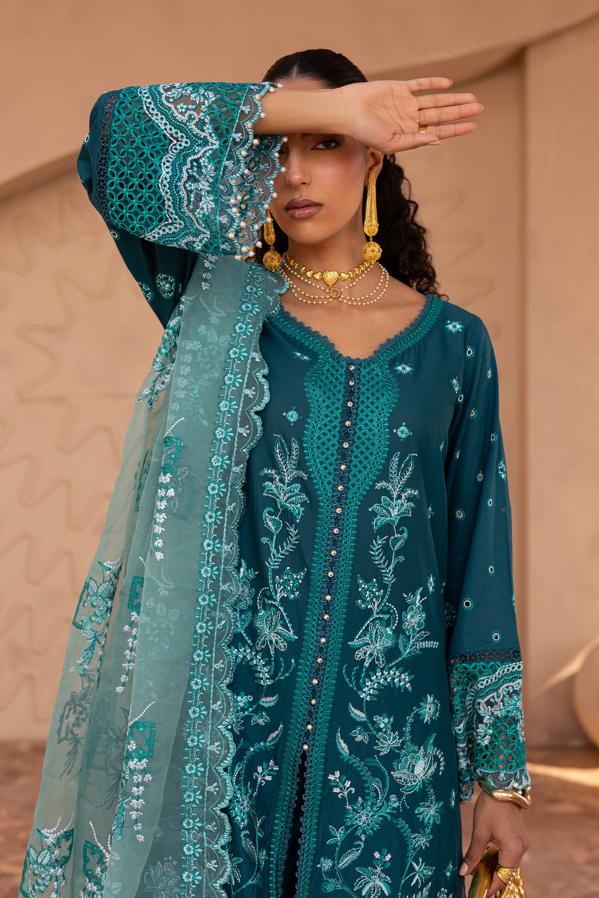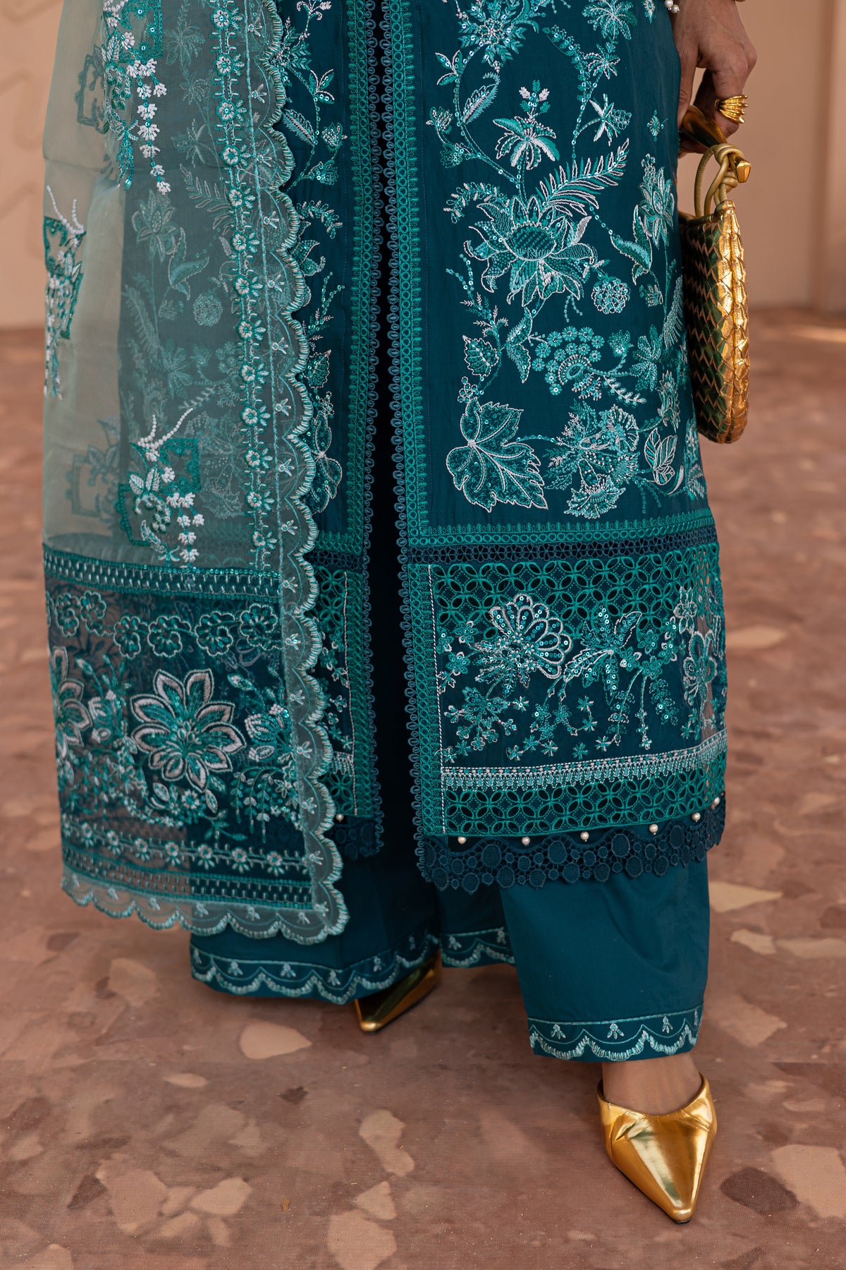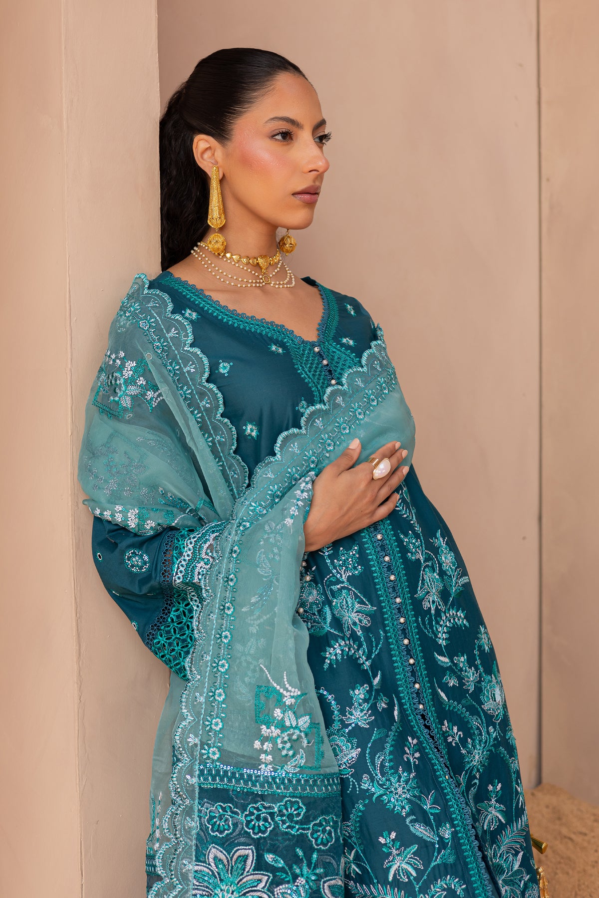 The ensemble is complemented by a contrasting embroidered organza dupatta, designed with accent pallus that add movement and dimension.