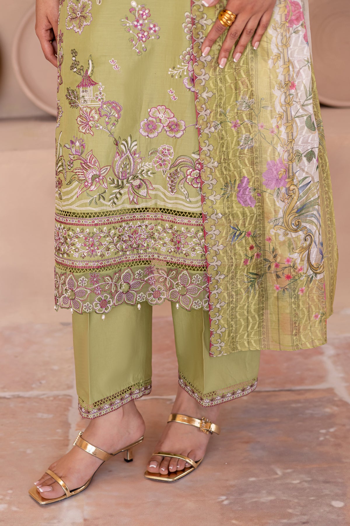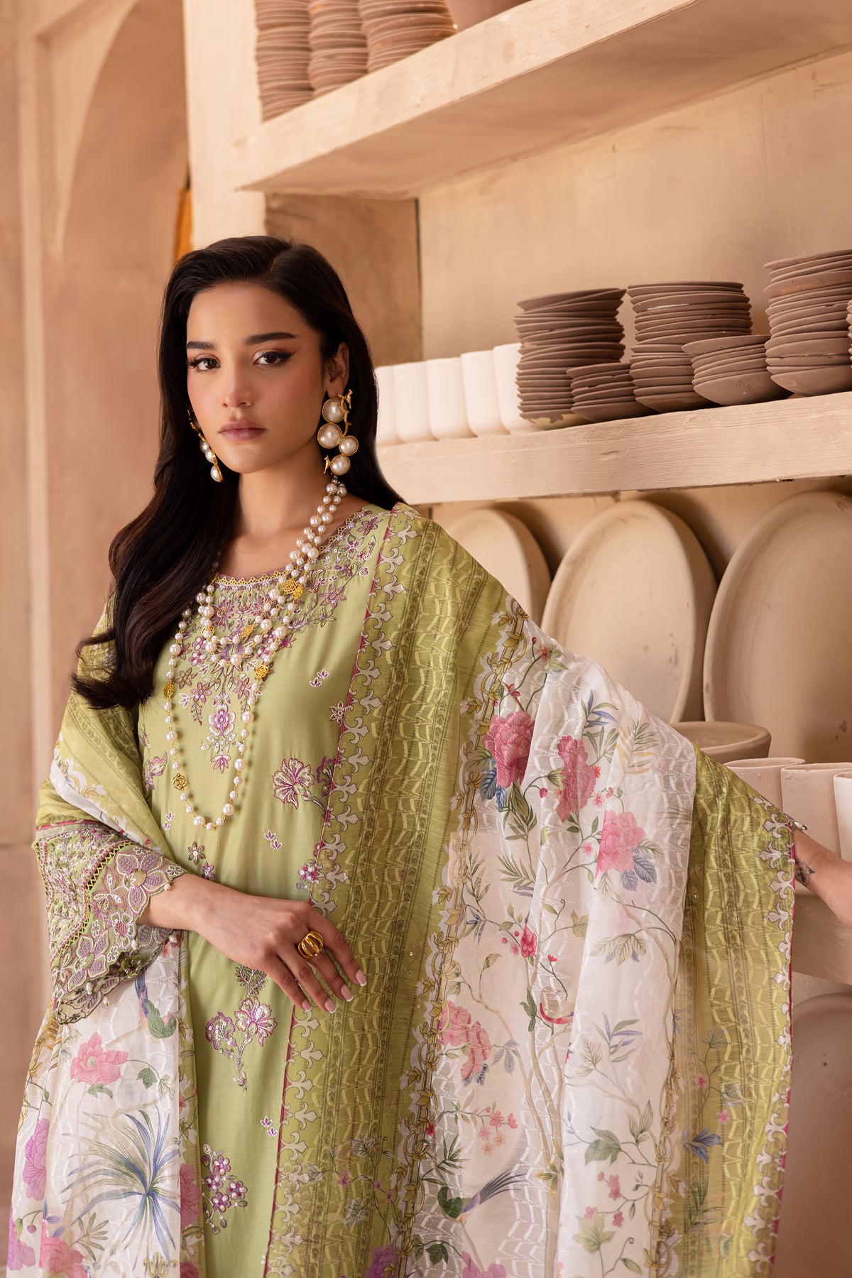 The ensemble is completed with a digitally printed dupatta, adding a modern flair and perfectly balancing the traditional embroidery with contemporary design elements.