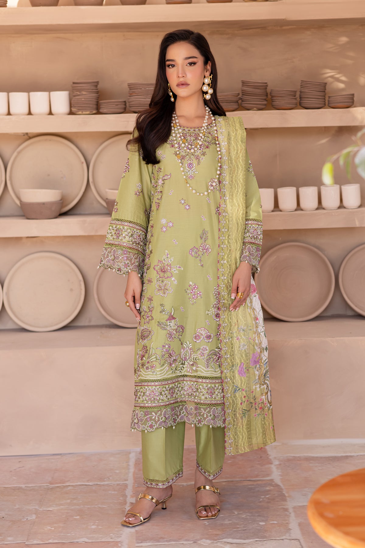 This straight mid-length pima lawn paneled shirt features a composed embroidered front and side panels, enhanced with organza embroidered borders finished with kawya detailing and hanging beads for a unique touch. The embroidered sleeves are complemented by delicate organza borders, adding an elegant finish to the design.