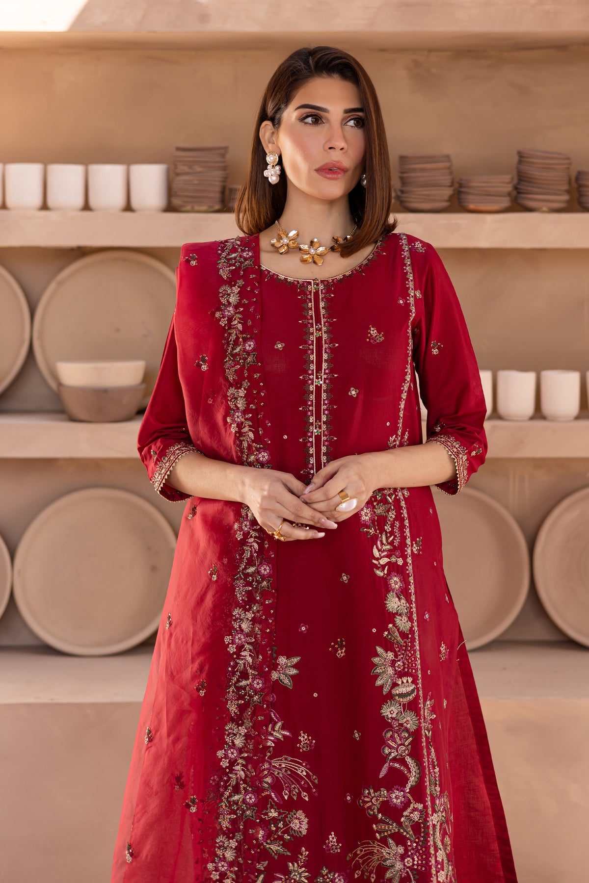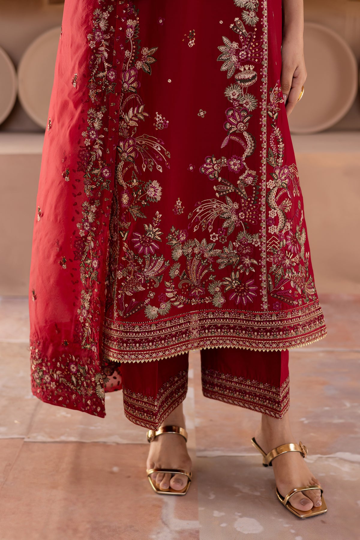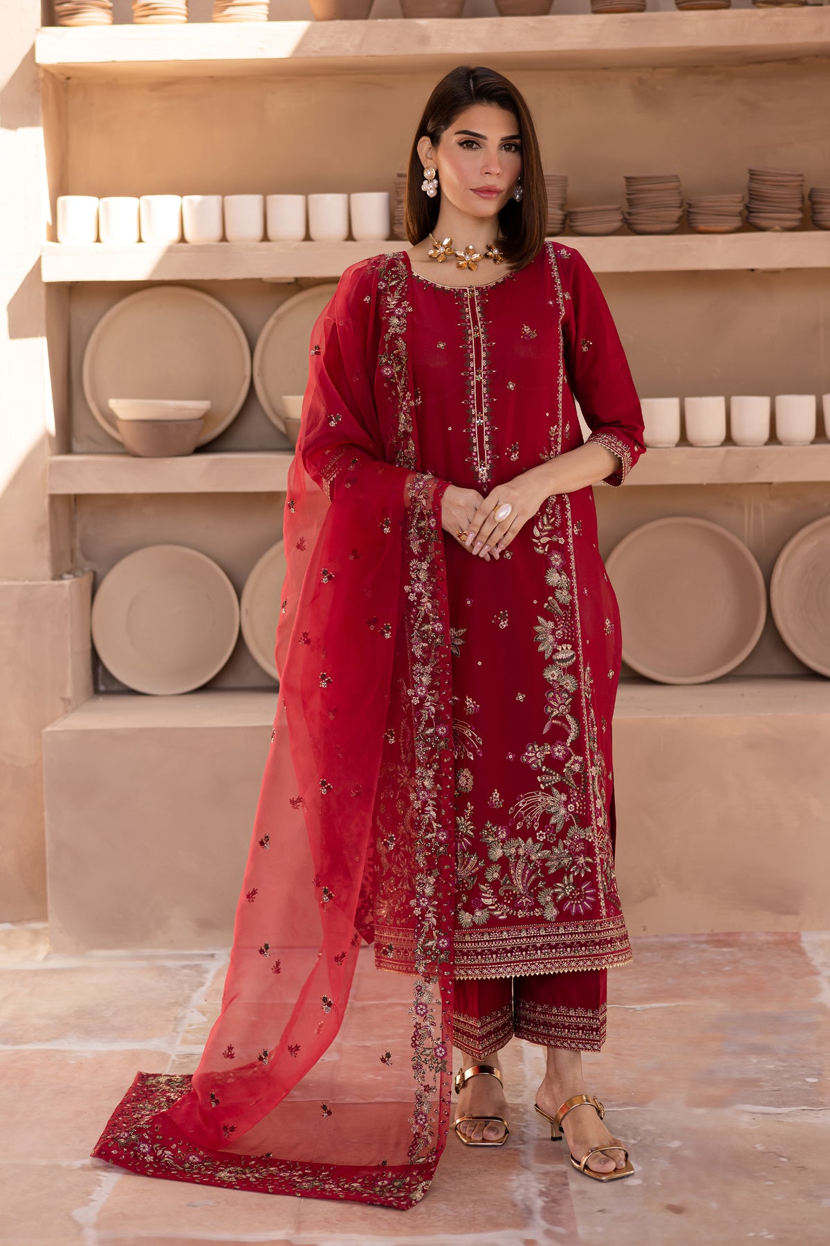To complete the outfit, cambric wide embroidered culottes offer a comfortable yet stylish silhouette, perfectly complementing the detailed shirt and dupatta for a modern, elegant appearance.