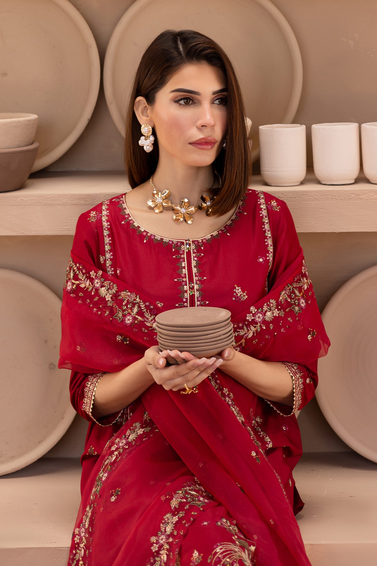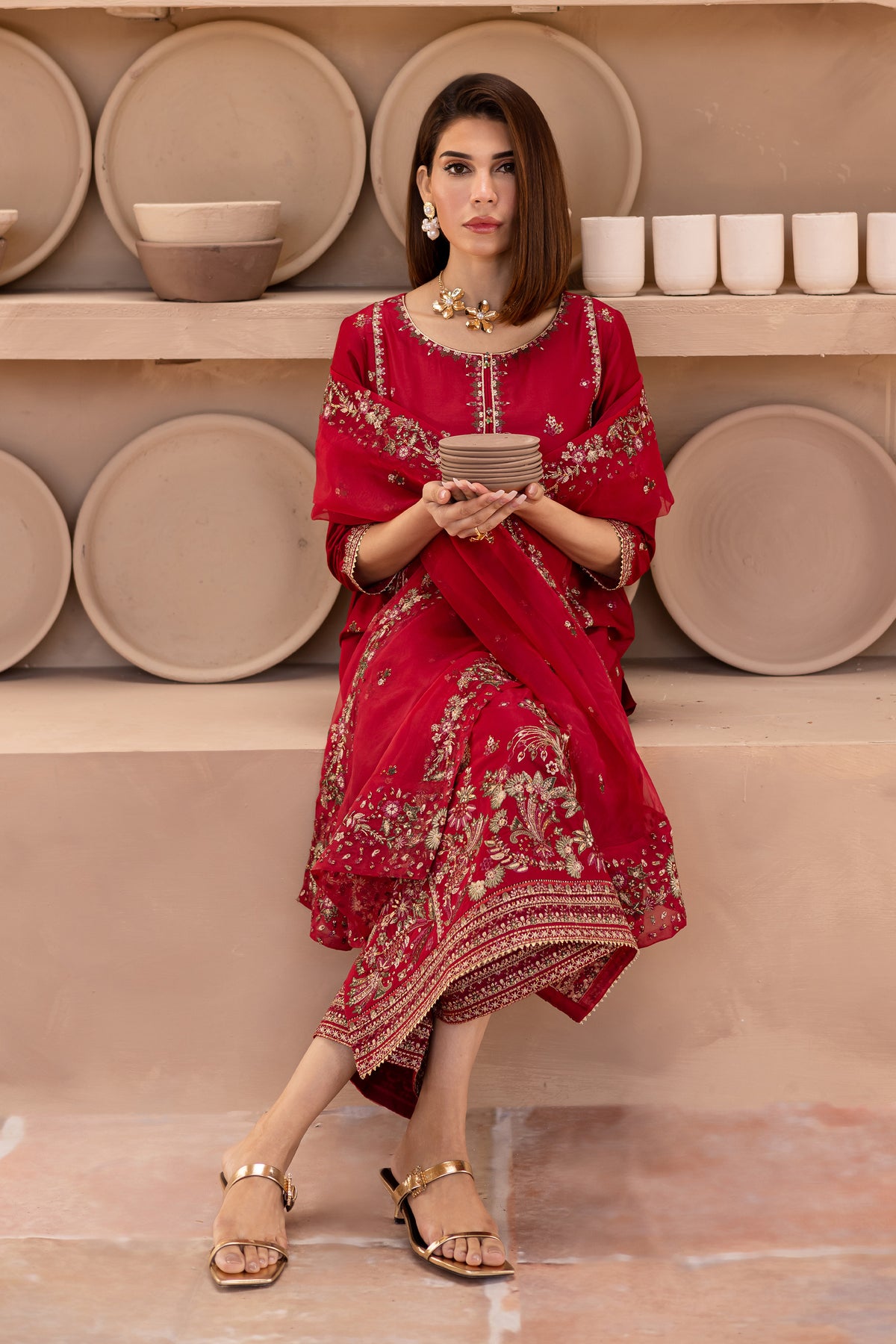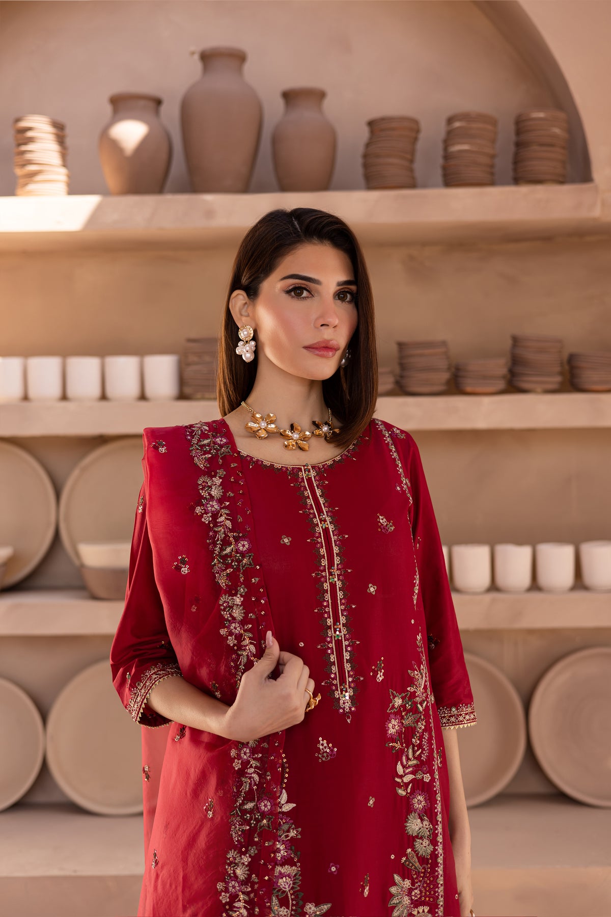 To complete the outfit, cambric wide embroidered culottes offer a comfortable yet stylish silhouette, perfectly complementing the detailed shirt and dupatta for a modern, elegant appearance.