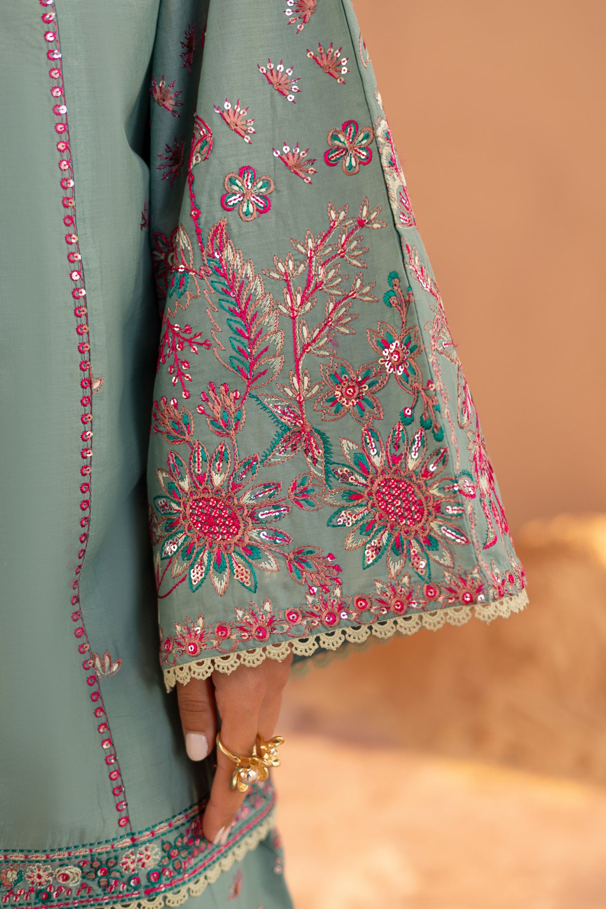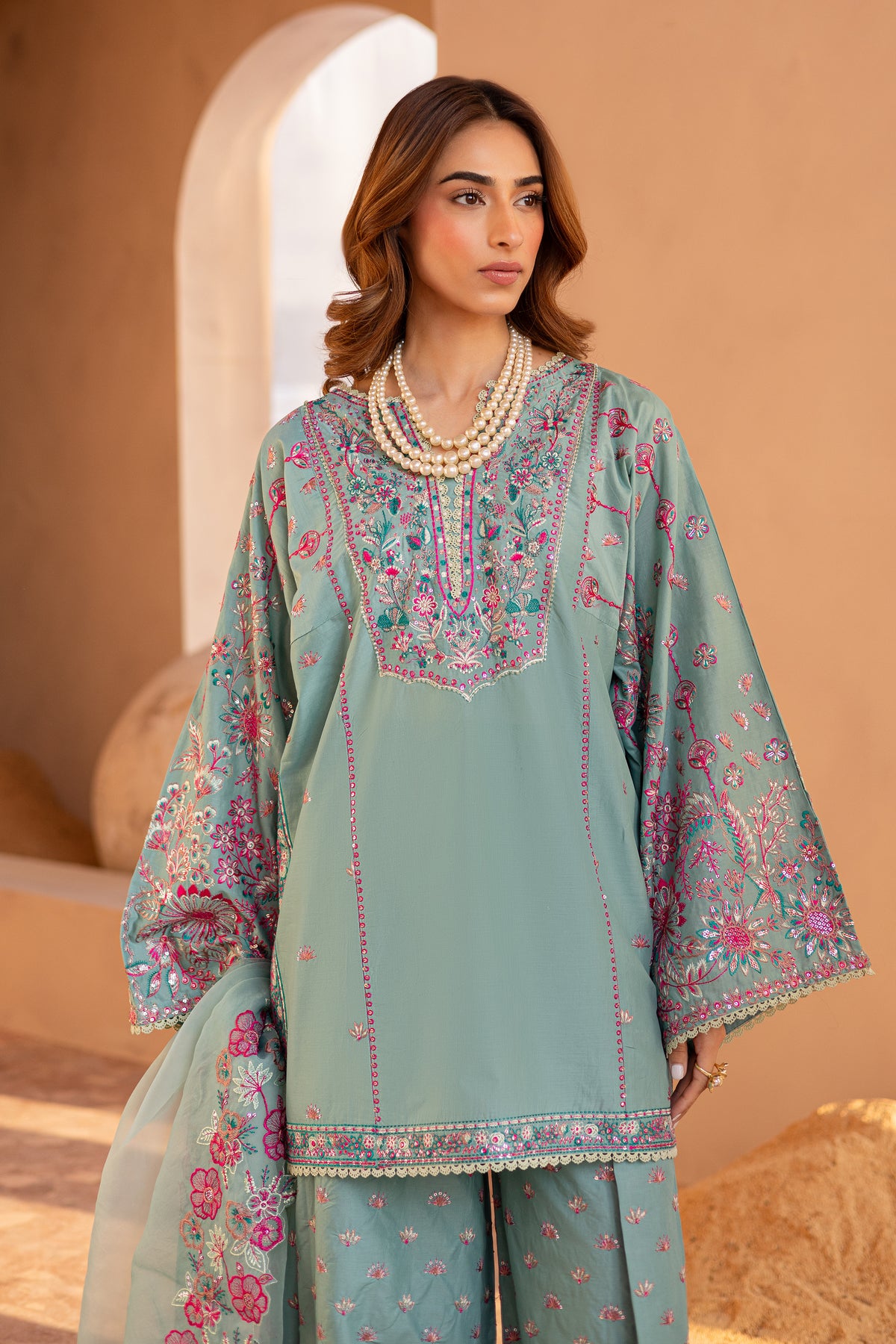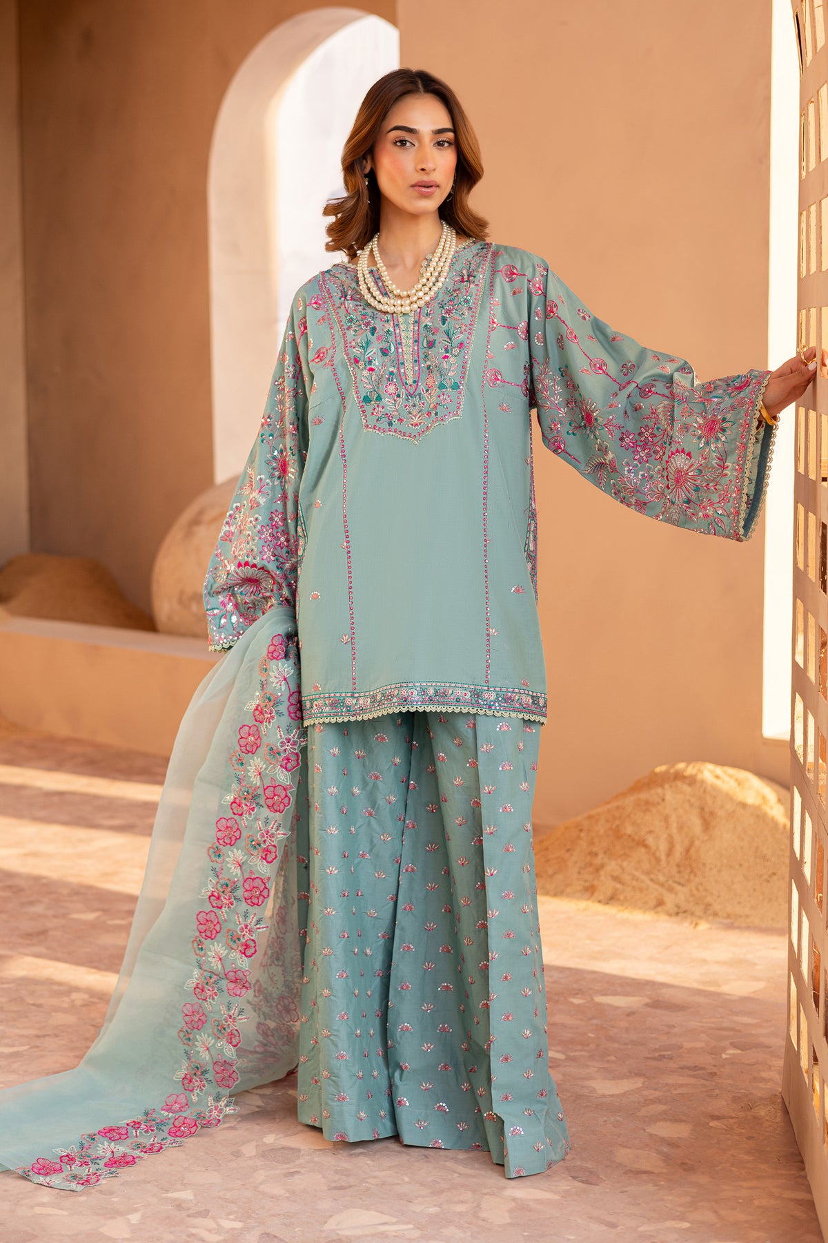 A contemporary take on classic elegance, this oil blue three-piece ensemble is designed with a structured yet stylish appeal. The short, box-fit paneled tunic is crafted from premium Pima Lawn and features square armhole sleeves with intricately composed embroidery. The adda work is applied to the center front panel. The neckline is beautifully adorned with pearl detailing, while the front, back, and side panels are enhanced with embroidered borders and bright-colored accents that add vibrancy to the look.