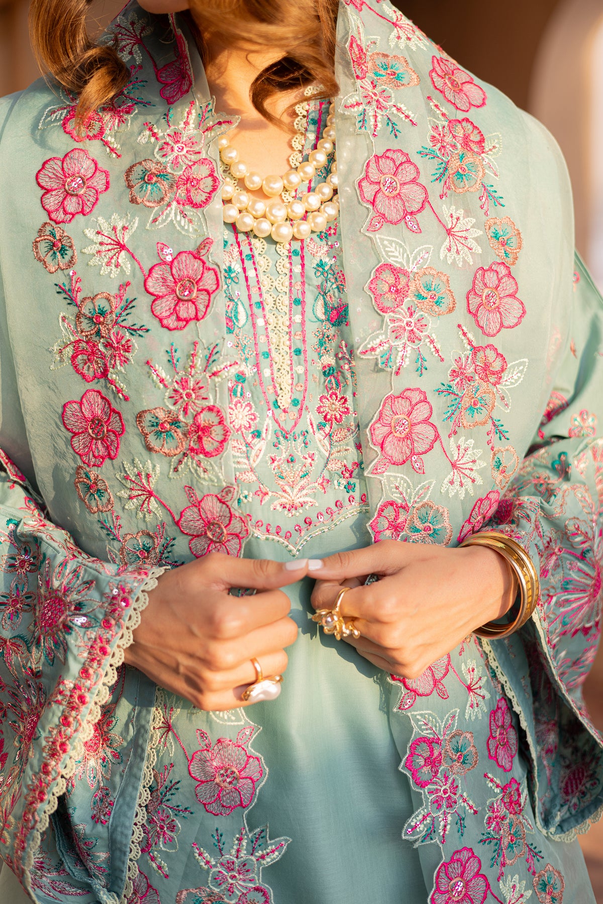 The embroidered organza dupatta adds an ethereal touch, elevating the outfit's refined aesthetic.