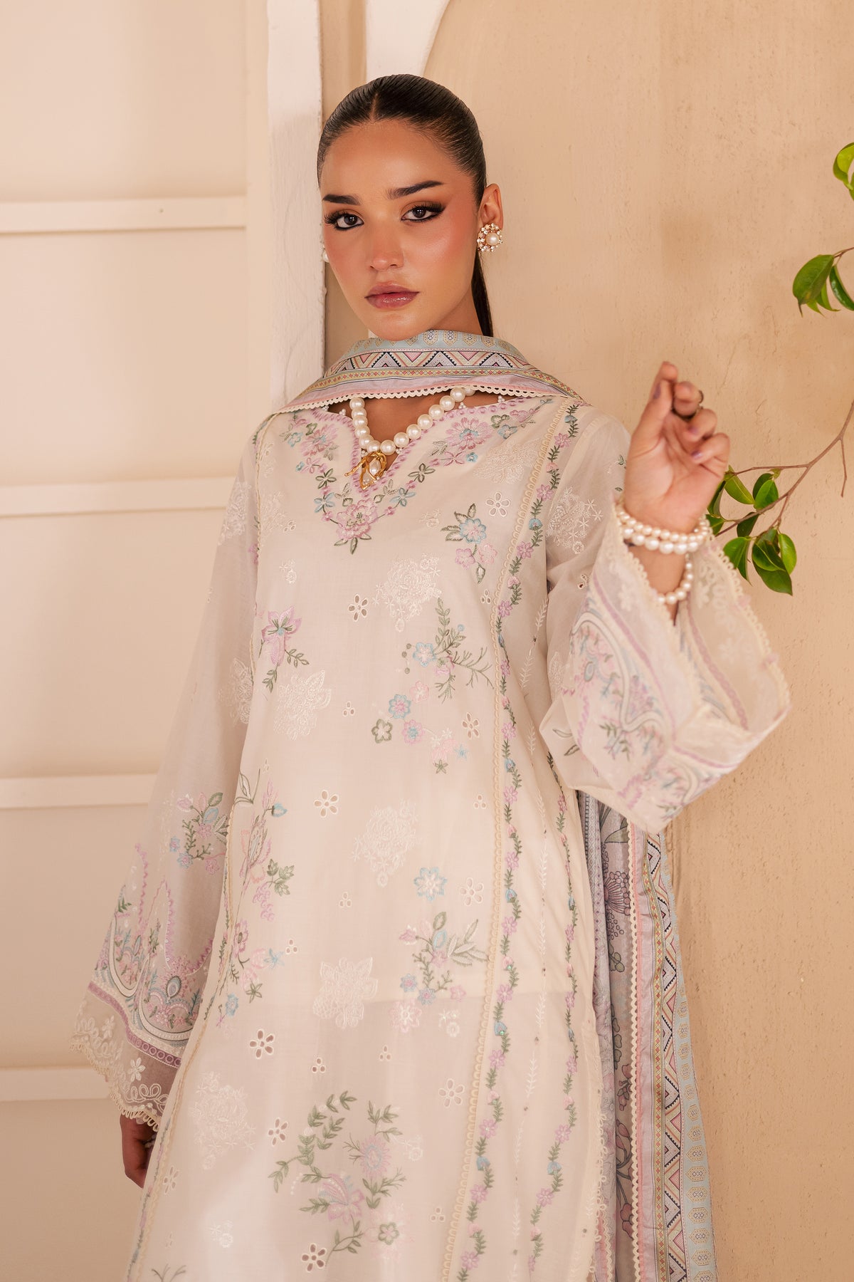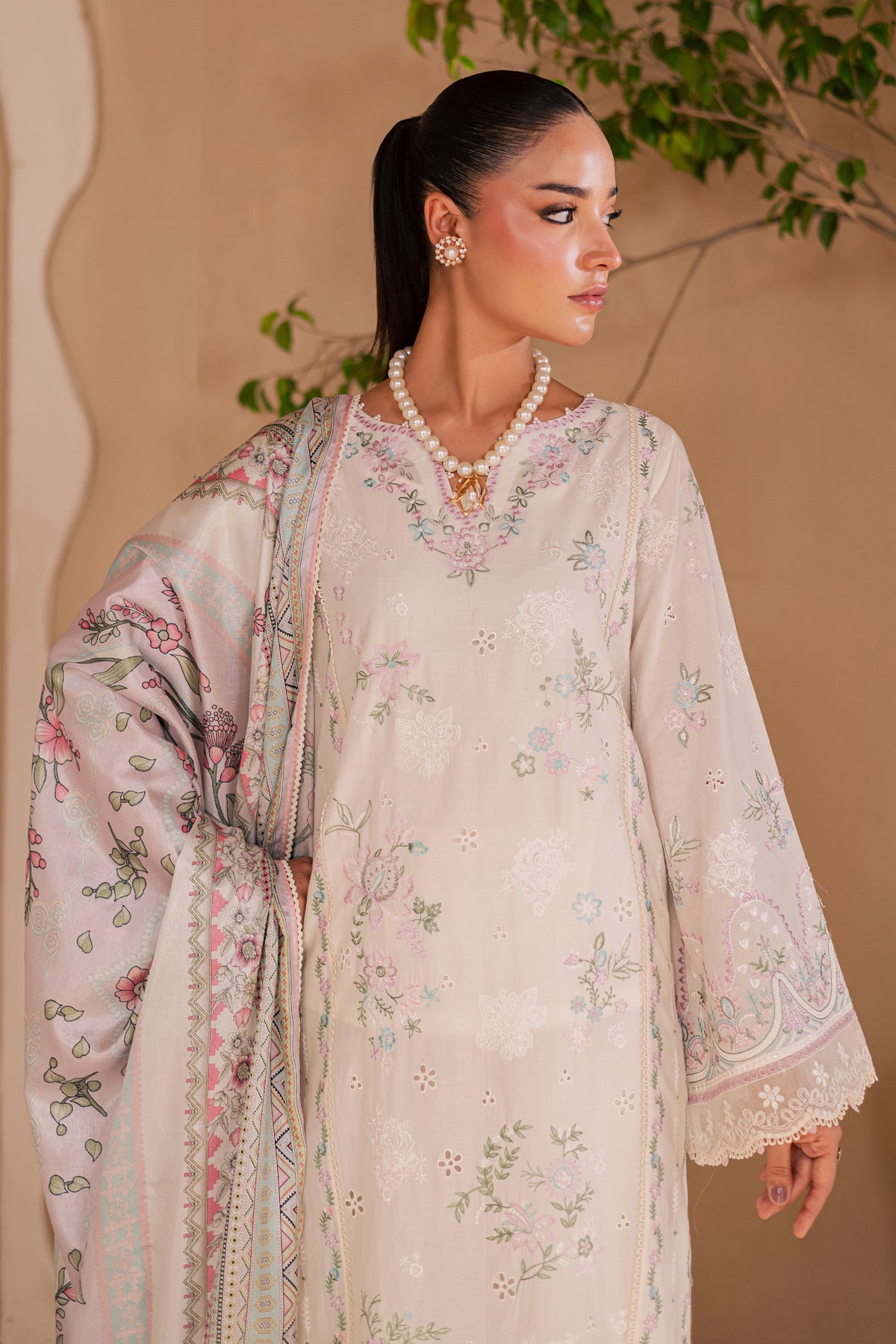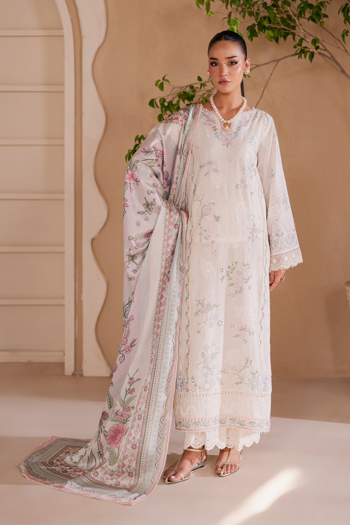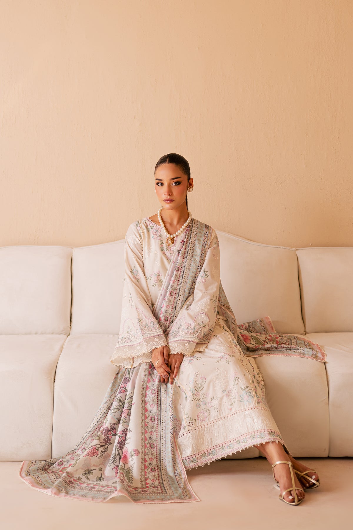 The look is completed with a digitally printed silk dupatta that adds a pop of color and elegance, perfectly balancing the soft tones of the ensemble with a vibrant, sophisticated touch.