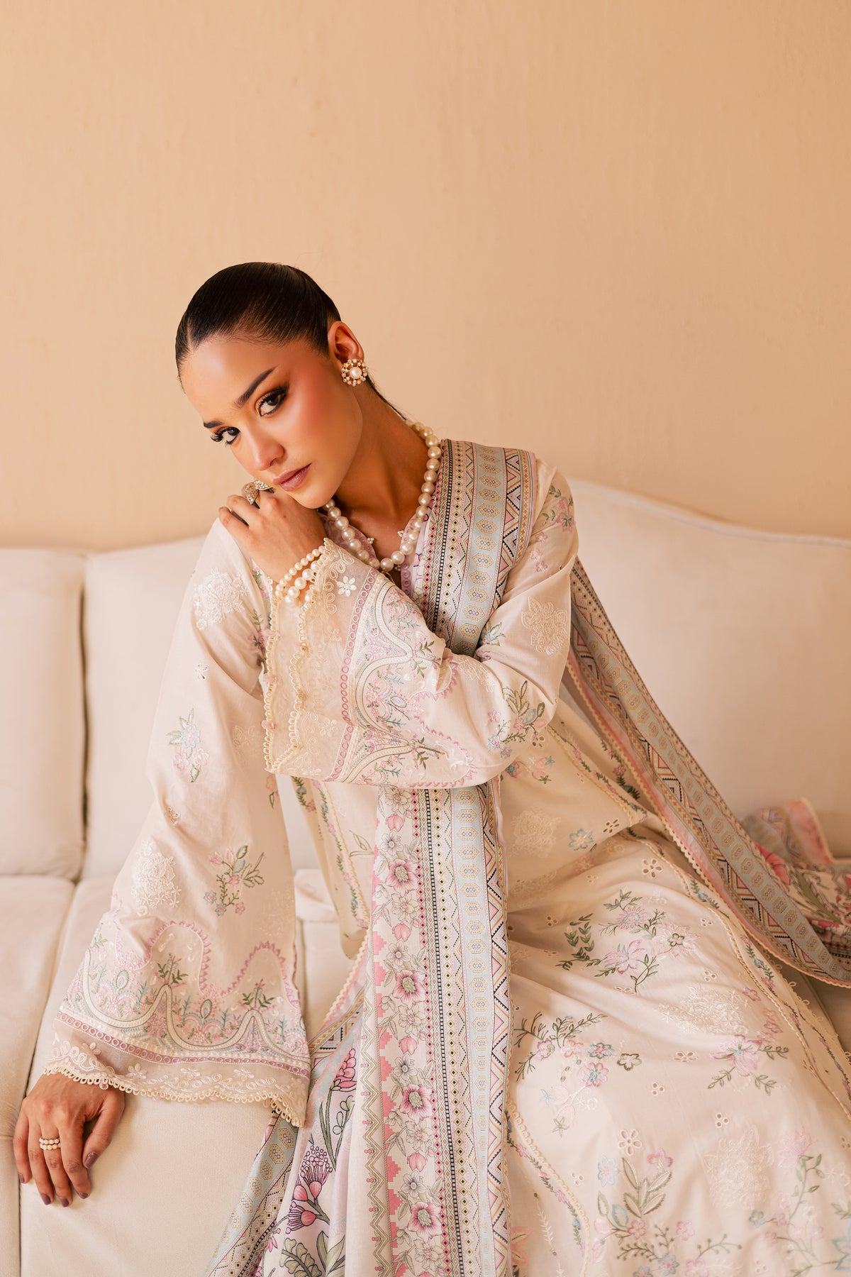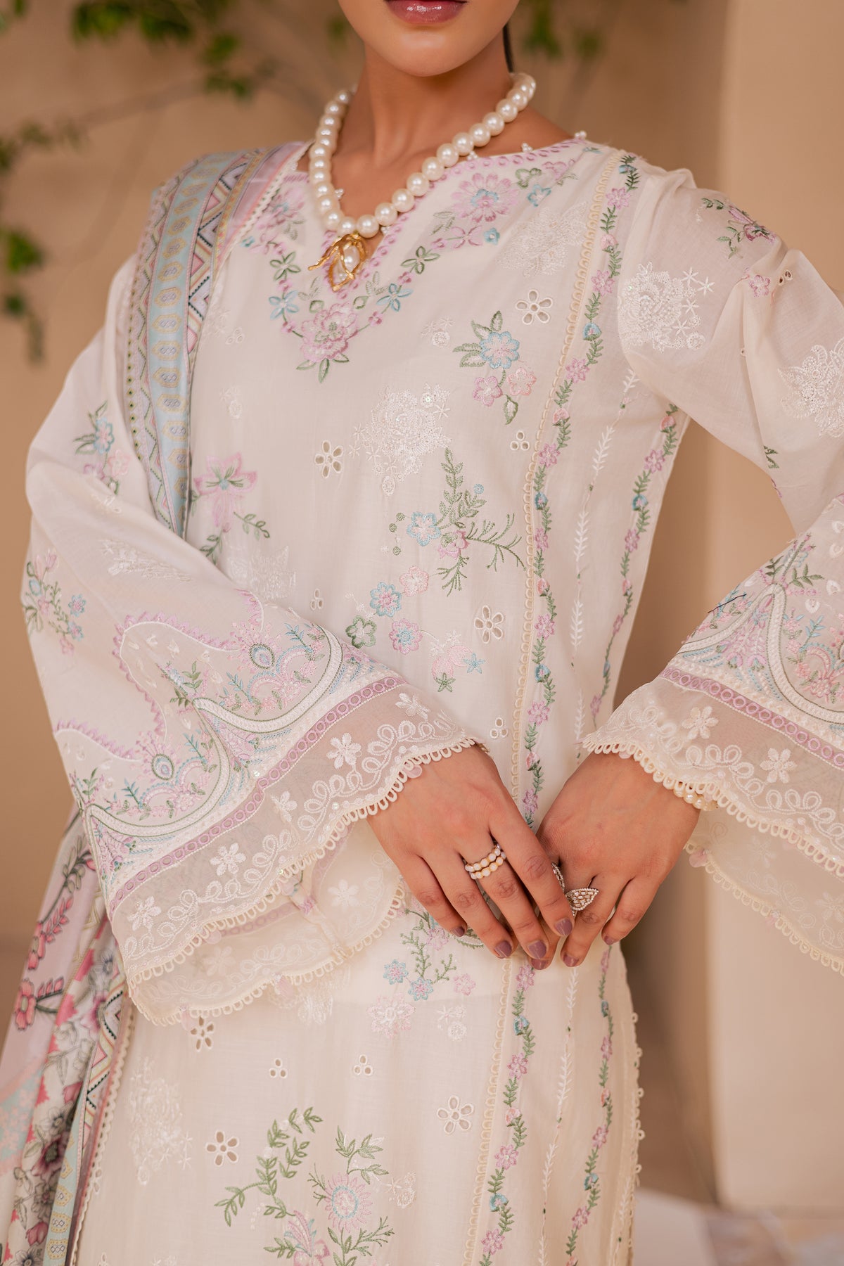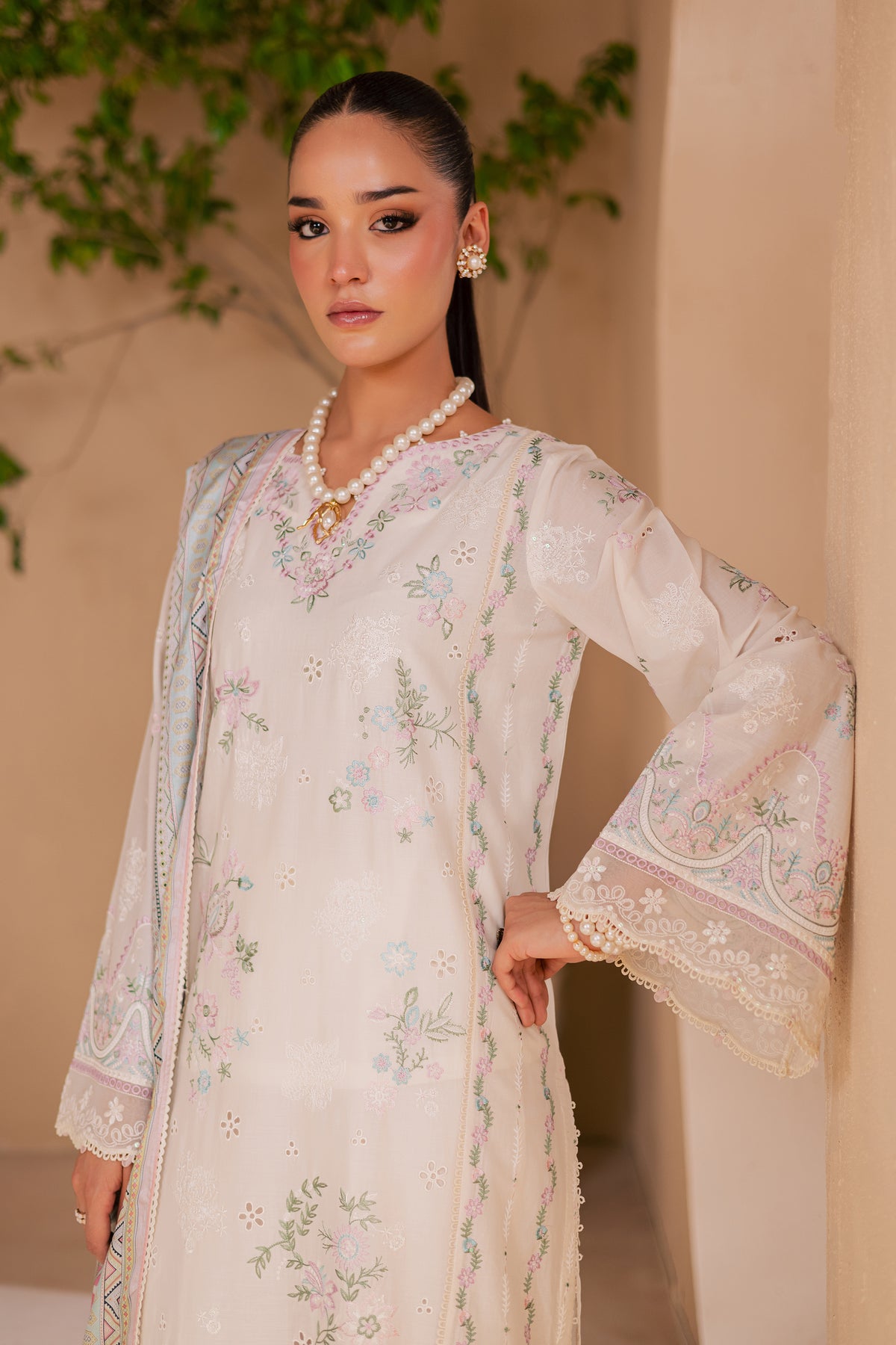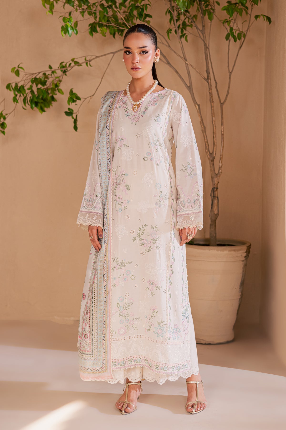 An off-white paneled long pima lawn shirt beautifully adorned with delicate pastel floral embroidery in soft, airy tones. The design features embroidered floral bunches and is finished with intricate lace along the sleeve hems, shirt hem, and side slits. A graceful neckline and statement sleeves elevate the silhouette, while pearl detailing on the neckline and sleeves adds a touch of elegance.