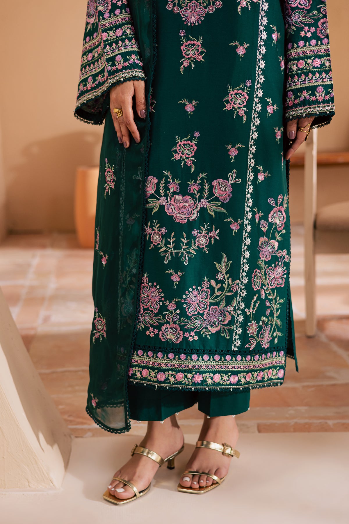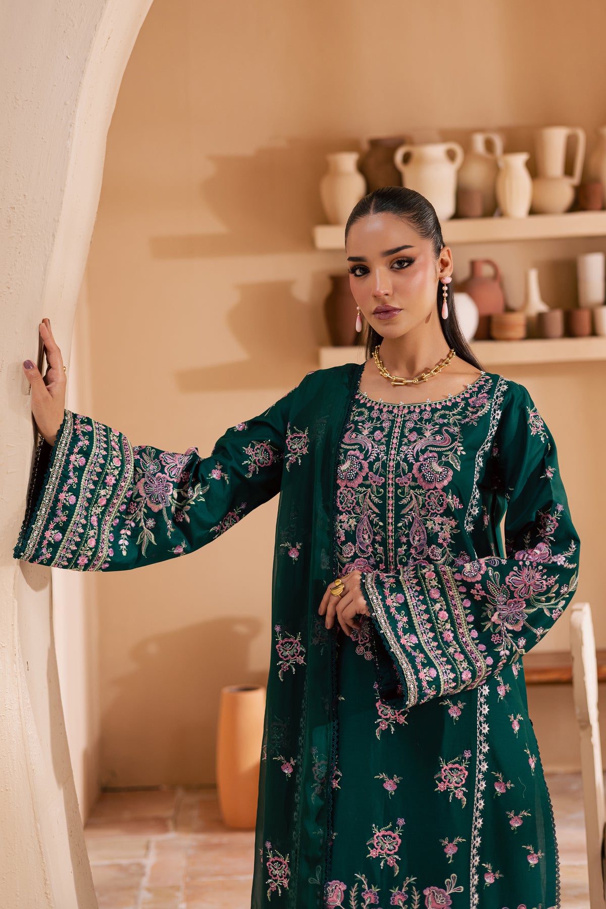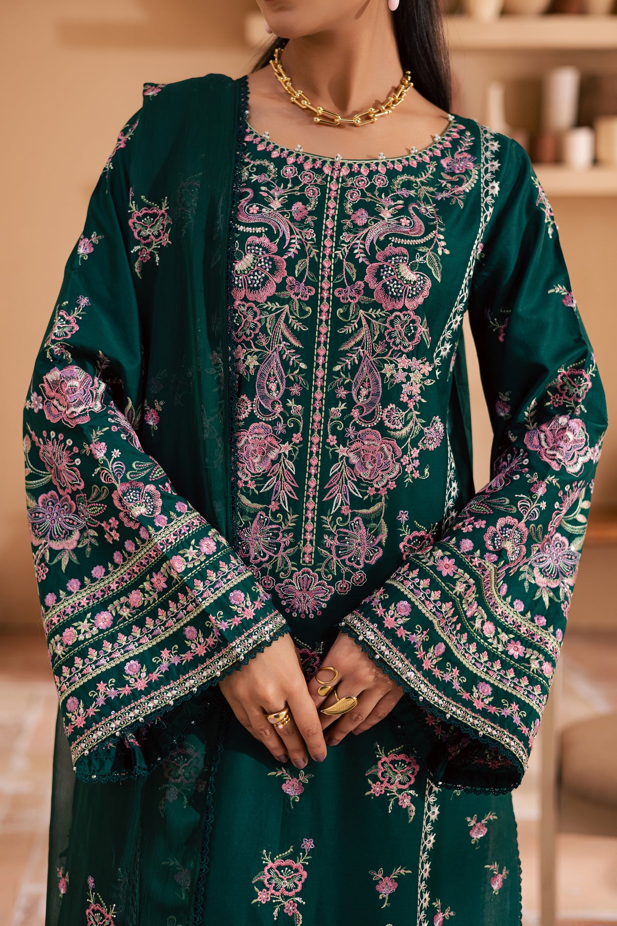 A rich emerald green paneled pima lawn shirt featuring colorful embroidery that brings festive charm to the deep, elegant base. Designed with a soft round neckline adorned with pearl detailing, relaxed sleeves, and subtle pearl accents along the shirt hem and sleeve edges for an elevated, graceful finish.