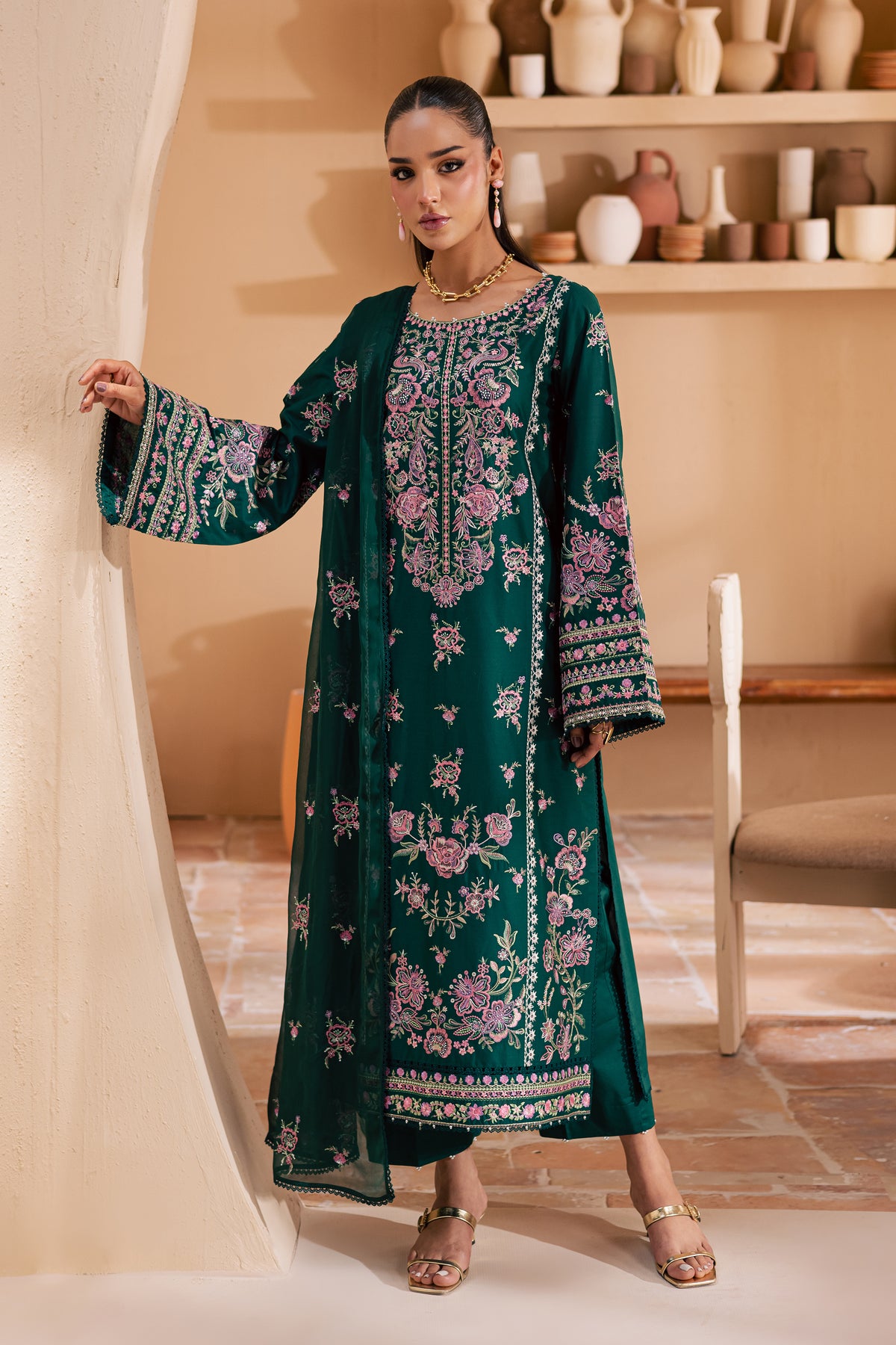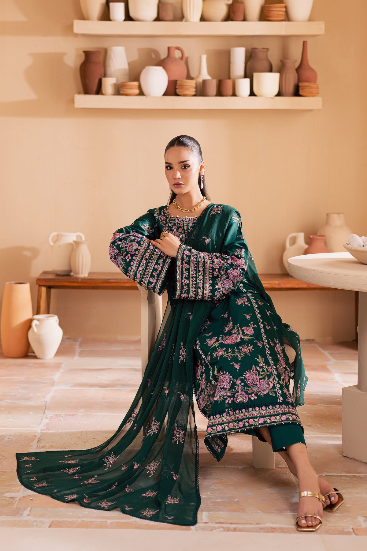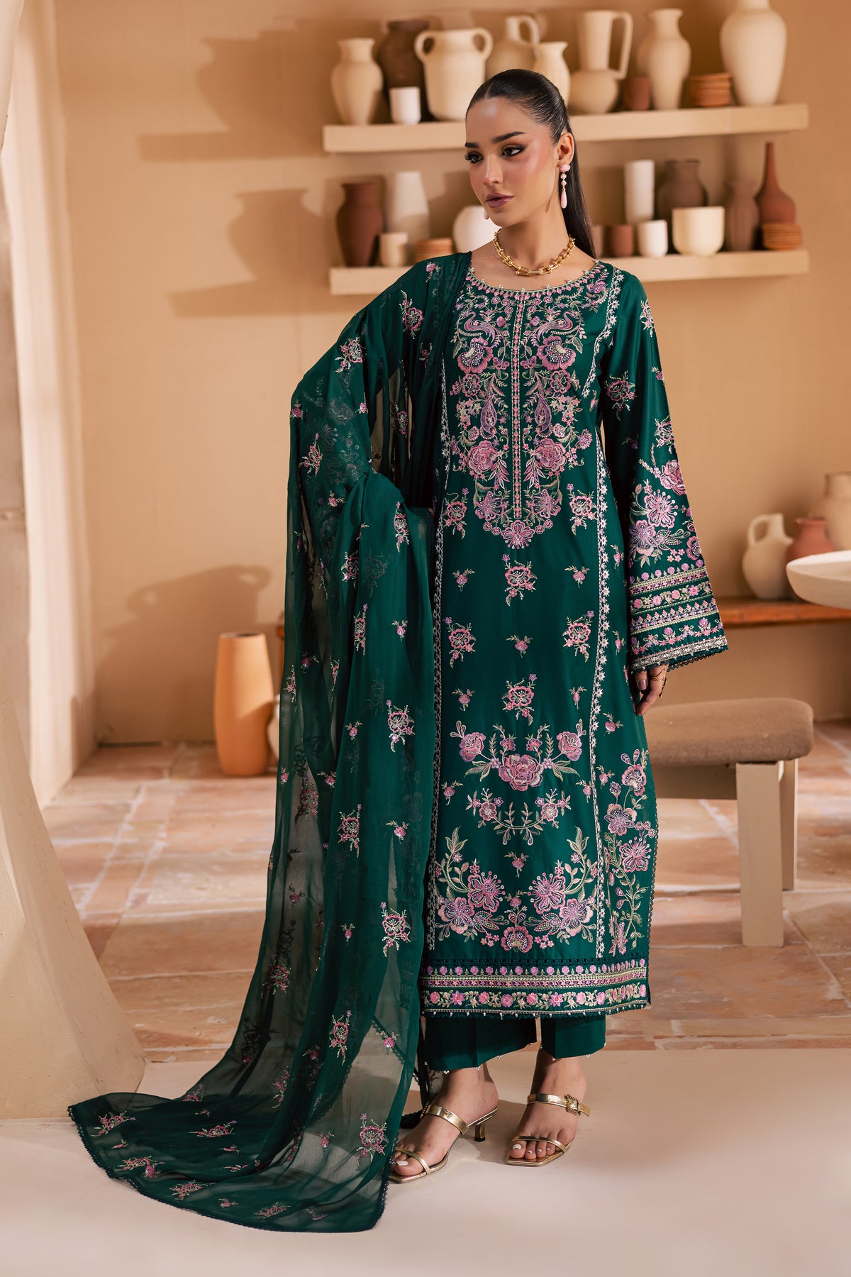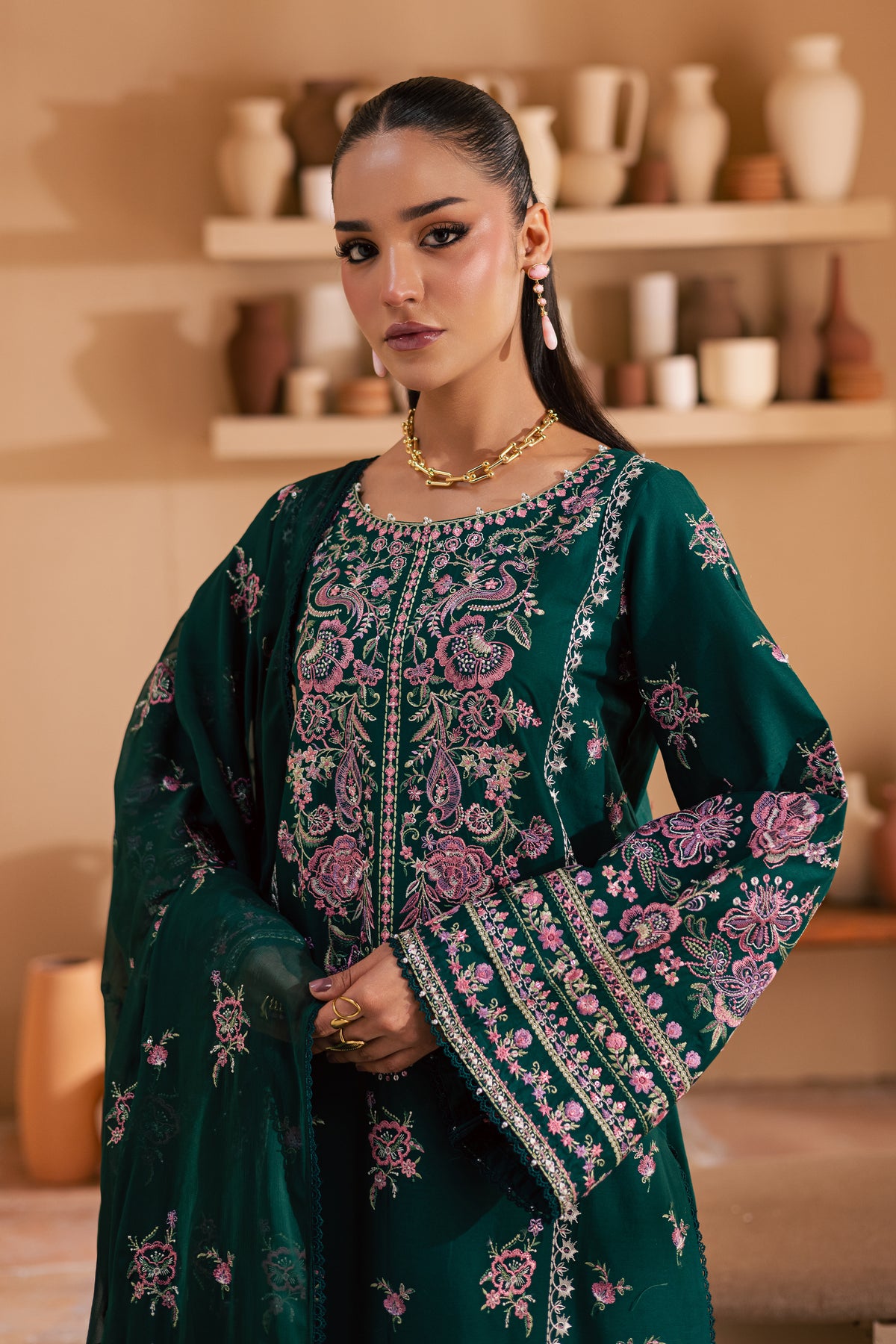 A rich emerald green paneled pima lawn shirt featuring colorful embroidery that brings festive charm to the deep, elegant base. Designed with a soft round neckline adorned with pearl detailing, relaxed sleeves, and subtle pearl accents along the shirt hem and sleeve edges for an elevated, graceful finish.