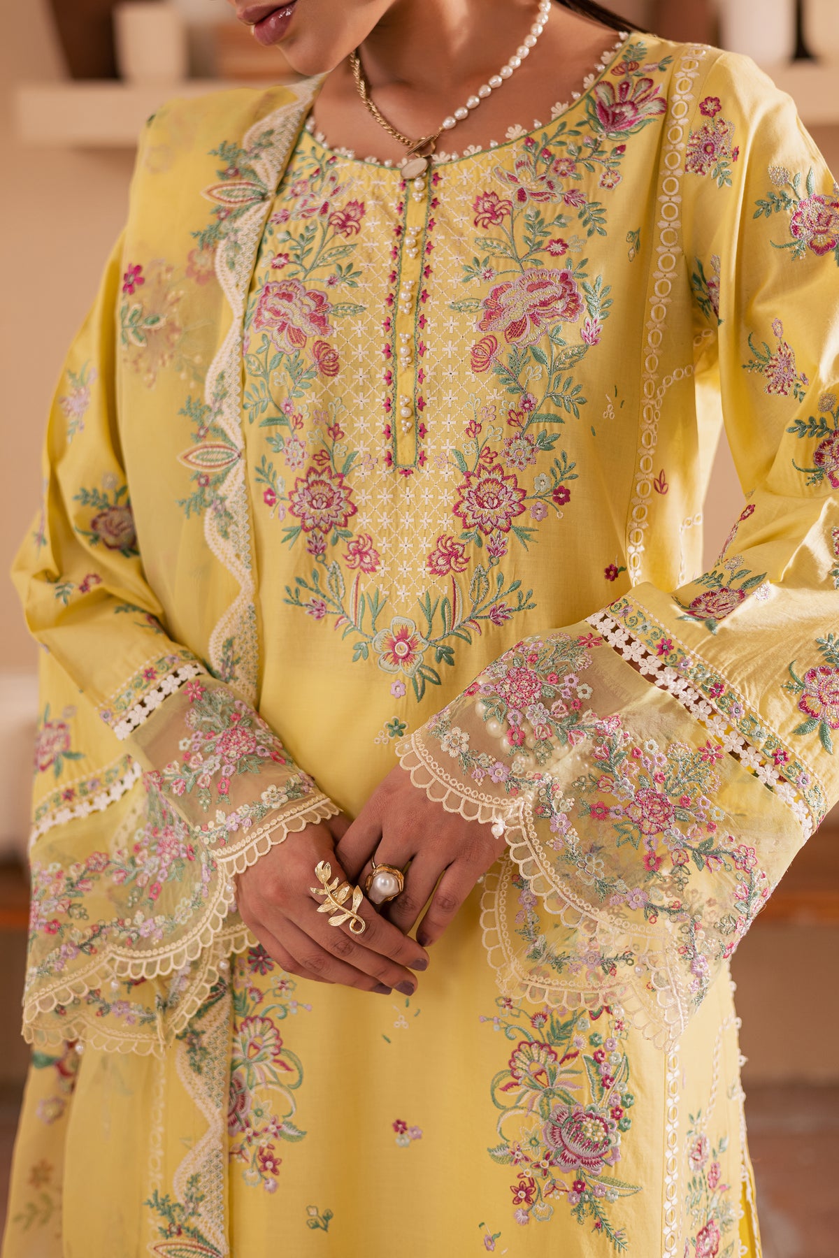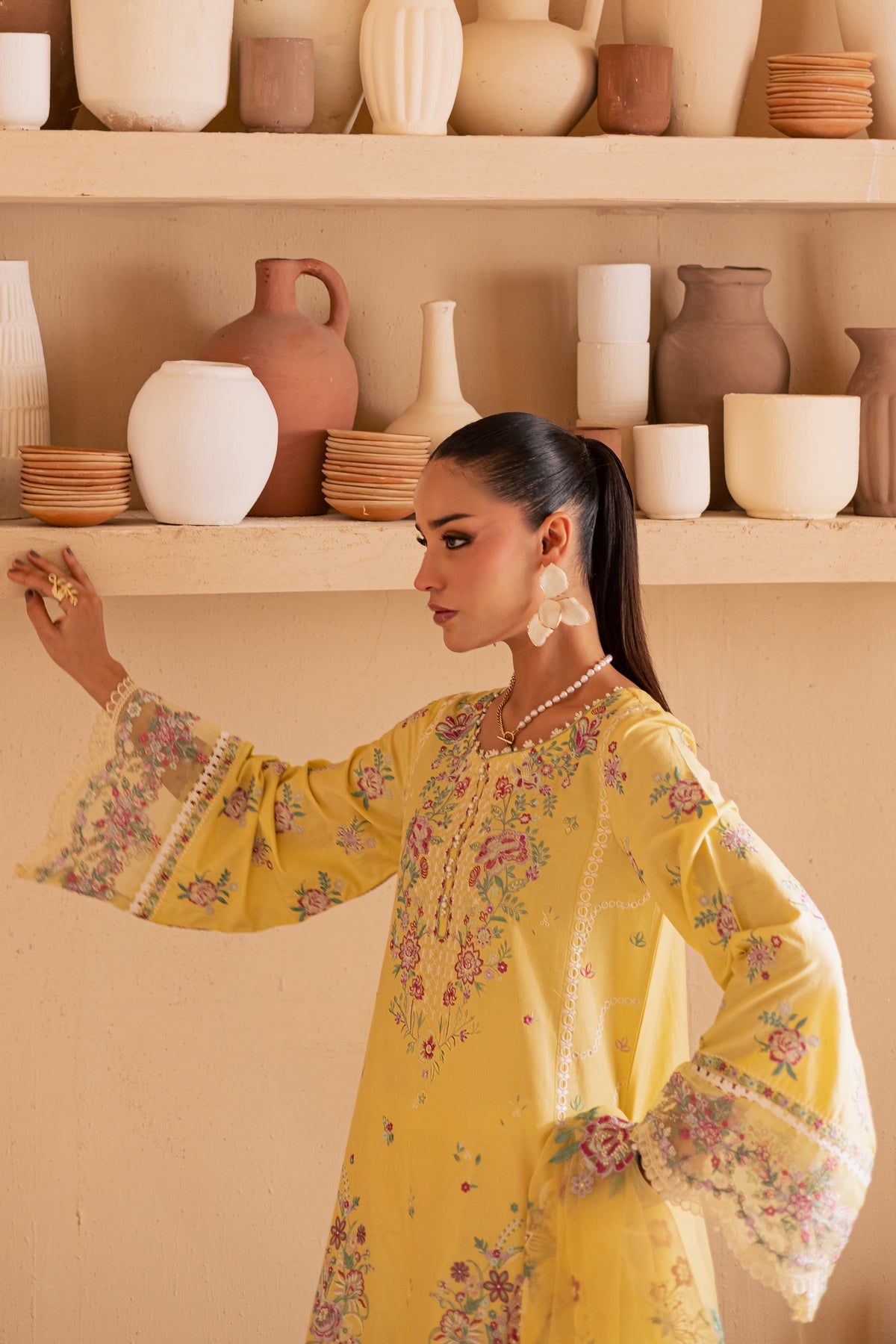 A soft yellow lawn long pima lawn shirt featuring delicate multicolor embroidery scattered across the front, enhanced with intricate detailing along the neckline, sleeves, and hem. The design is elevated with pearl embellishments on the neckline and sleeve edges, adding a graceful, feminine touch.