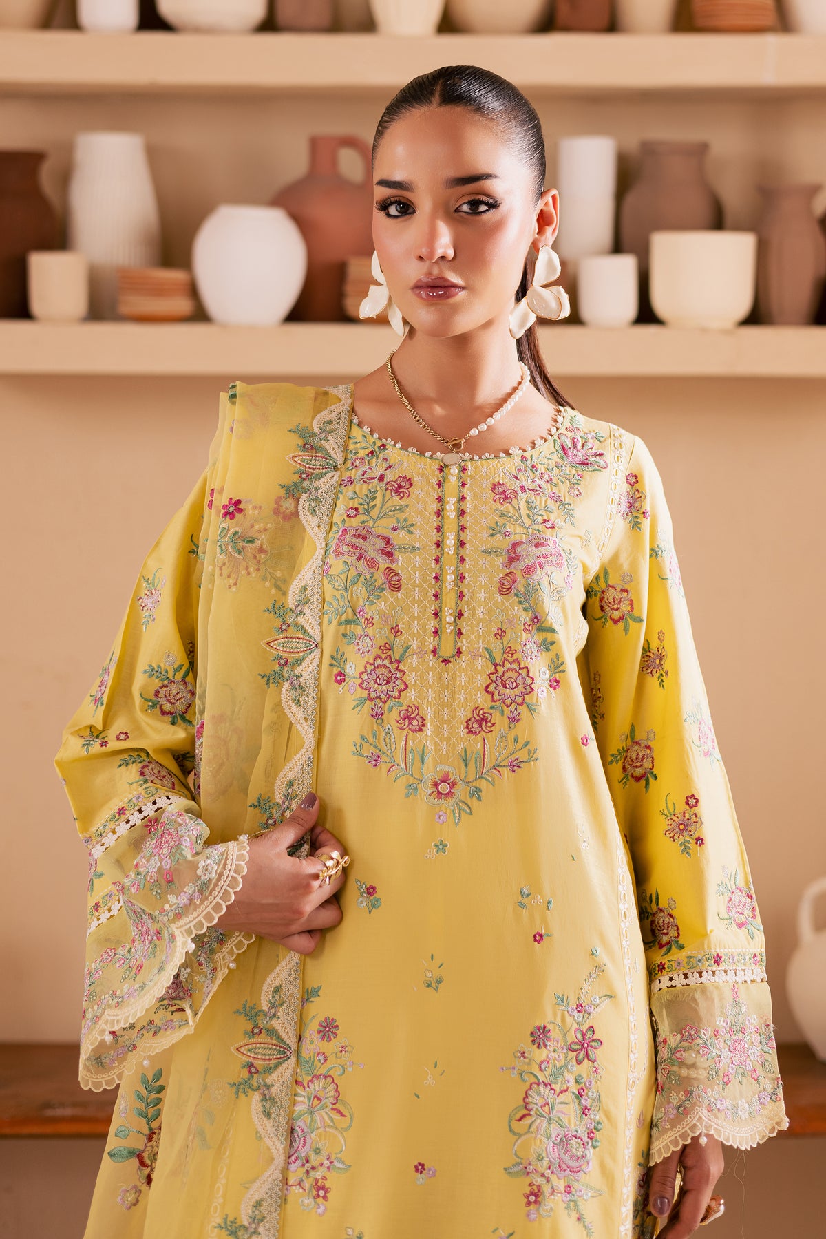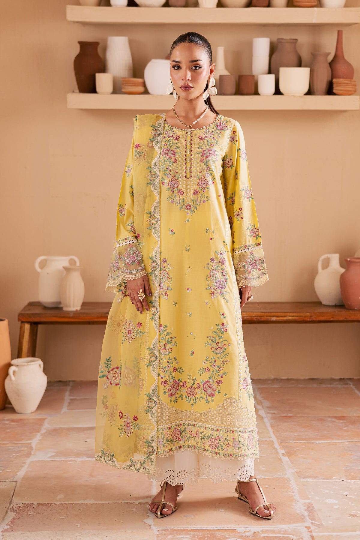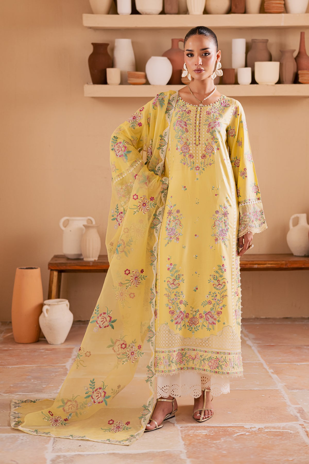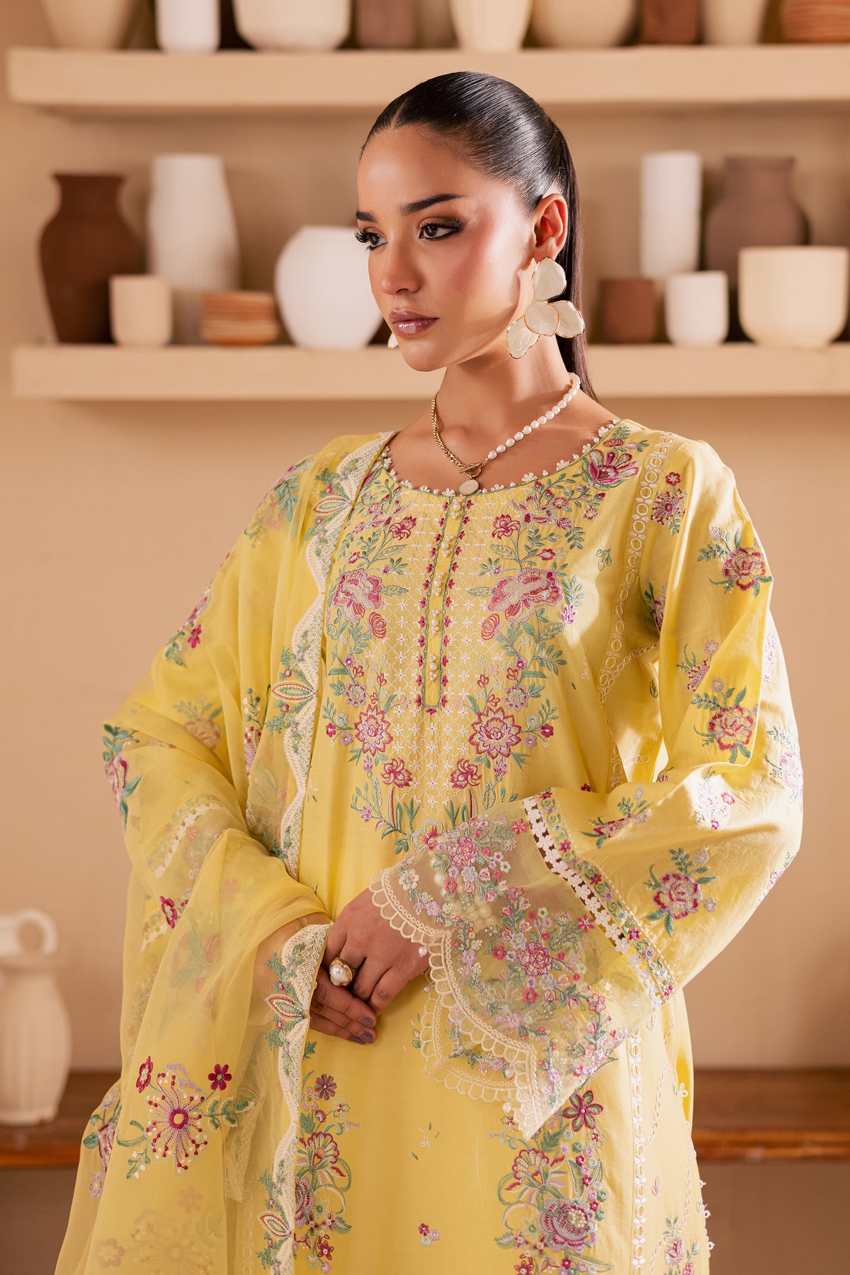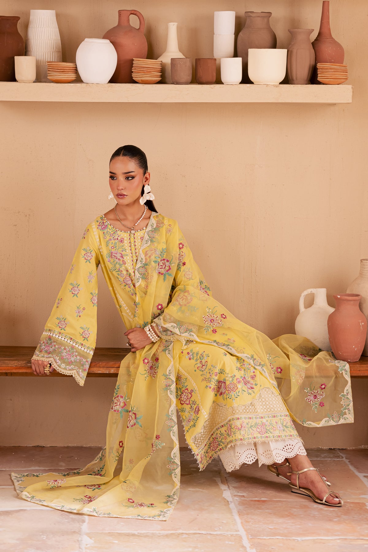 The outfit is completed with a yellow organza dupatta, embroidered to perfection and finished with delicate lace and pearl detailing, bringing an airy, graceful finish to the ensemble.