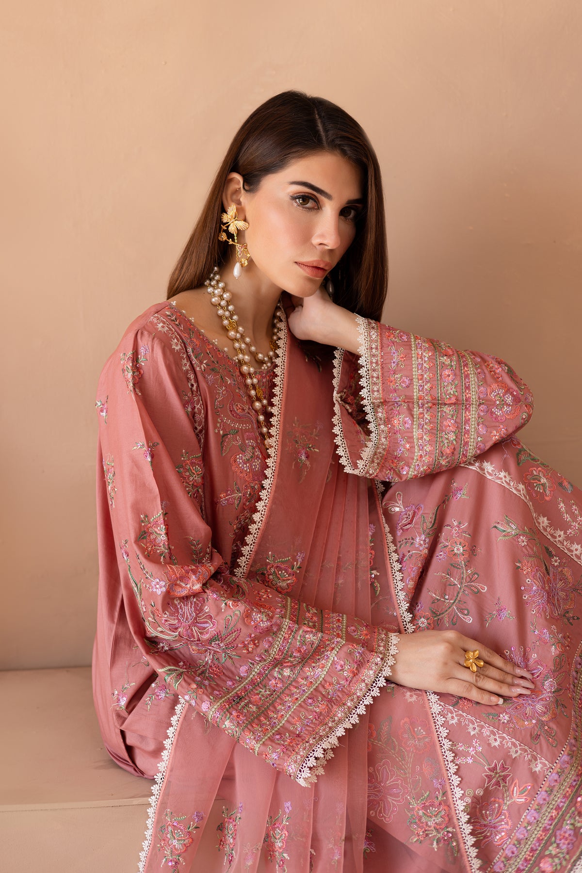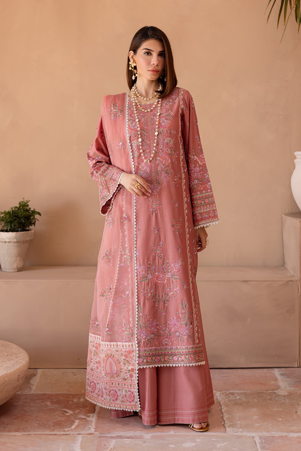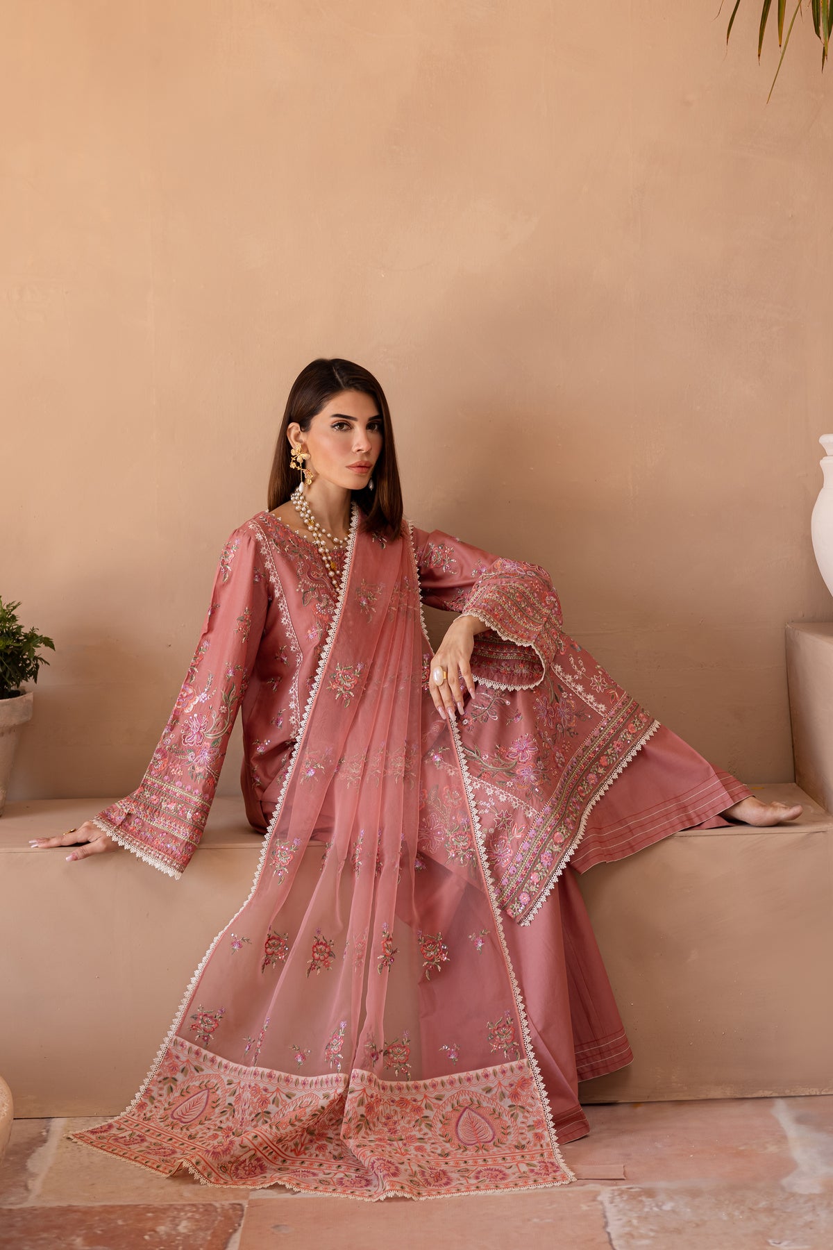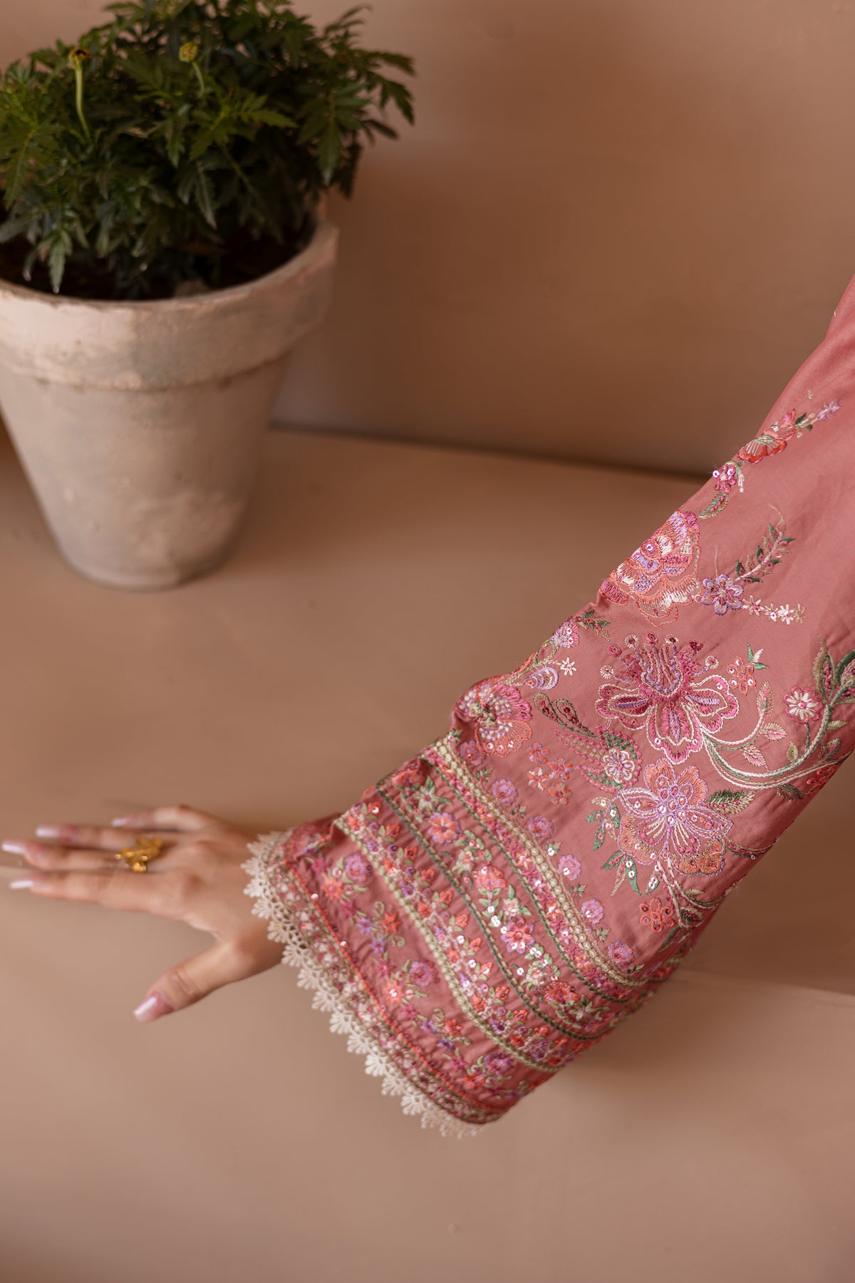 This long pima lawn peach A-line shirt features embroidered panels and borders on the hem, beautifully finished with lace for an elegant touch. The composed center panel is highlighted by an intricate embroidered round neckline, adorned with pearls for added sophistication. The full-length sleeves and hem are enhanced with detailed embroidered borders, adding richness to the design.