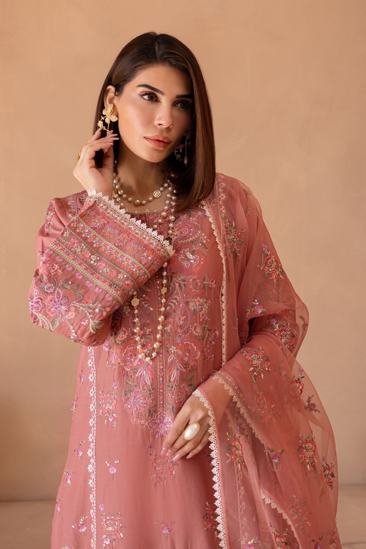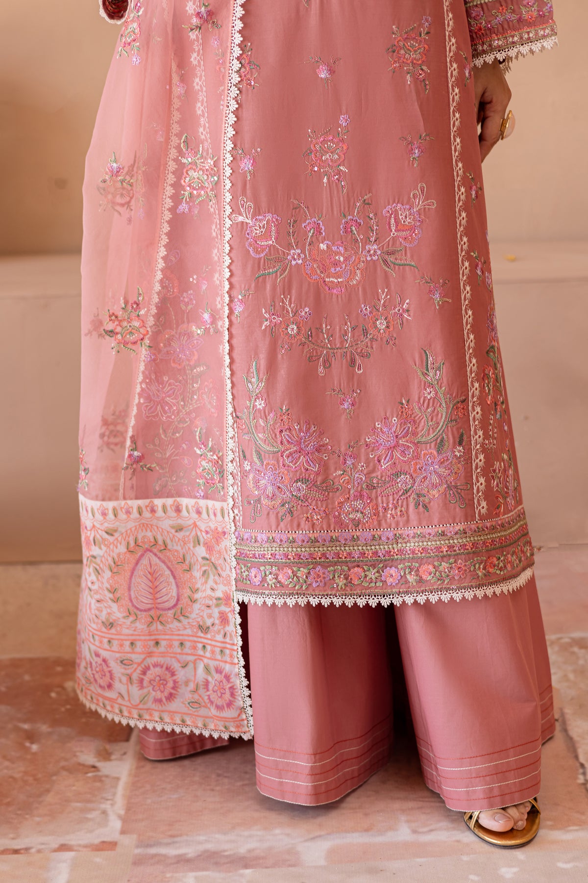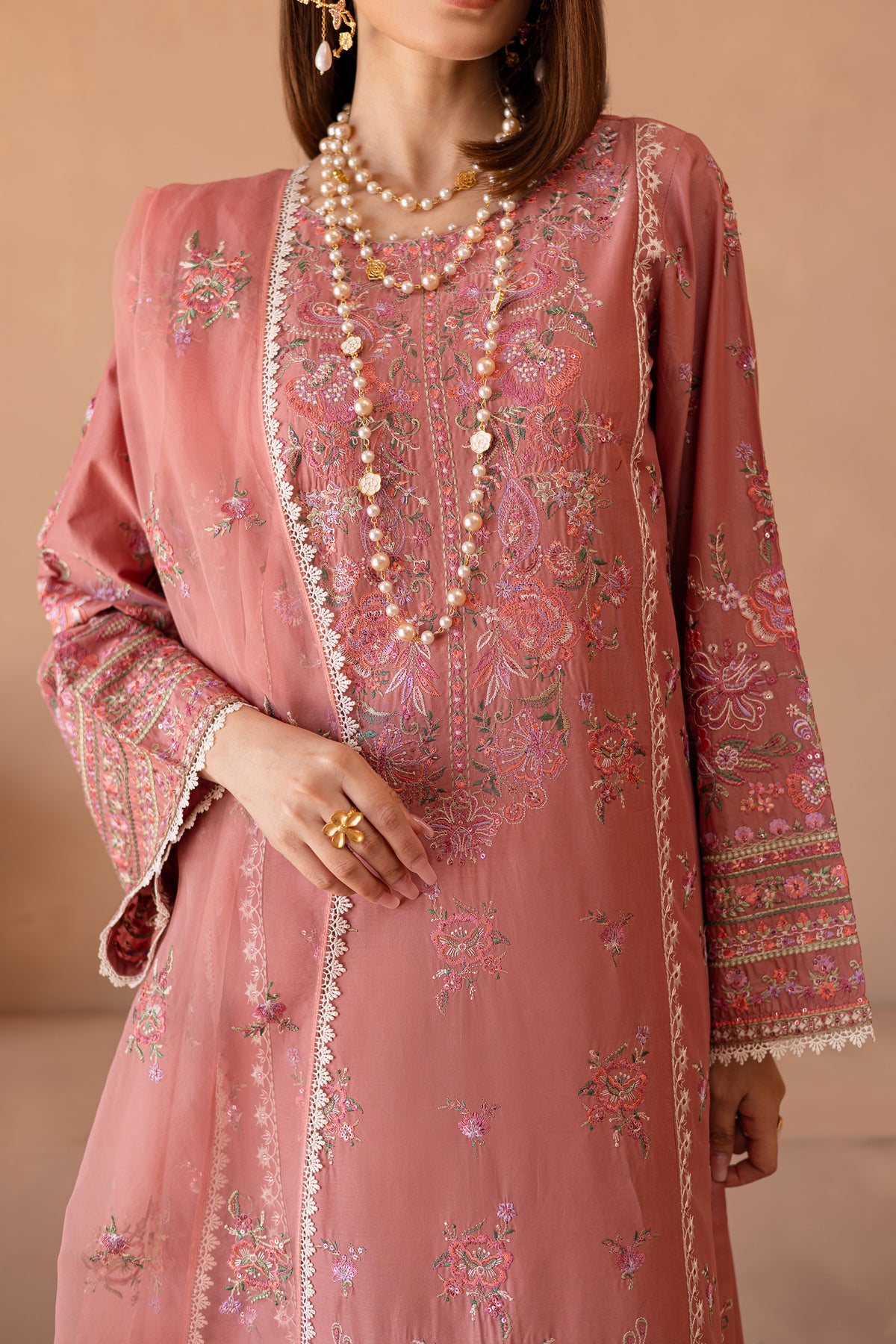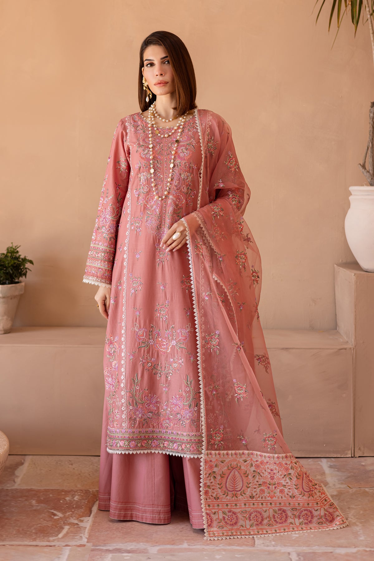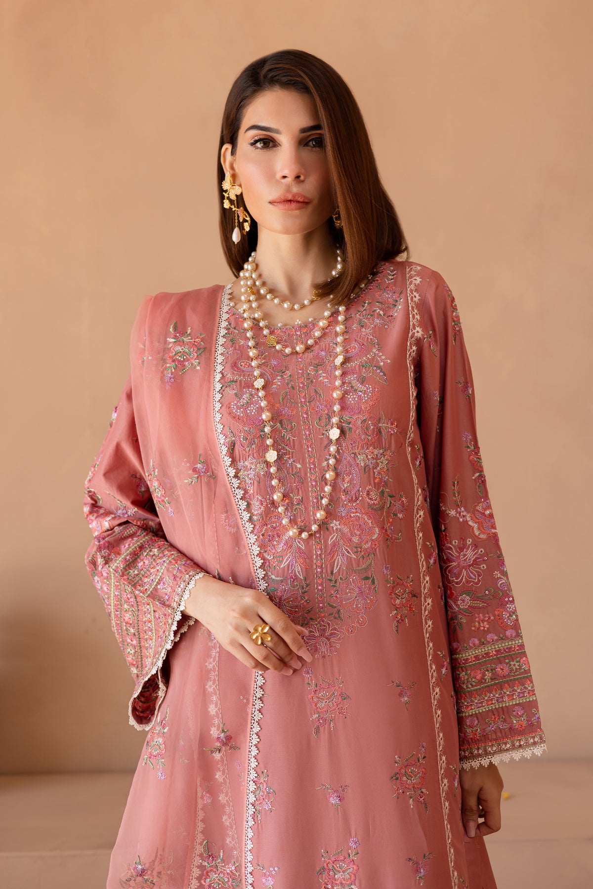 This long pima lawn peach A-line shirt features embroidered panels and borders on the hem, beautifully finished with lace for an elegant touch. The composed center panel is highlighted by an intricate embroidered round neckline, adorned with pearls for added sophistication. The full-length sleeves and hem are enhanced with detailed embroidered borders, adding richness to the design.