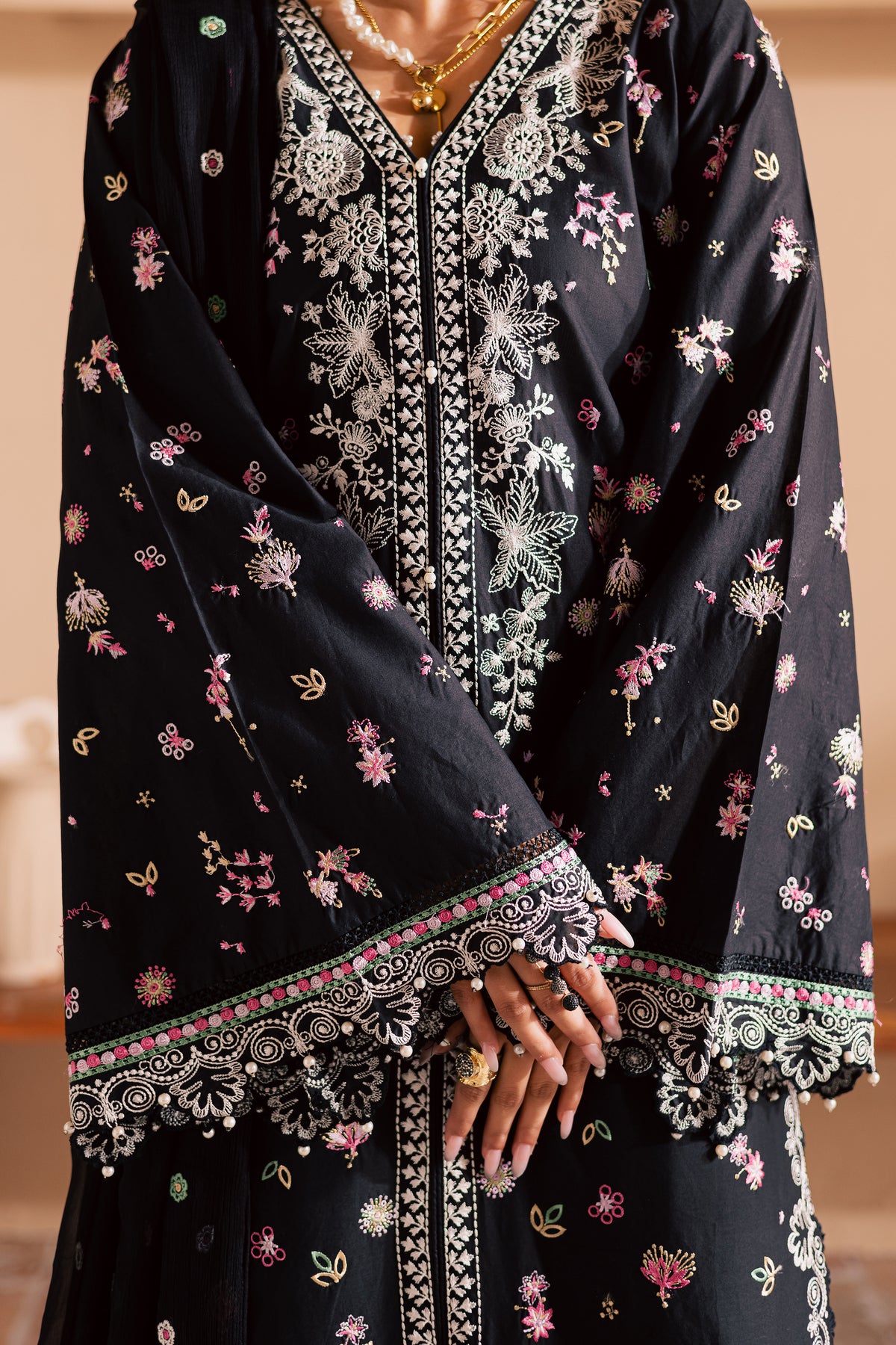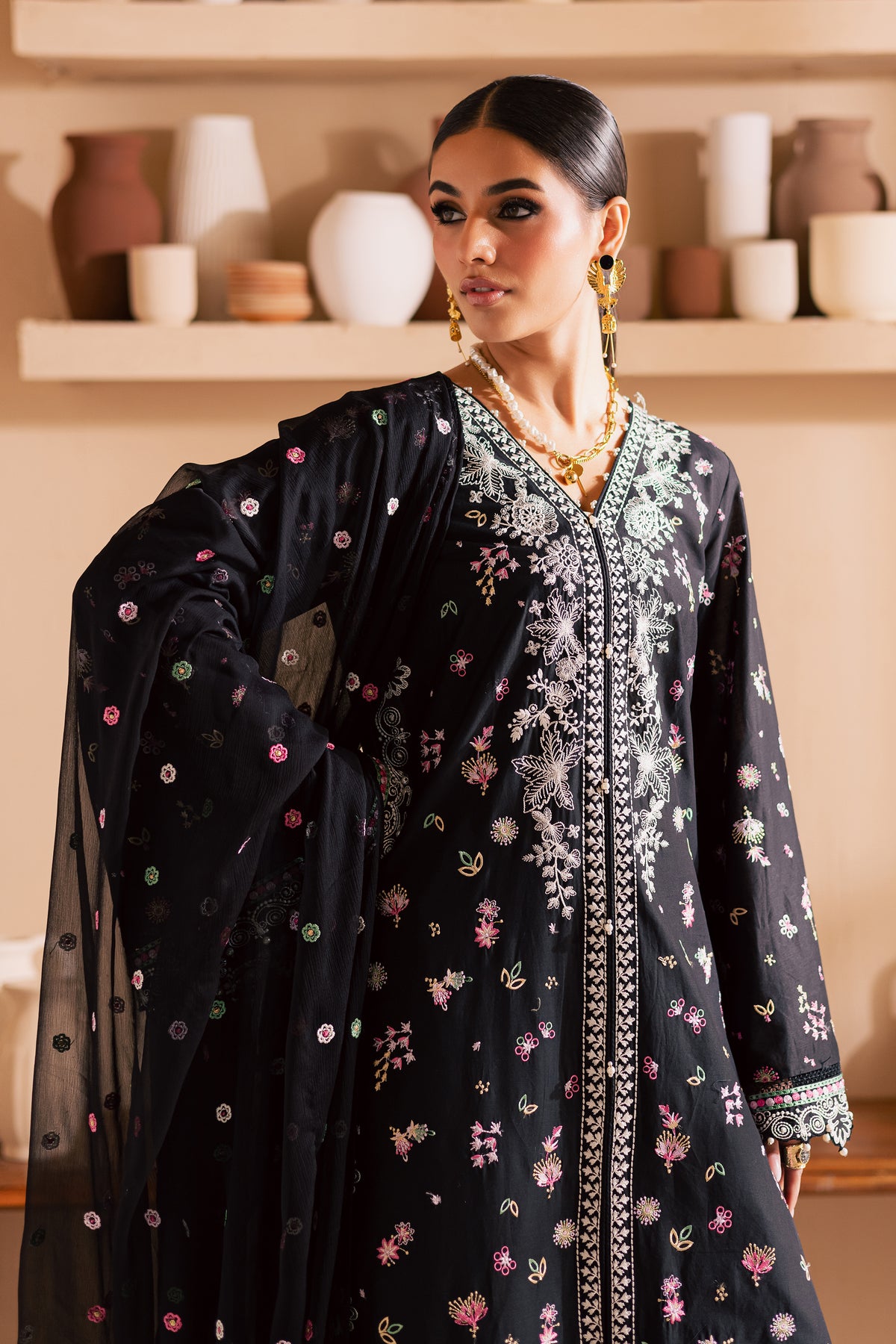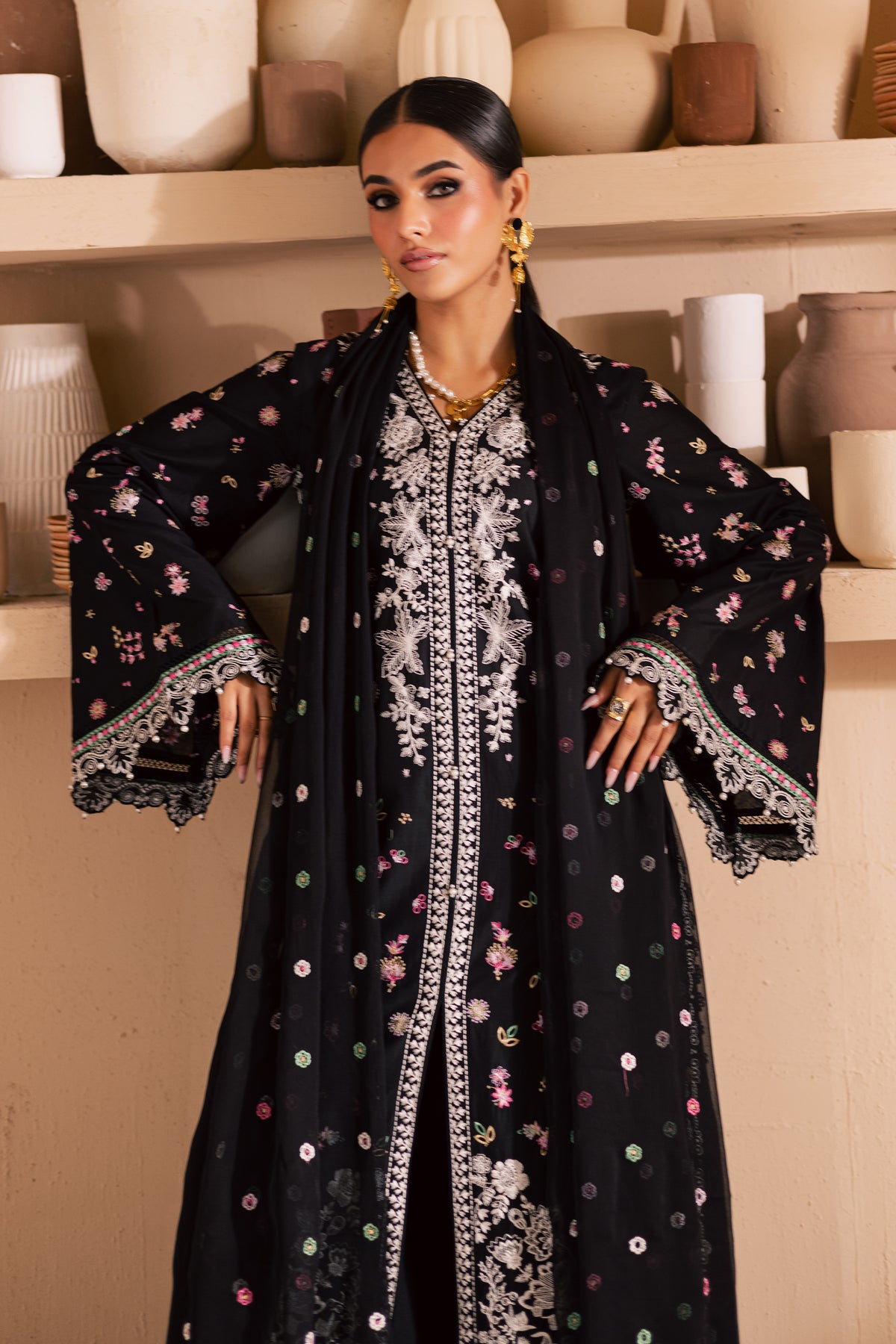 A front-open embroidered pima lawn black shirt crafted from jet black pima fabric, featuring a heavily embroidered front and hem for a striking, festive look. Pearl detailing along the neckline, sleeve hem, and shirt hem adds a touch of elegance, while delicate lace along the side chalk completes the design with graceful finesse.