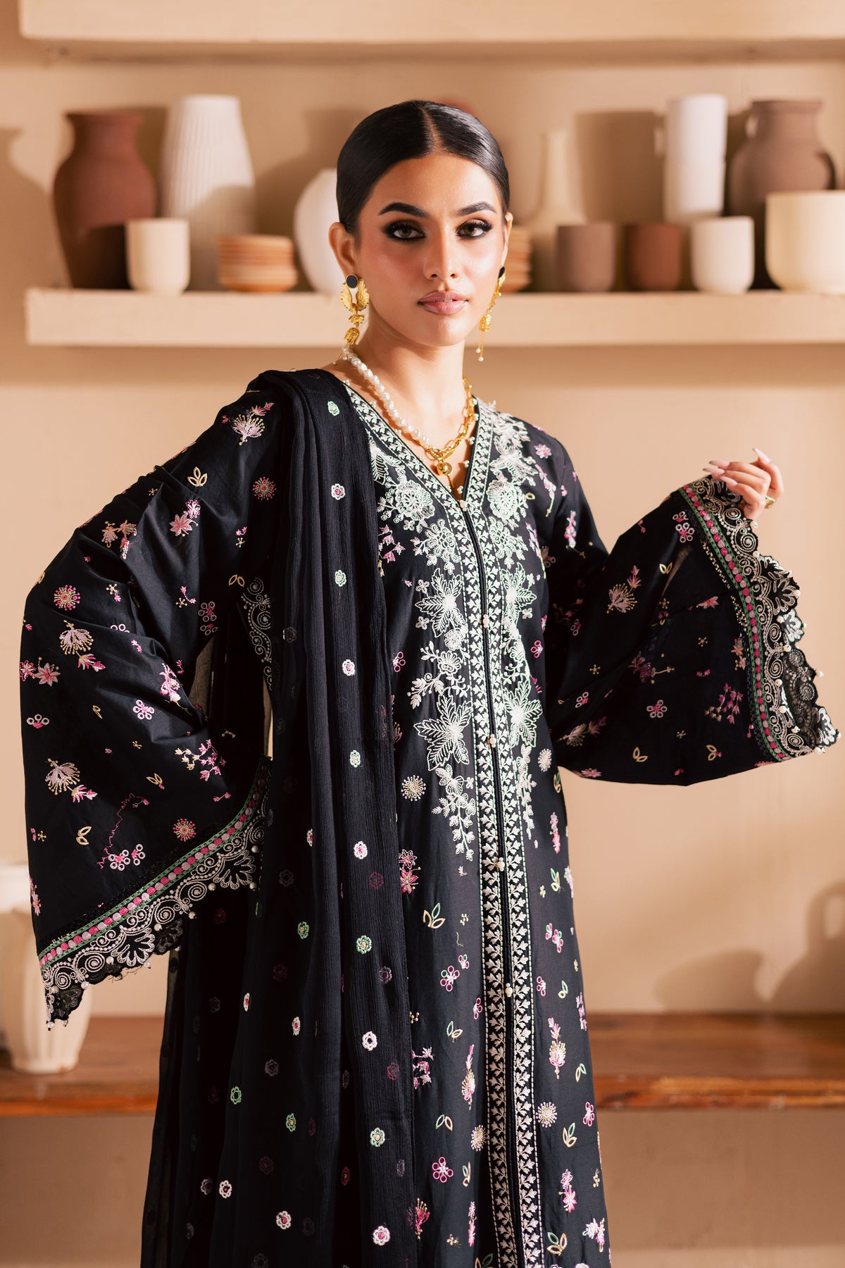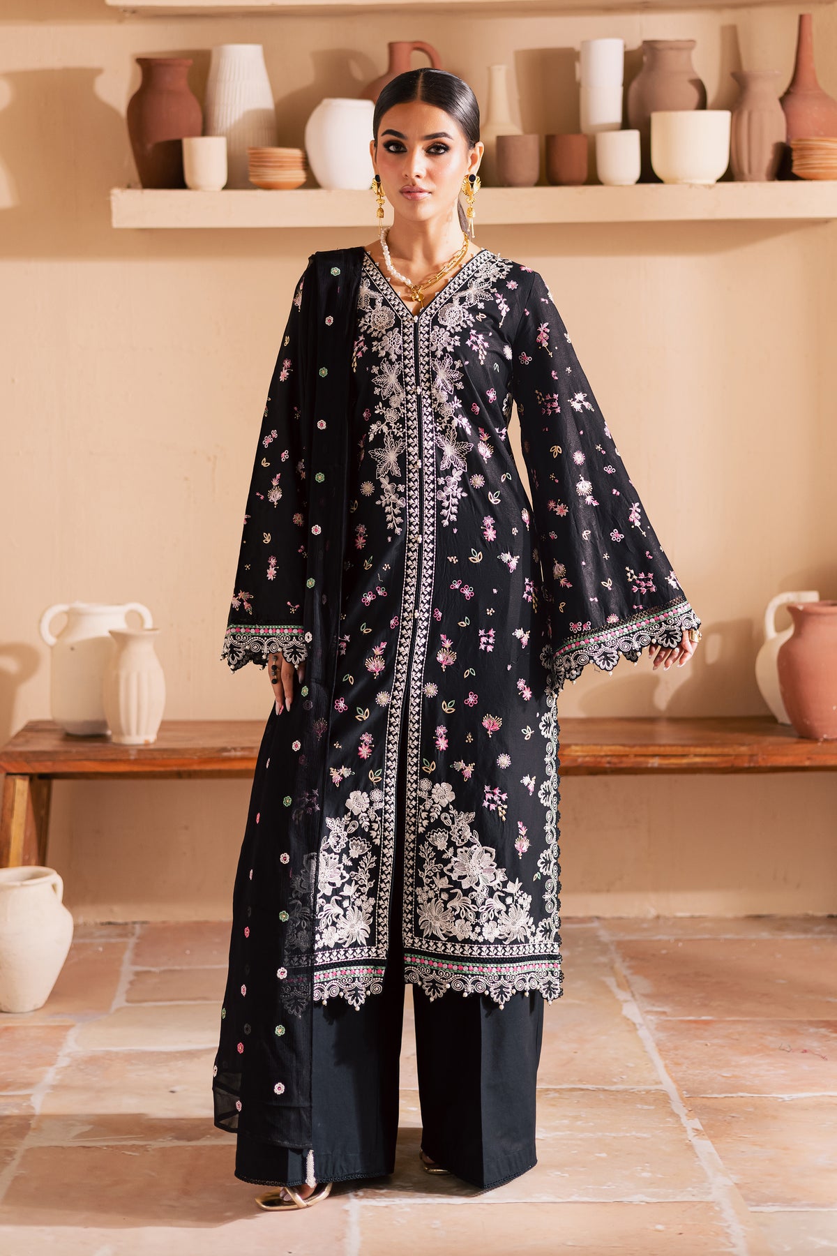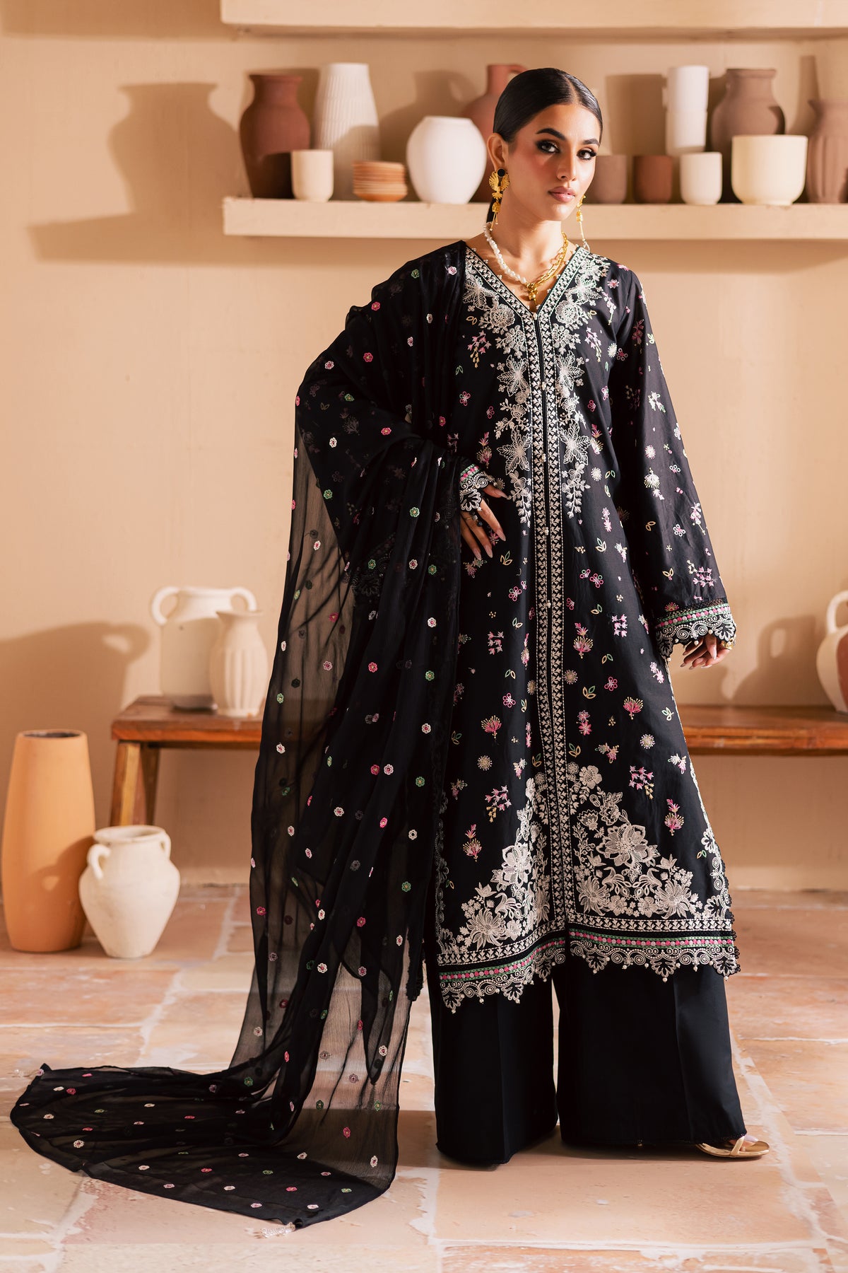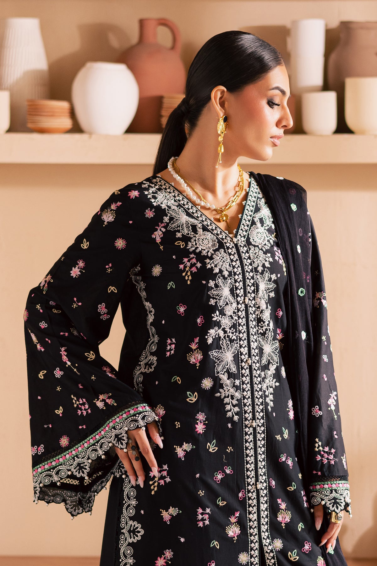 A front-open embroidered pima lawn black shirt crafted from jet black pima fabric, featuring a heavily embroidered front and hem for a striking, festive look. Pearl detailing along the neckline, sleeve hem, and shirt hem adds a touch of elegance, while delicate lace along the side chalk completes the design with graceful finesse.