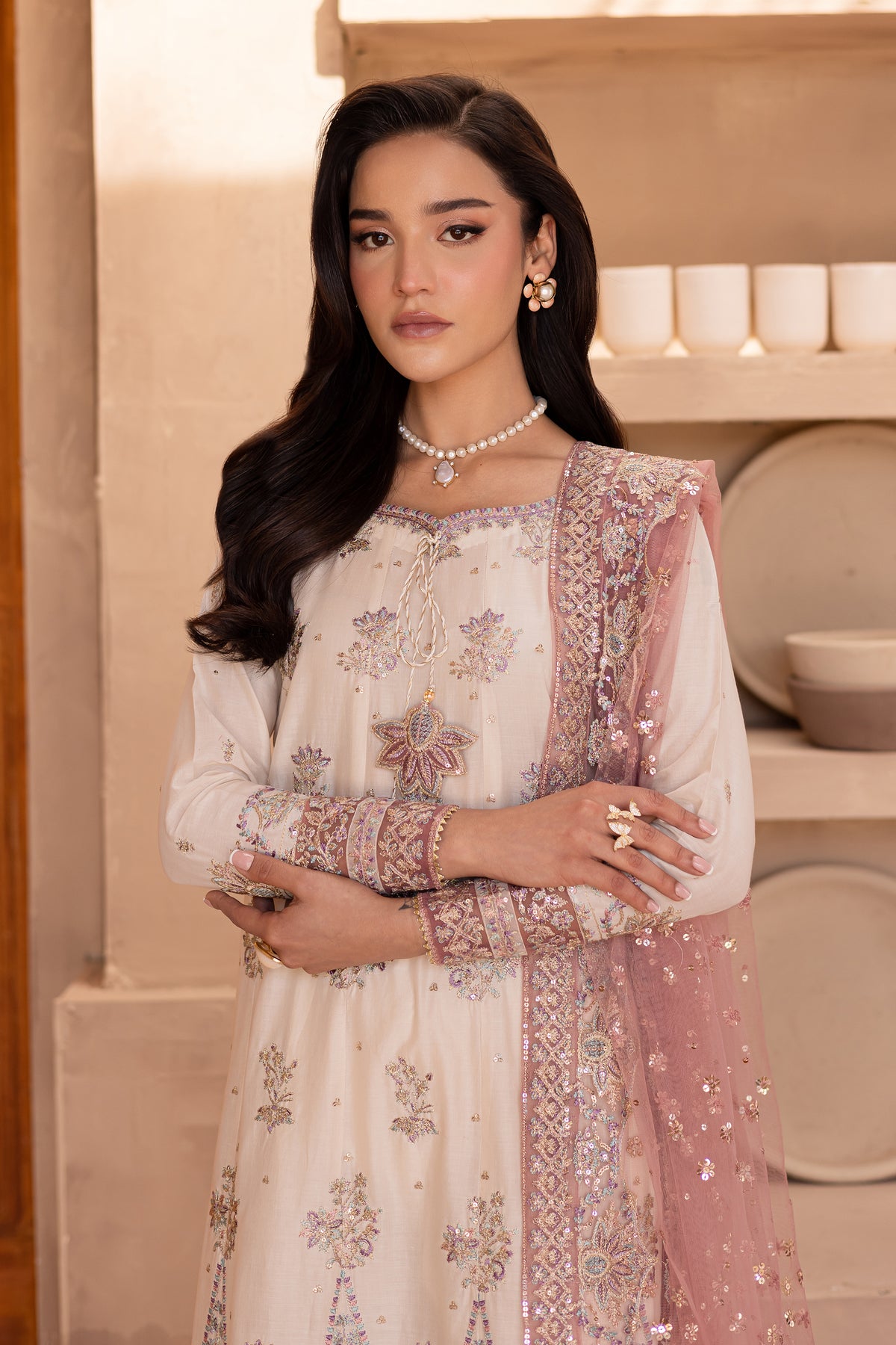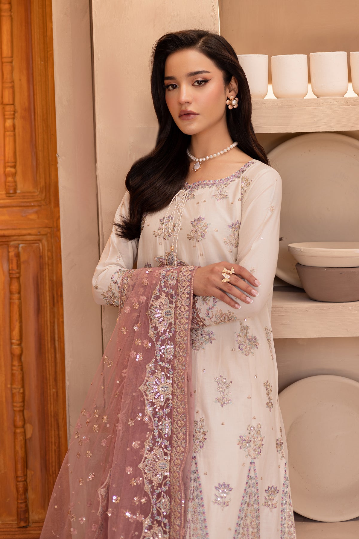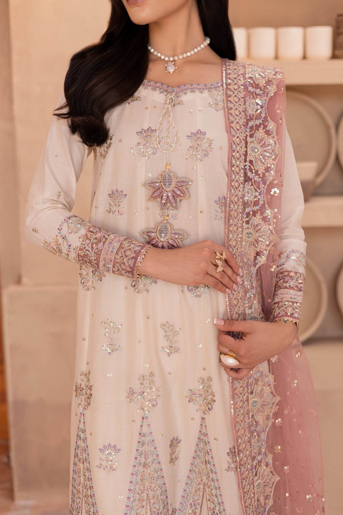 This heavy embroidered pima lawn paneled frock features a stunning embroidery spread across the body, enhanced with an organza neckline appliqué adorned with tassels. The frock is finished with contrast organza borders, adding a vibrant touch to the design.The filled sleeves are embroidered with delicate detailing and organza borders, creating a refined and sophisticated look. The back of the frock also features embroidered borders, tying the design together beautifully.