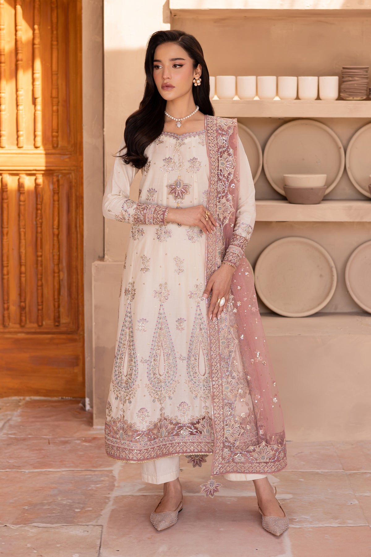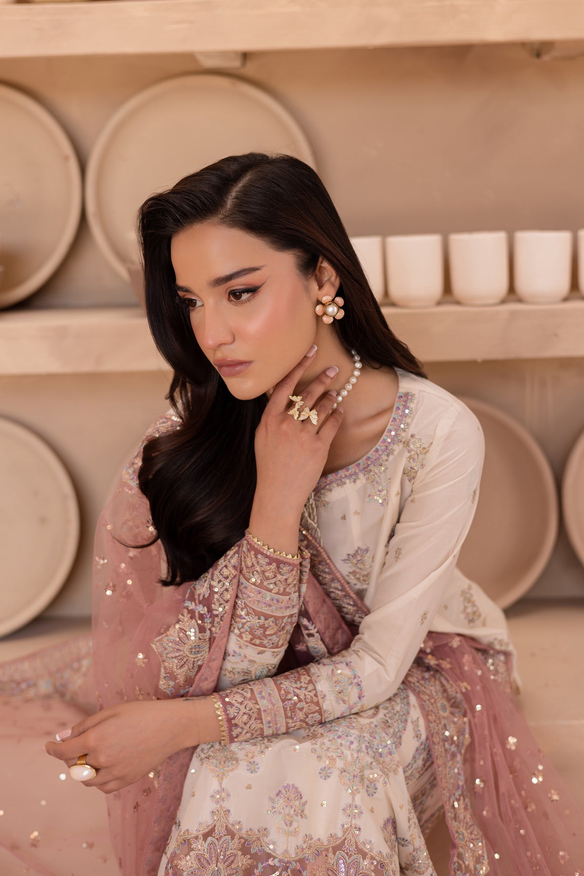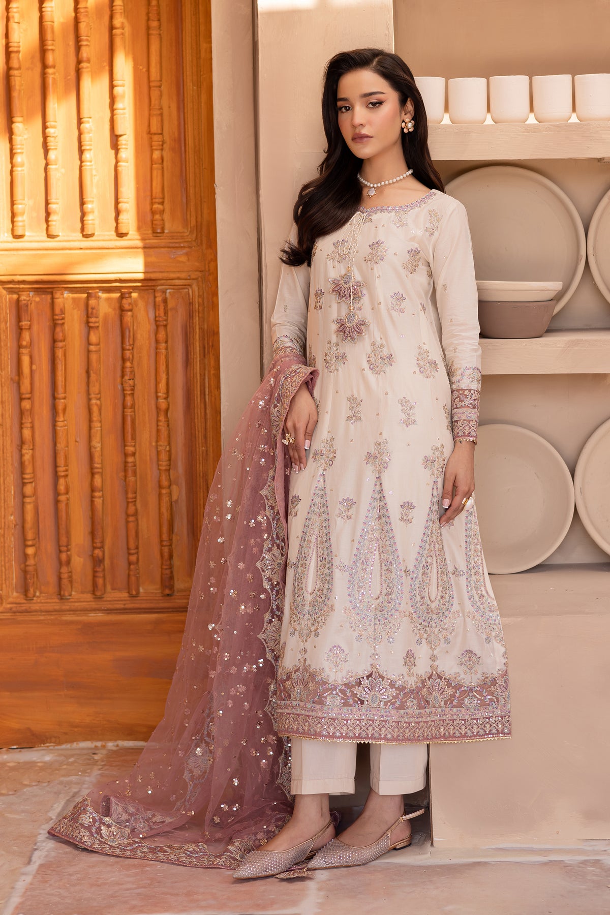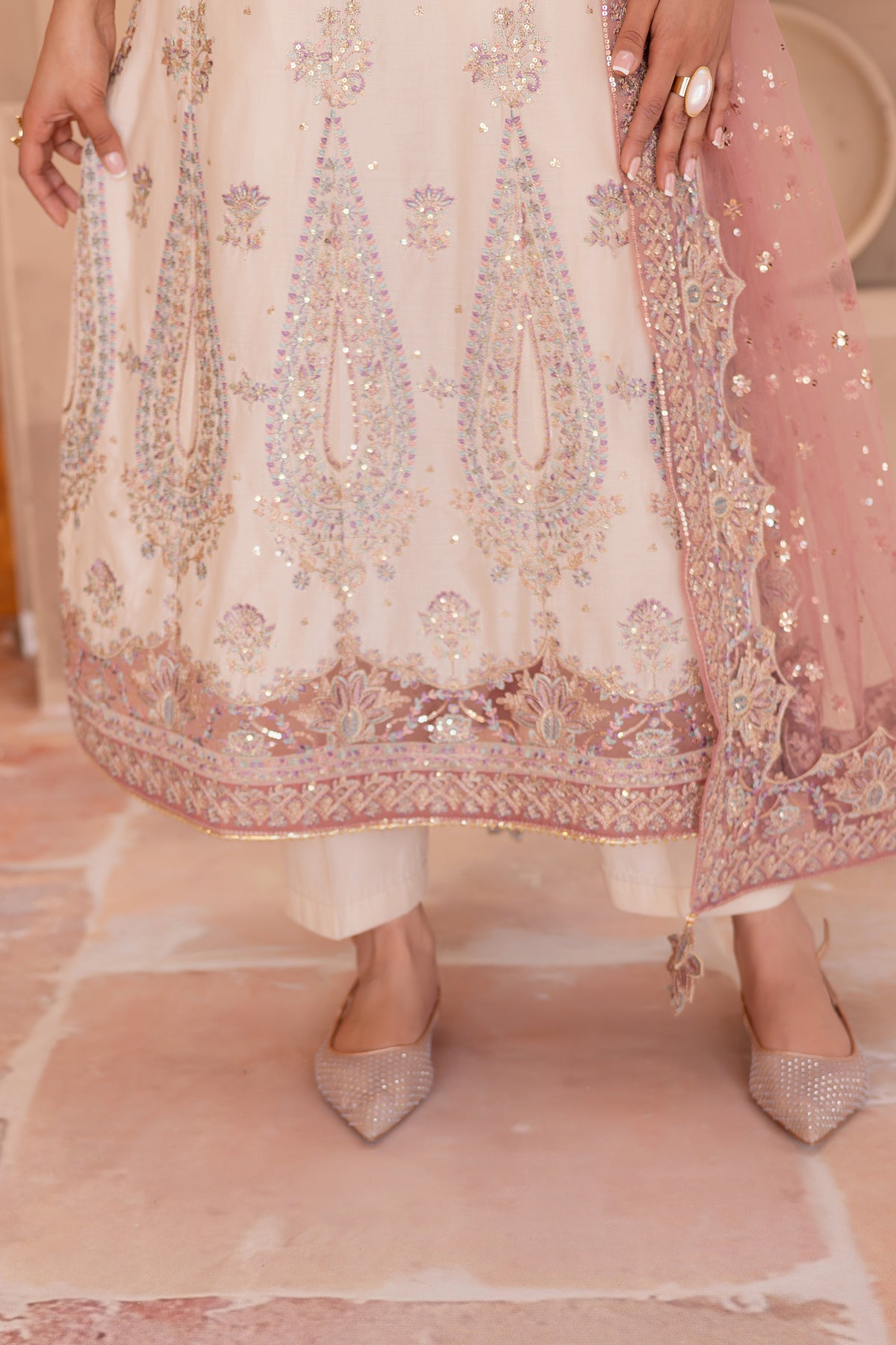 This heavy embroidered pima lawn paneled frock features a stunning embroidery spread across the body, enhanced with an organza neckline appliqué adorned with tassels. The frock is finished with contrast organza borders, adding a vibrant touch to the design.The filled sleeves are embroidered with delicate detailing and organza borders, creating a refined and sophisticated look. The back of the frock also features embroidered borders, tying the design together beautifully.