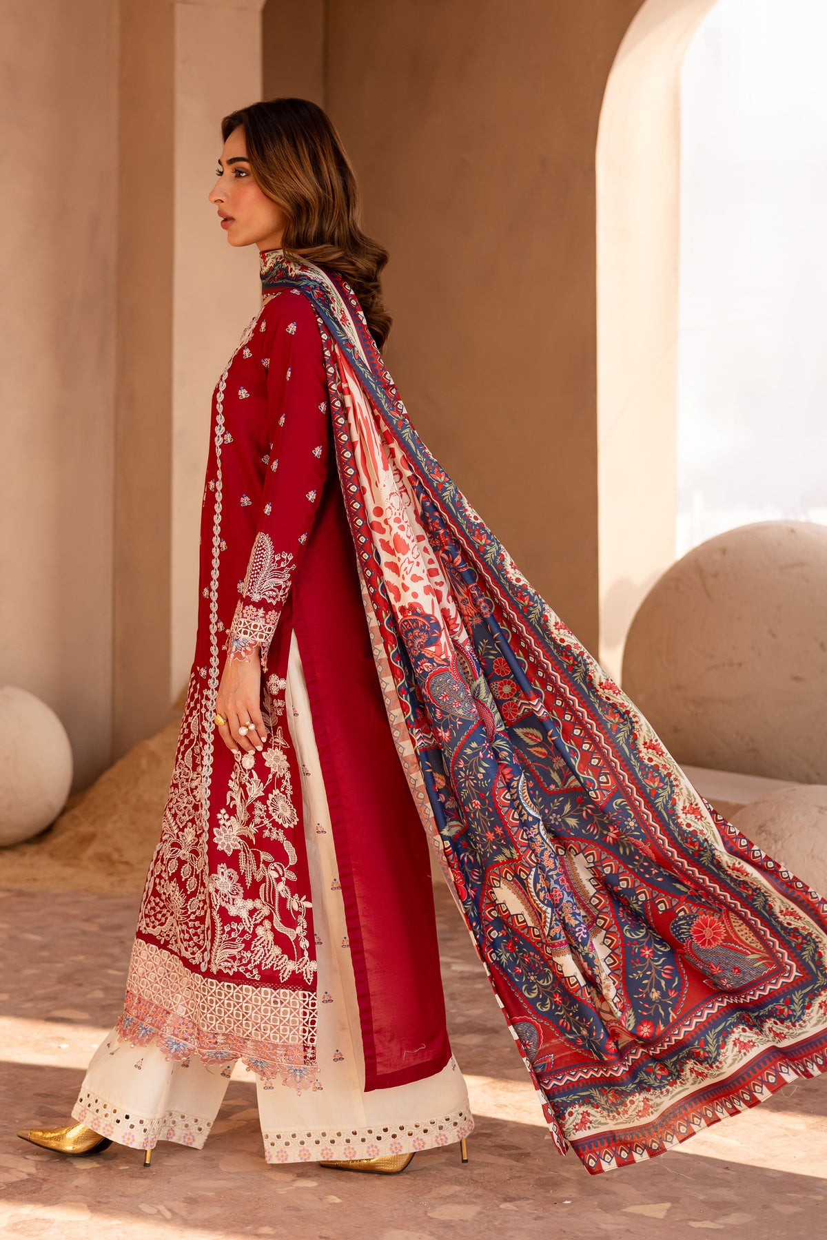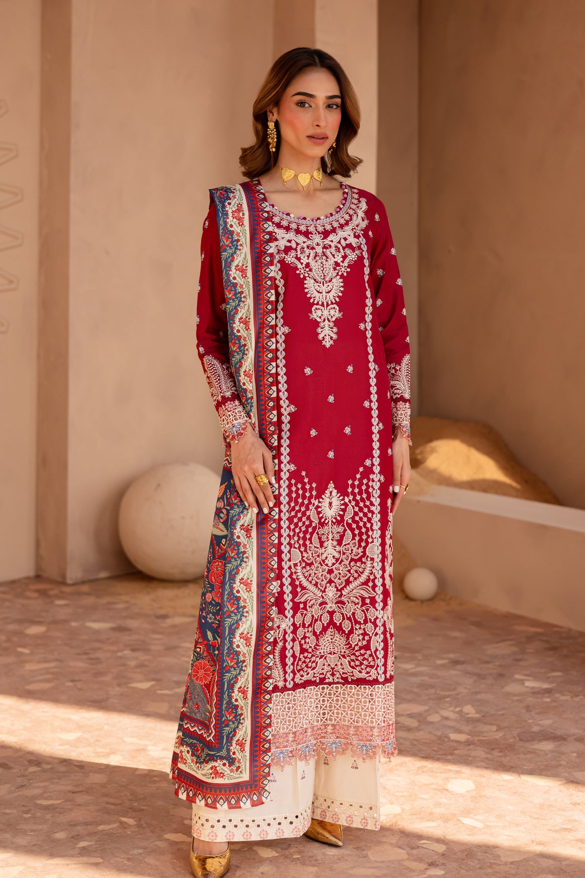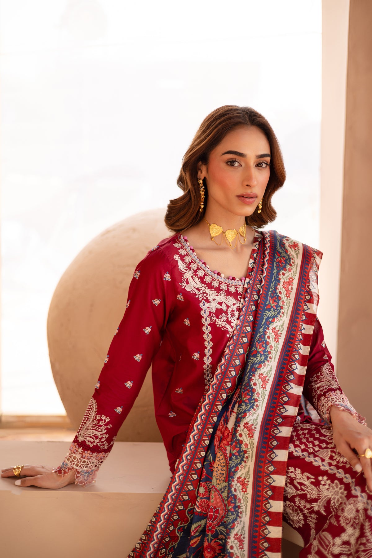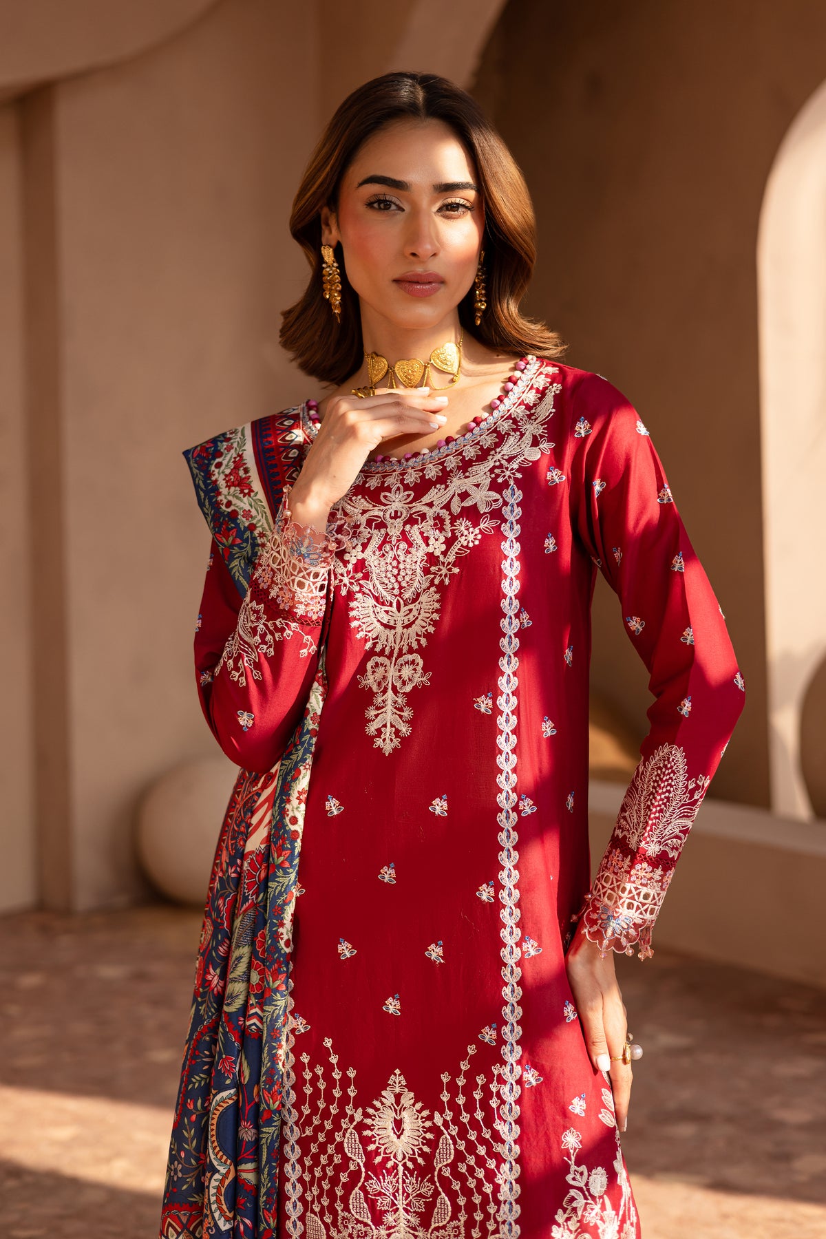 In a rich rumba red hue, this long-paneled pima lawn shirt is adorned with composed embroidery that exudes elegance. The hemline is accentuated with geometric and arched scalloped motif borders, creating a sophisticated contrast. Colored fabric ball detailing along the neckline edge adds a distinctive, playful touch.