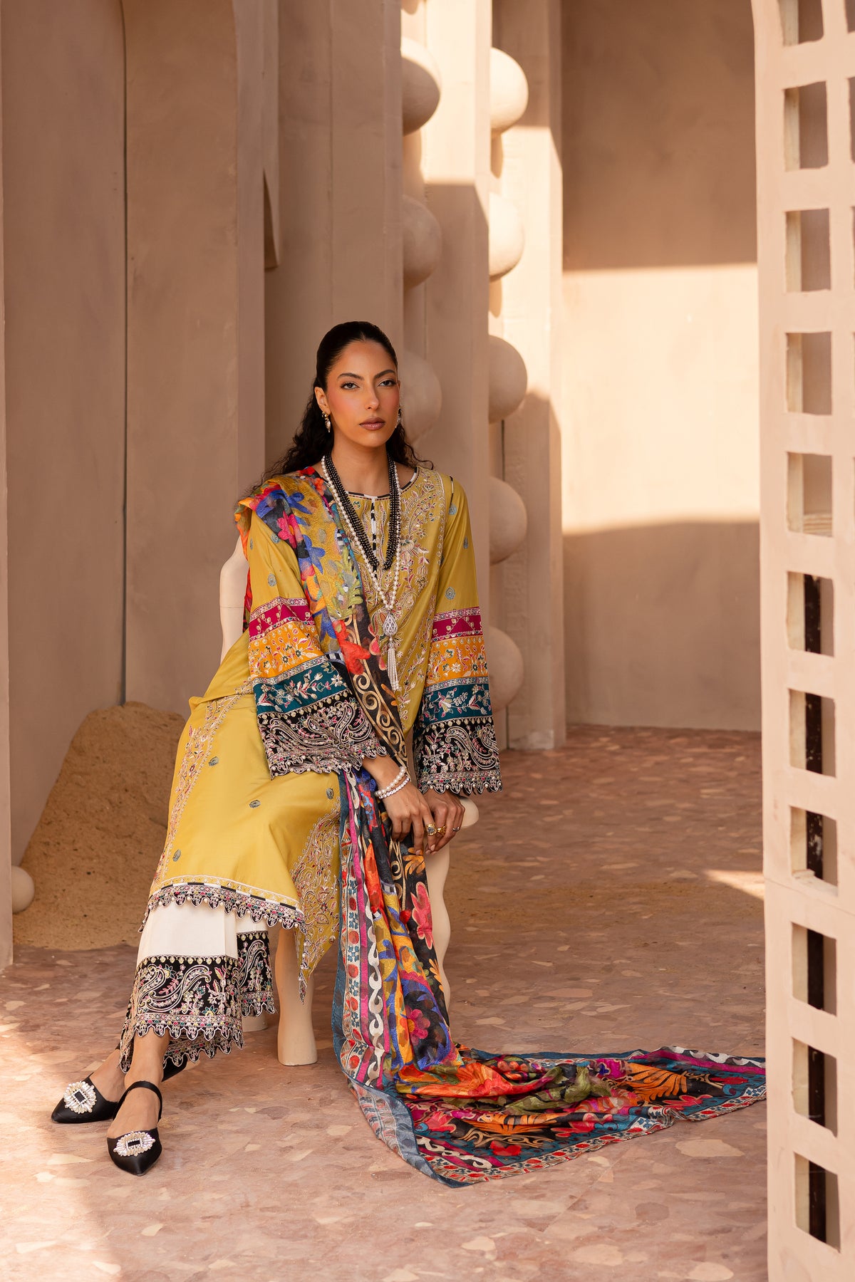 In a vibrant lime green hue, this exquisite three-piece ensemble is crafted from premium Pima Lawn. The paneled shirt is beautifully adorned with composed embroidery on the side panels, complemented by an intricately designed neckline and a stunning center spread. Contrasting borders on the sleeves and hem add a bold yet elegant touch.