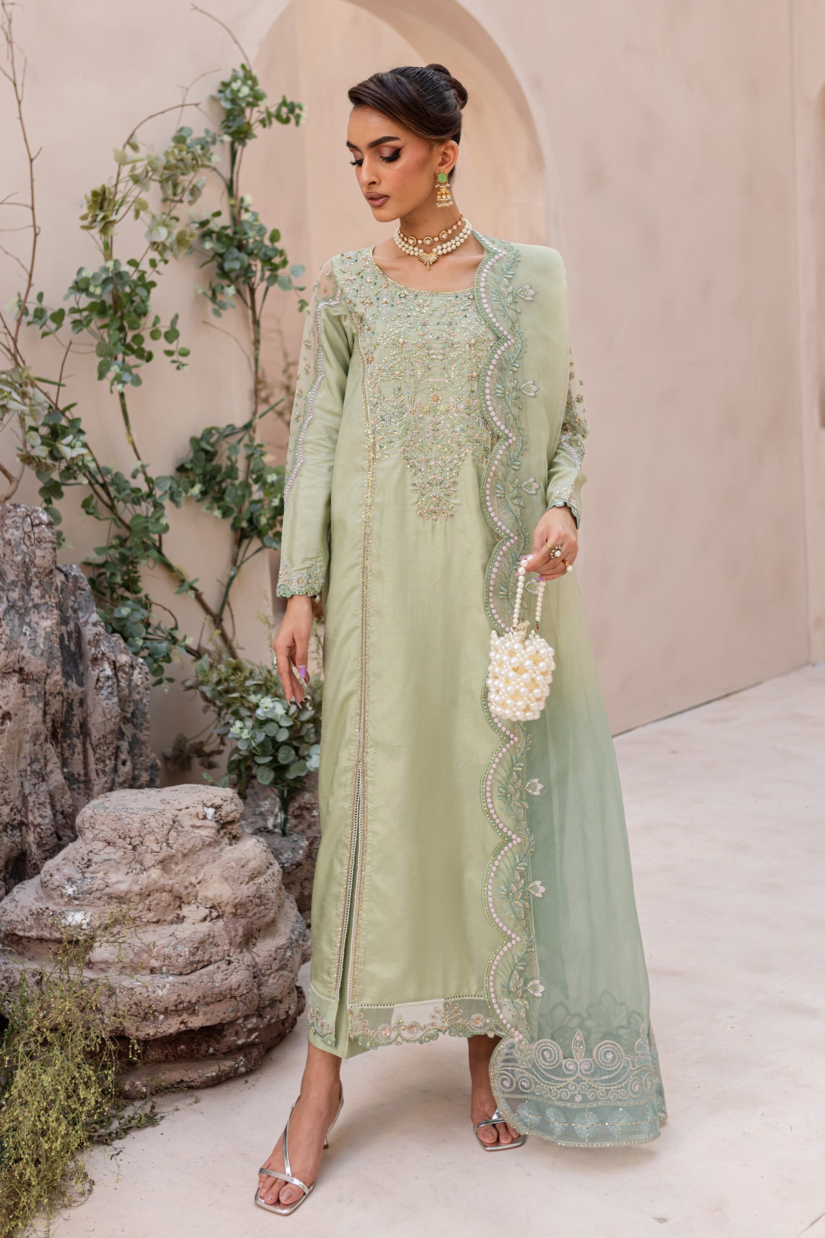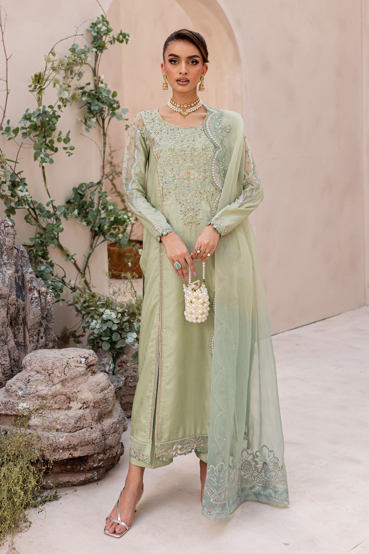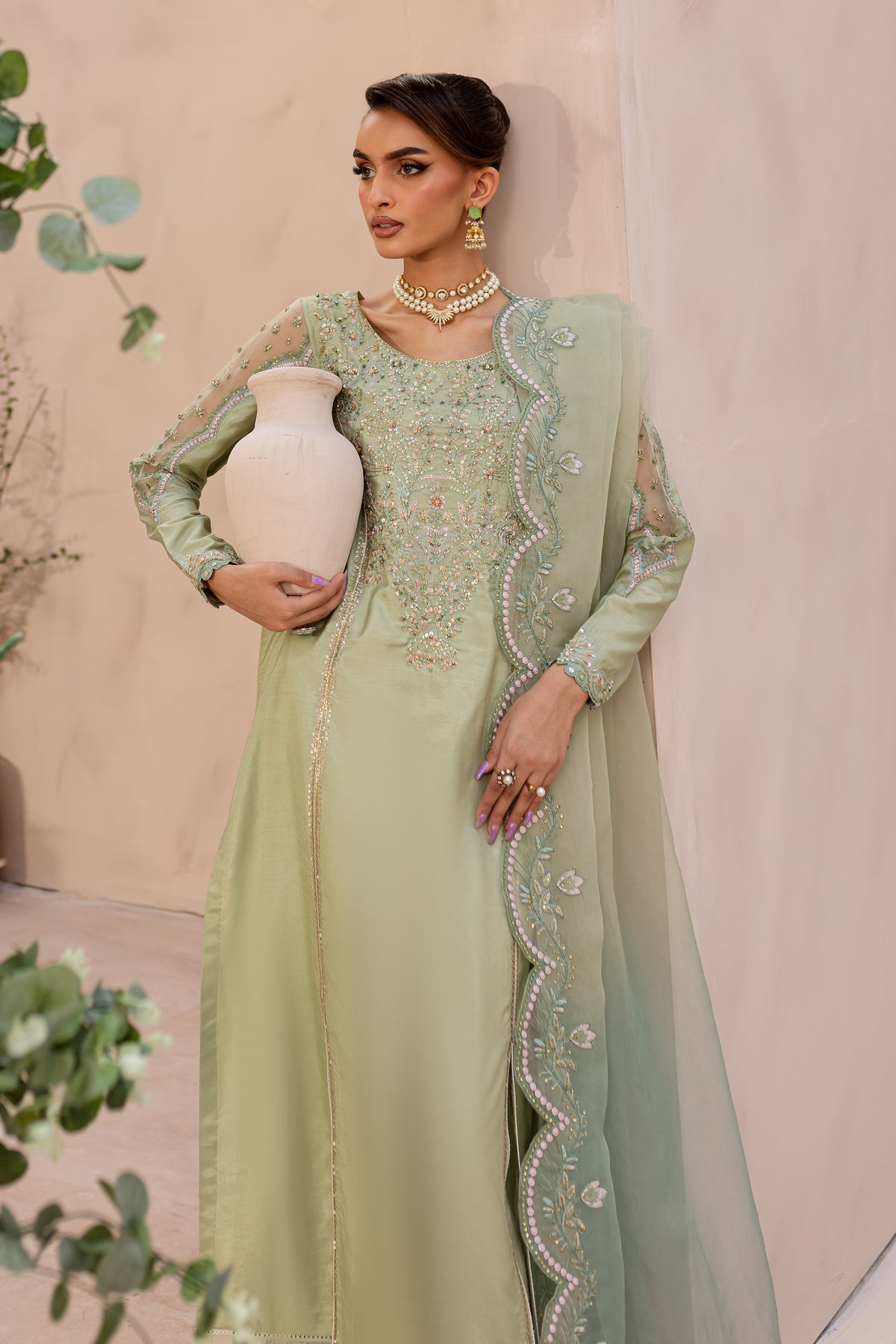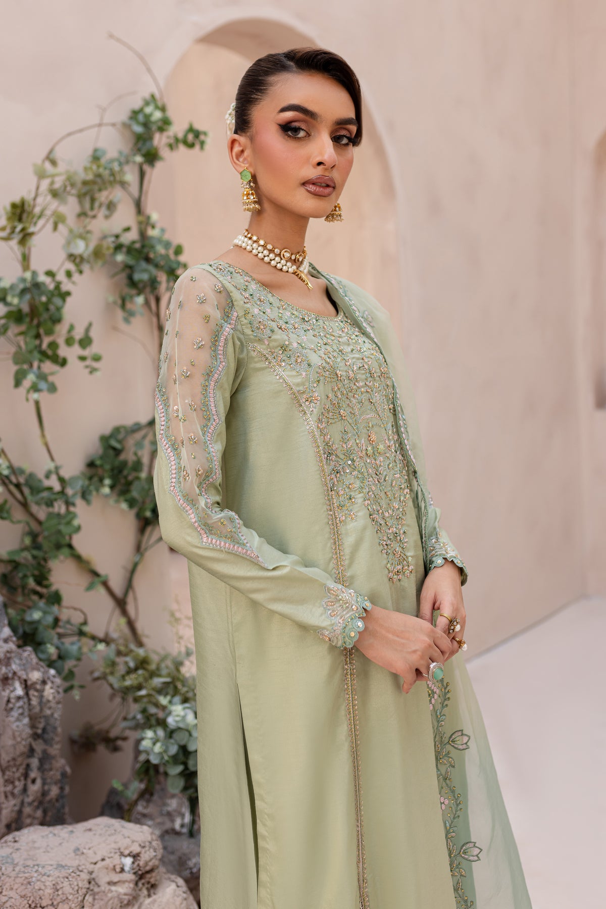 Introducing our pistachio-colored masterpiece in poly raw silk. The shirt boasts an intricately embellished neckline with hand-applied details, complemented by thread, sequin, and tilla embroidery. Two slits starting below the knee add a modern touch, while the sleeves feature organza cut-out designs with hand embellishments and embroidery.