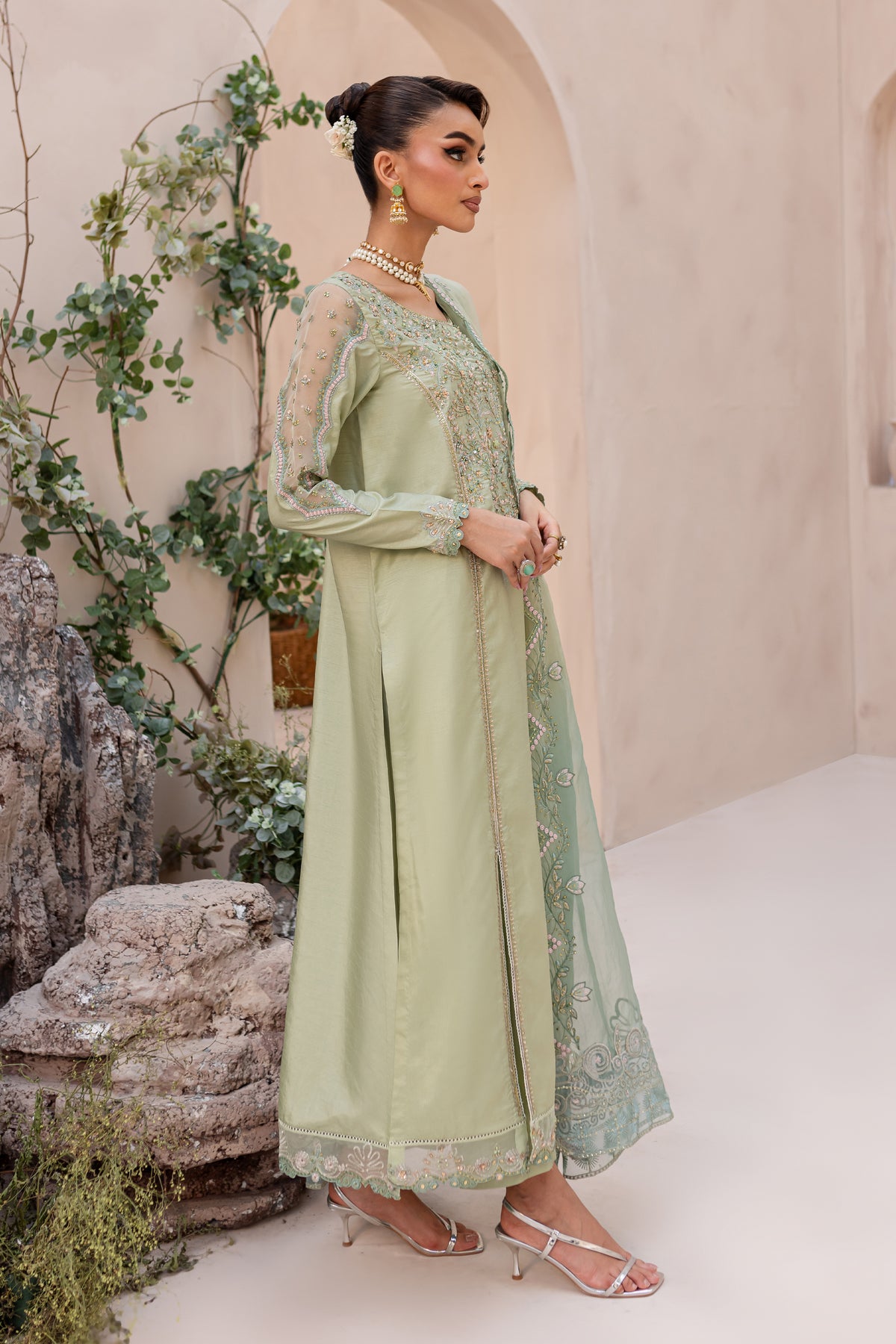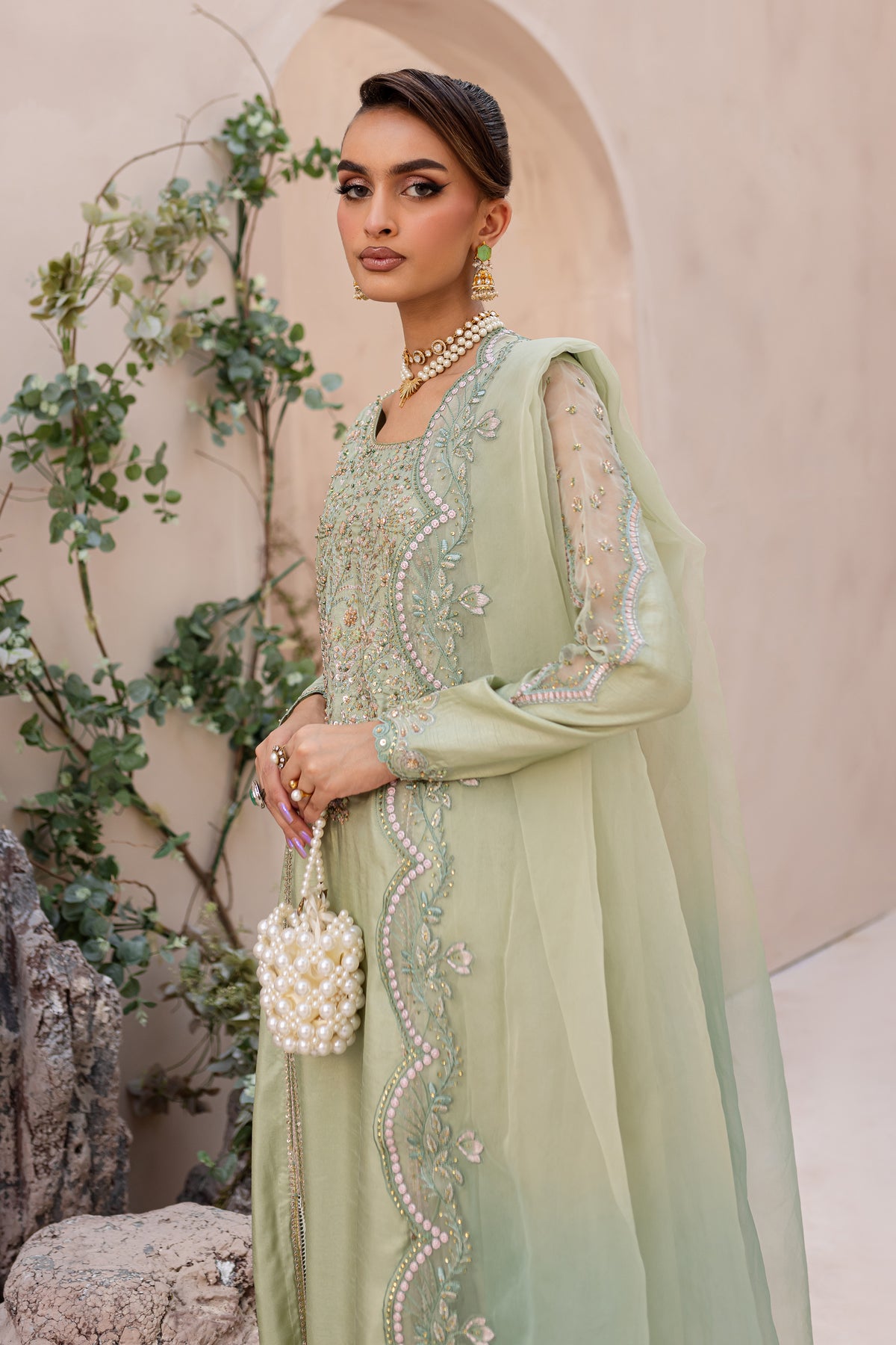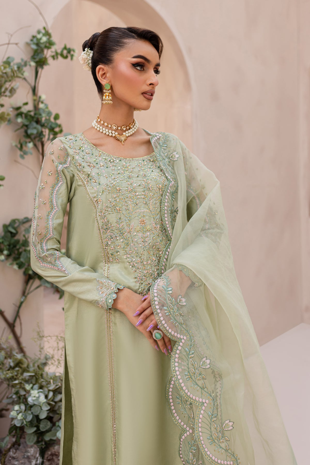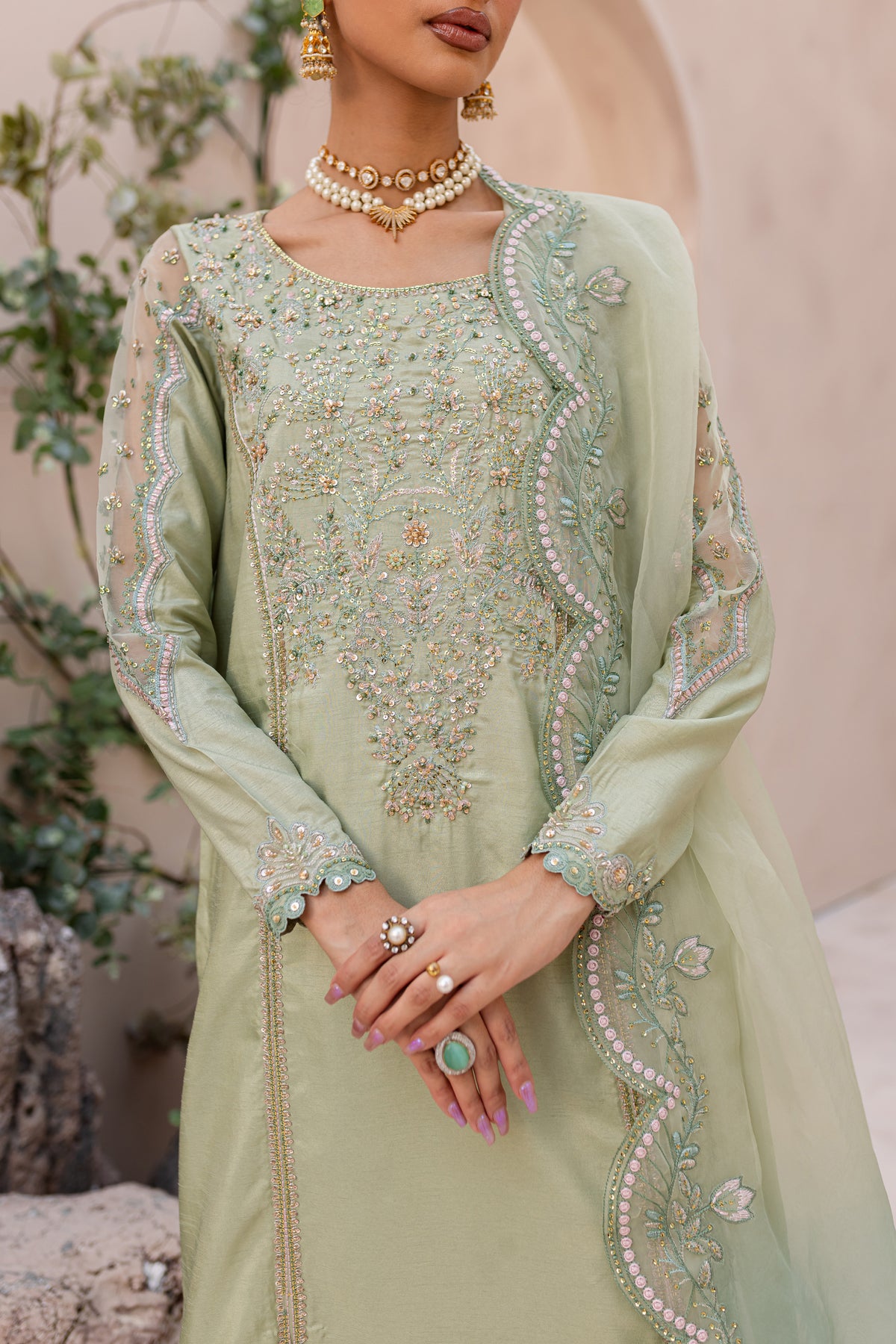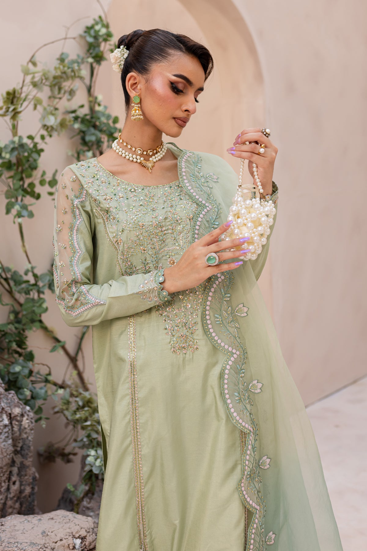 Introducing our pistachio-colored masterpiece in poly raw silk. The shirt boasts an intricately embellished neckline with hand-applied details, complemented by thread, sequin, and tilla embroidery. Two slits starting below the knee add a modern touch, while the sleeves feature organza cut-out designs with hand embellishments and embroidery.
