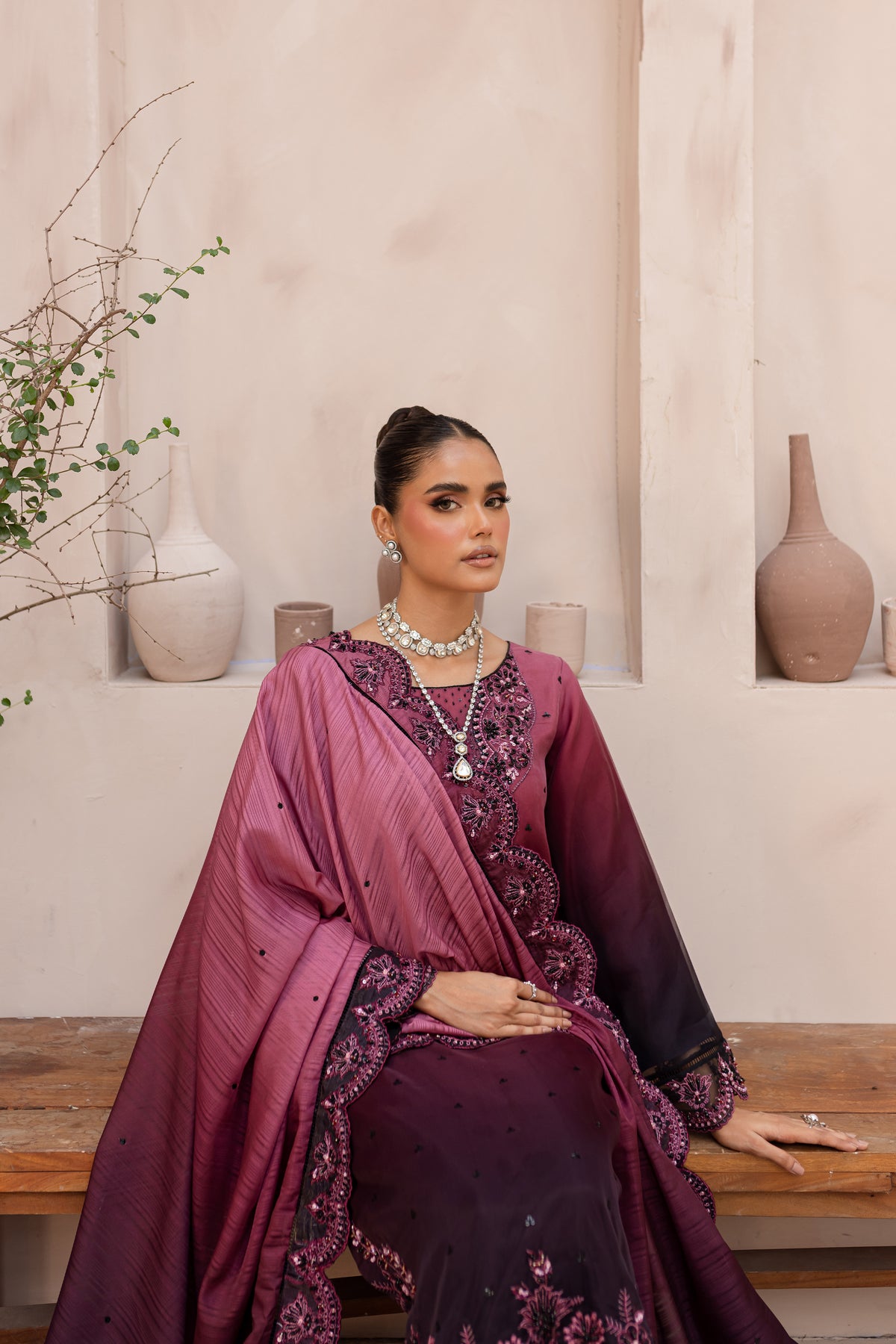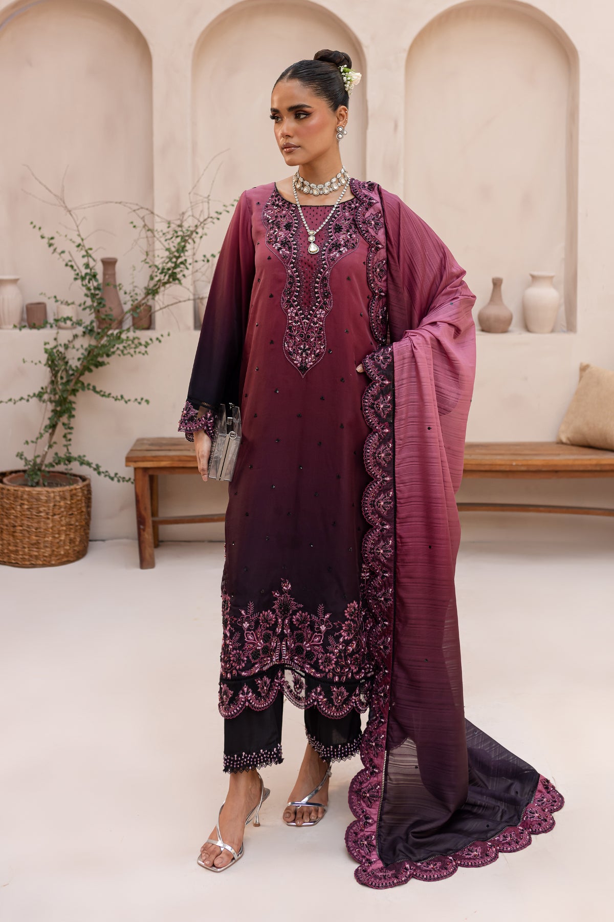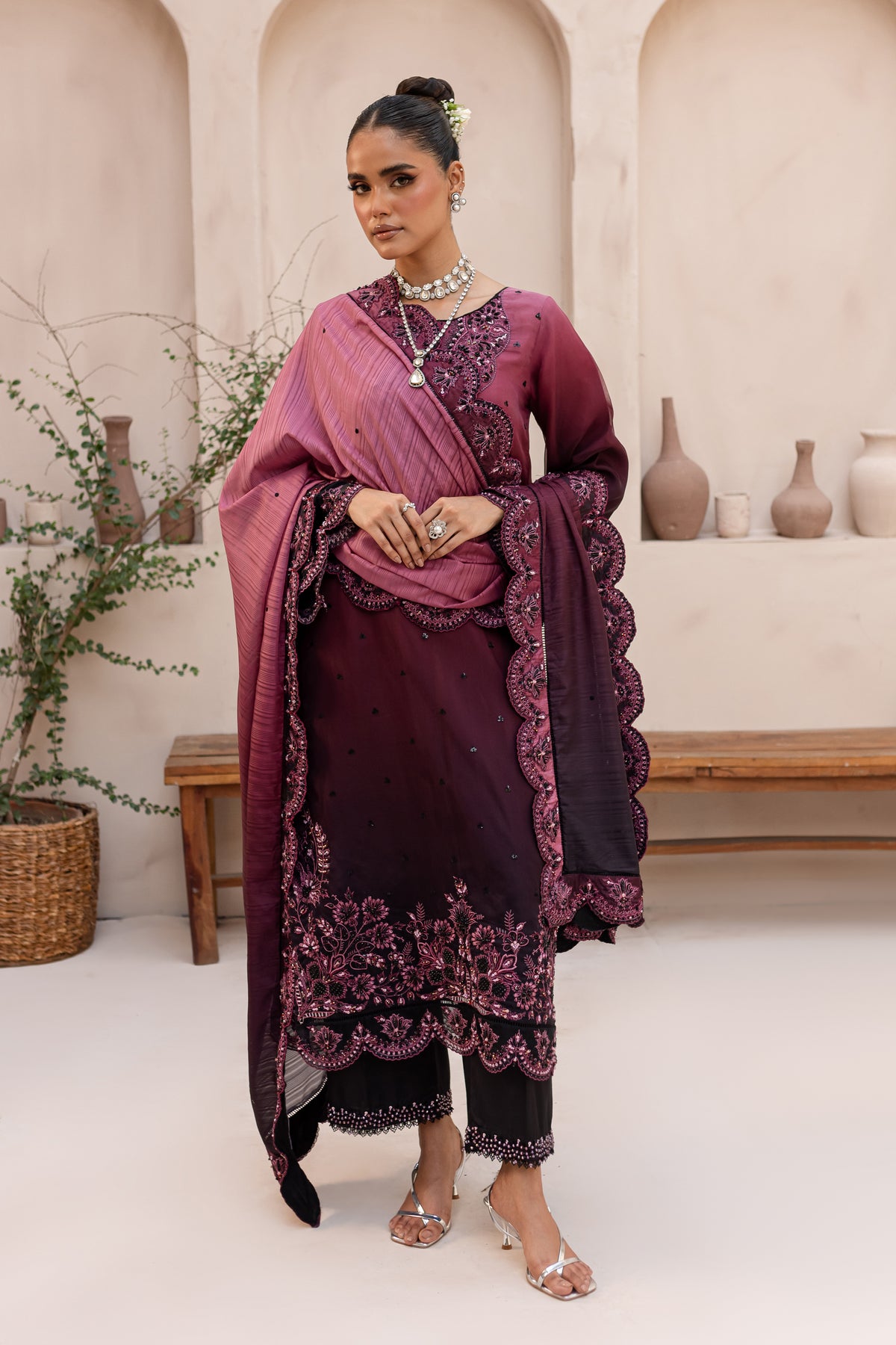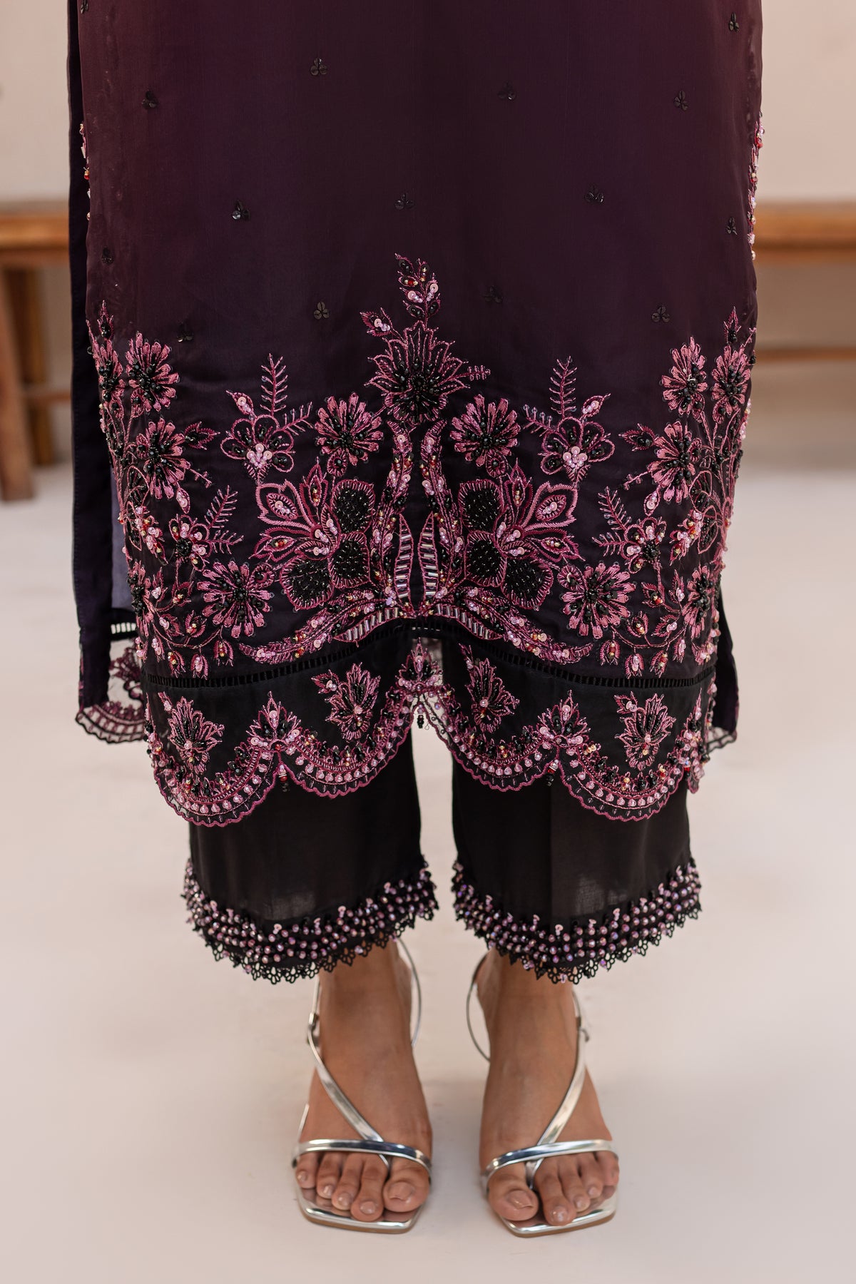 Unveil the allure of black with this striking ensemble that balances the beauty of organza, poly raw silk, and chiku silk. The black ombré organza shirt is richly embellished with thread, tilla, and sequins alongside chunky hand-applied detailing with beads, pearls, and sequins. The heavy embellishments across the shirt make it a true showstopper.