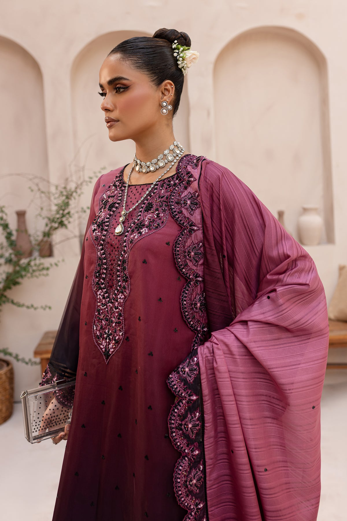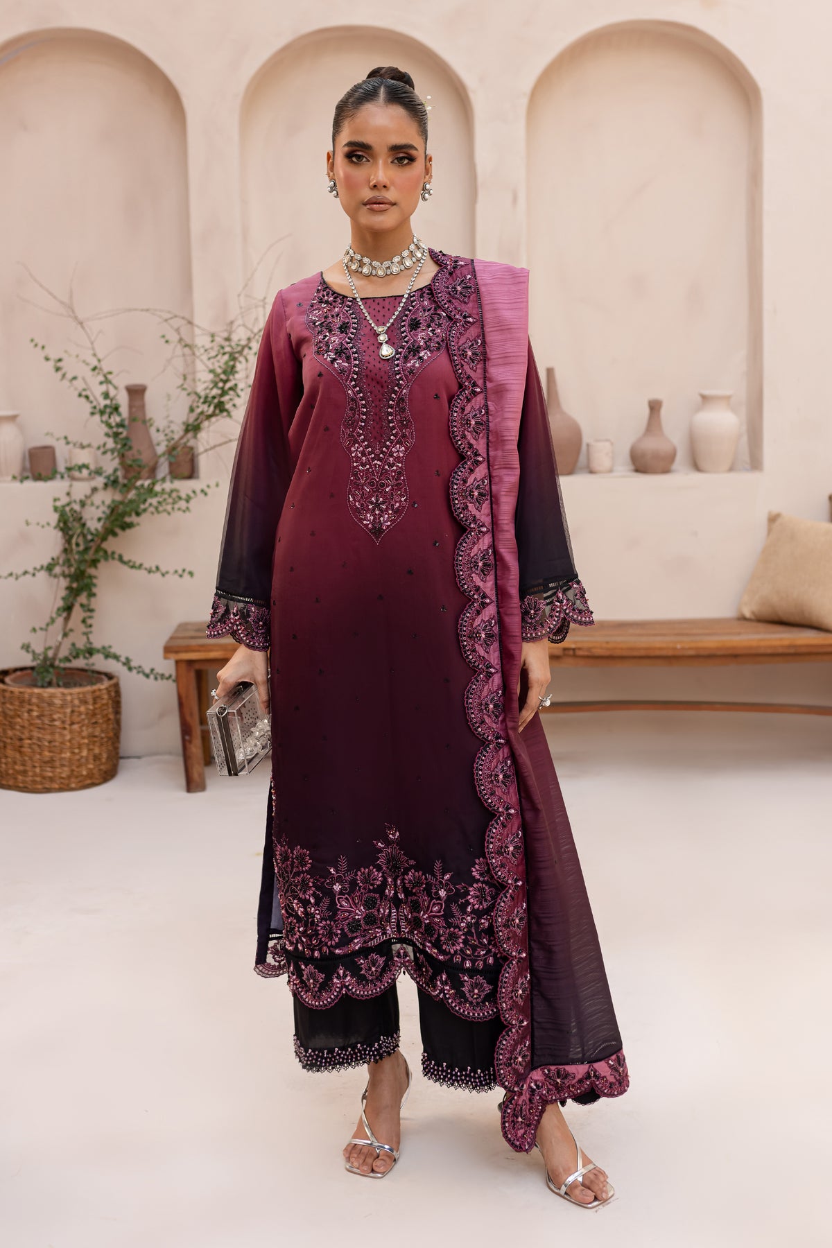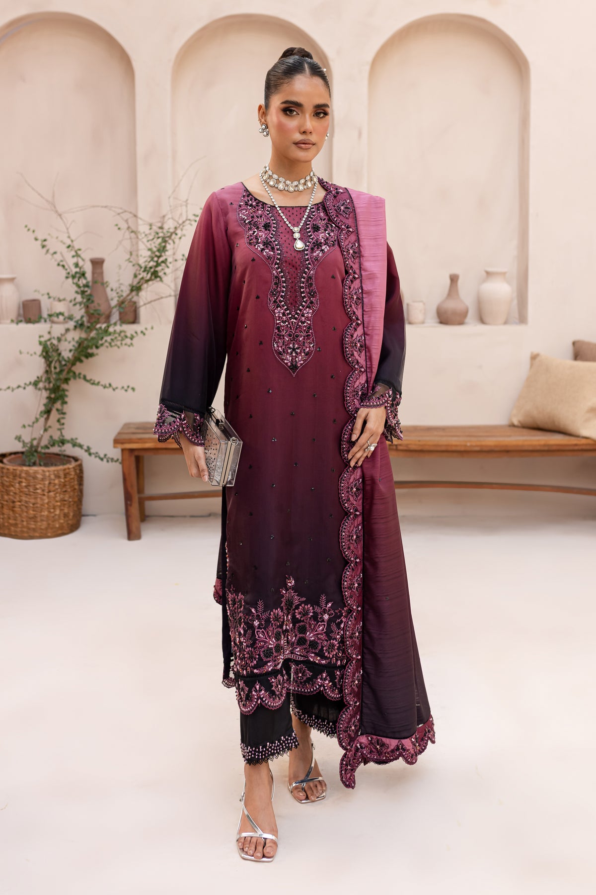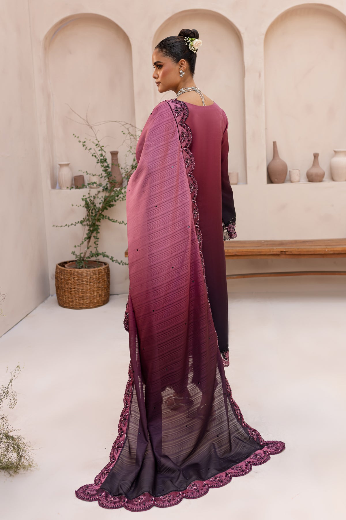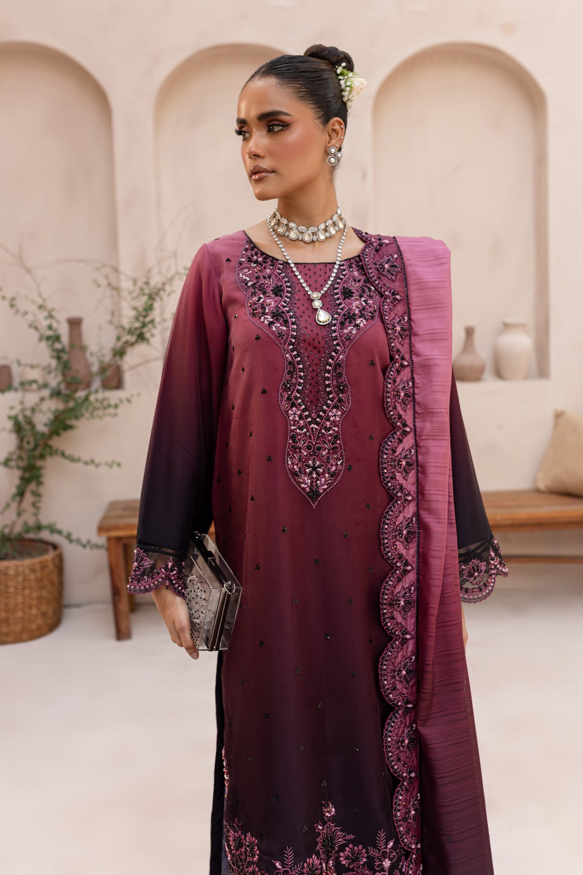 Unveil the allure of black with this striking ensemble that balances the beauty of organza, poly raw silk, and chiku silk. The black ombré organza shirt is richly embellished with thread, tilla, and sequins alongside chunky hand-applied detailing with beads, pearls, and sequins. The heavy embellishments across the shirt make it a true showstopper.