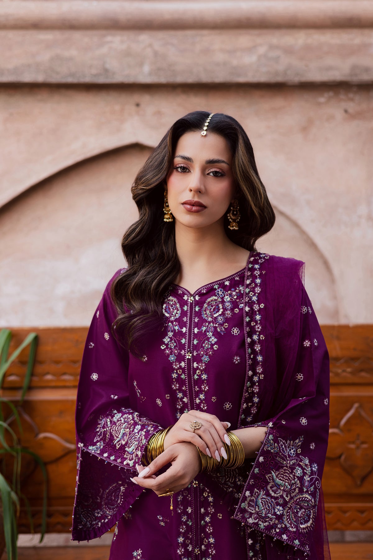 A net embroidered dupatta completes the ensemble, introducing softness and polished festive refinement.