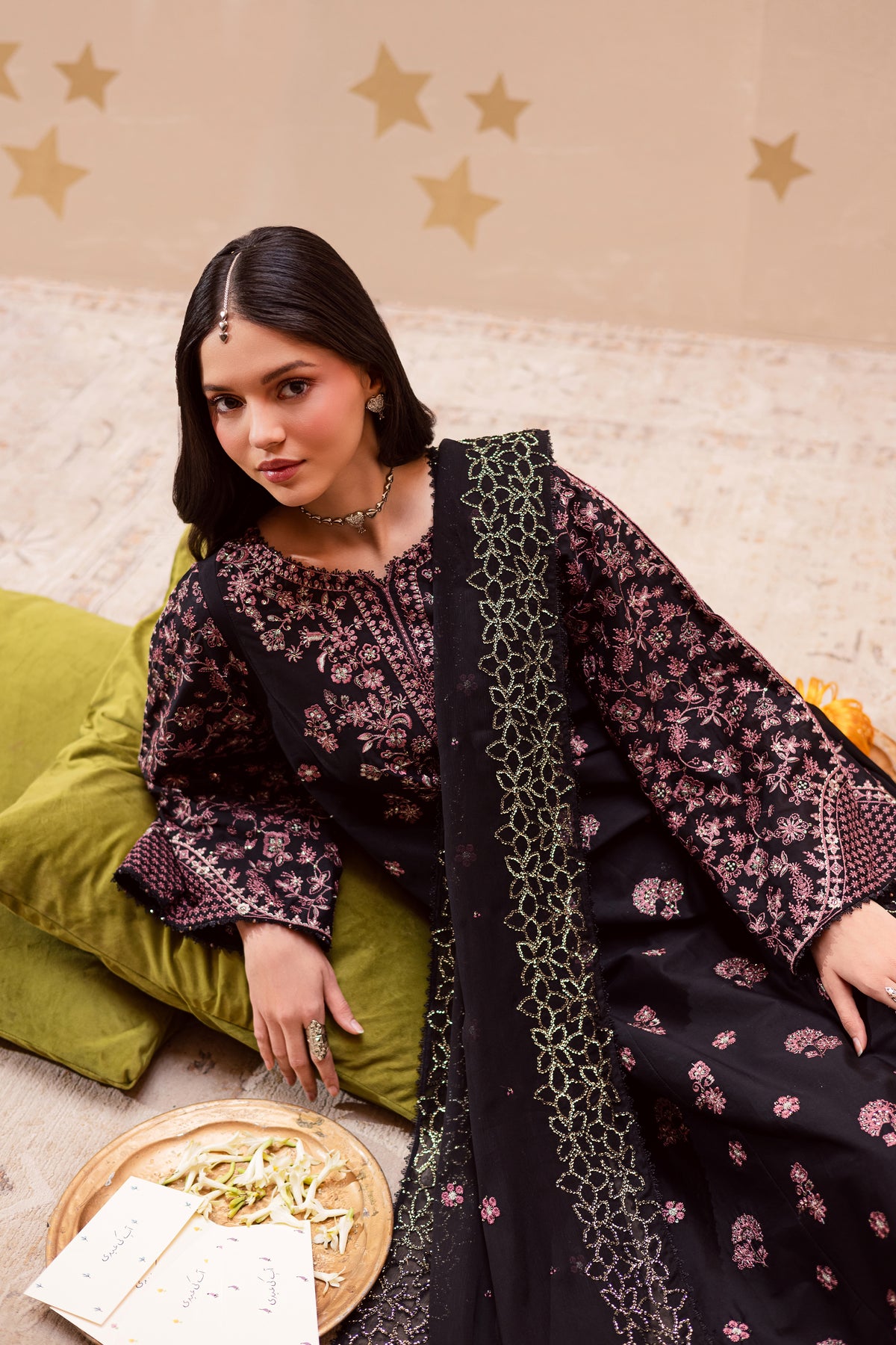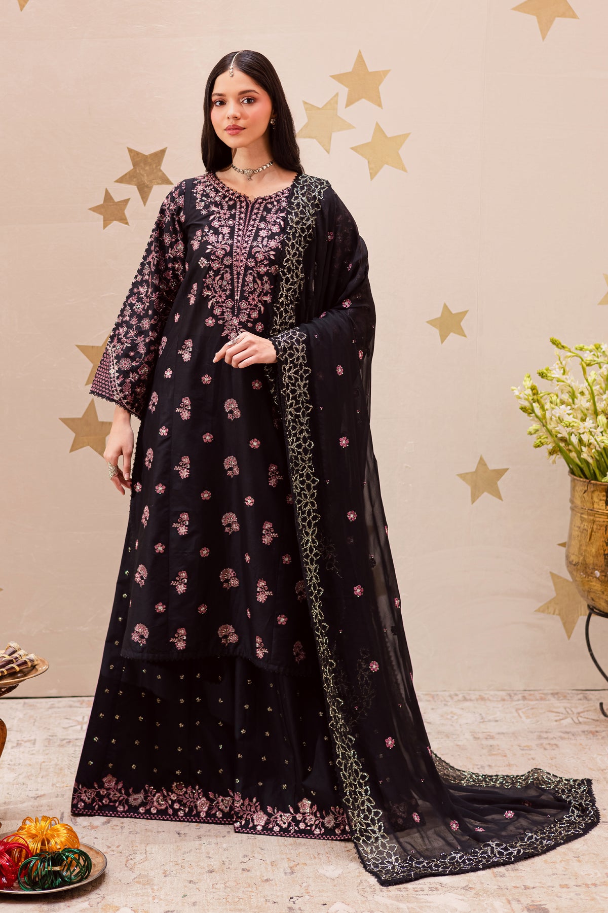 This three-piece ensemble features a black intricately embroidered shirt with sleeves, richly detailed with heavy embroidery and enhanced with lace and crystal embellishments along the neckline, sleeve hems, and shirt hem. The luminous accents elevate the silhouette into a striking formal festive statement.