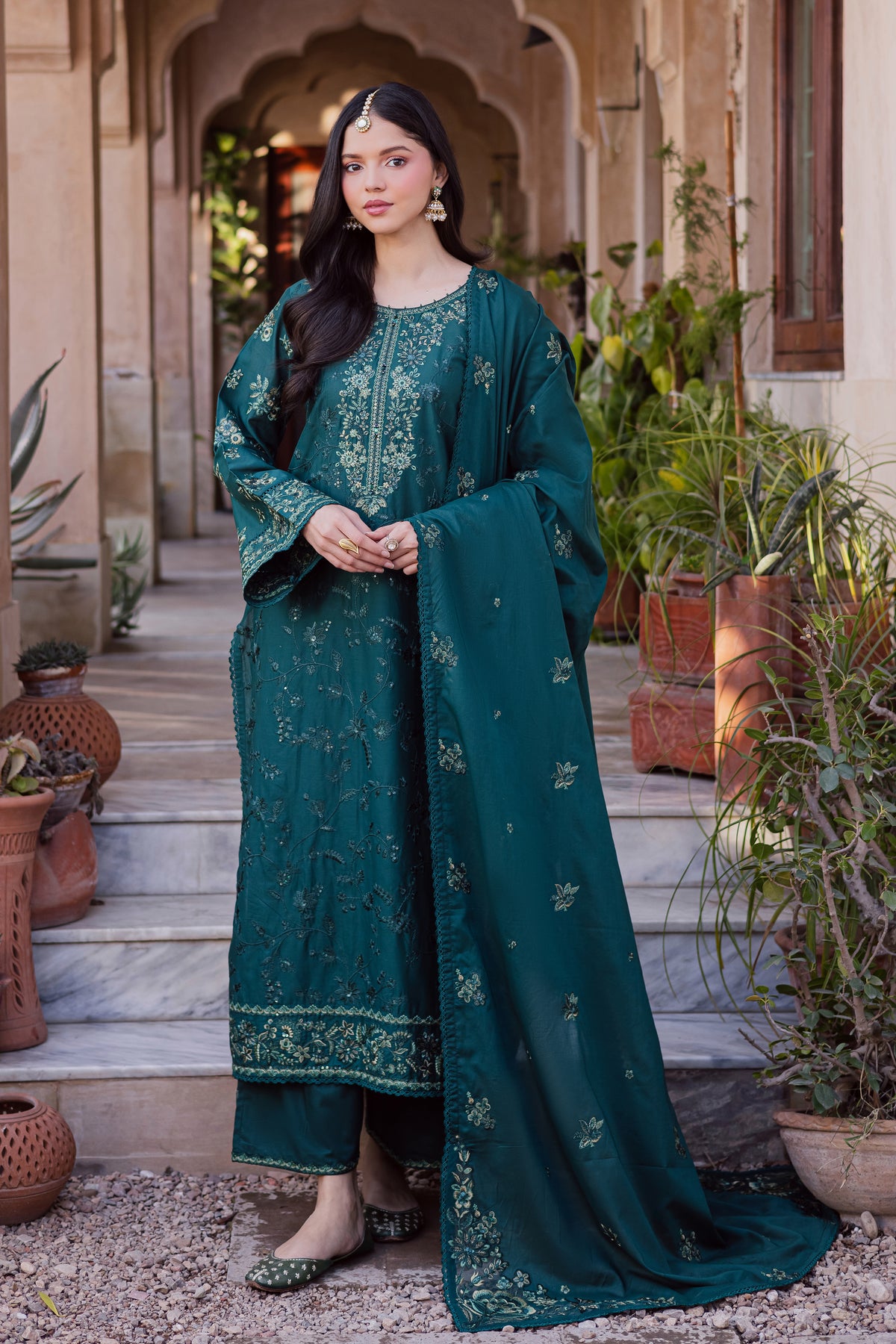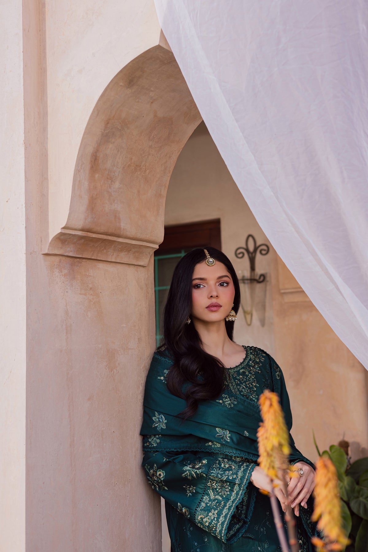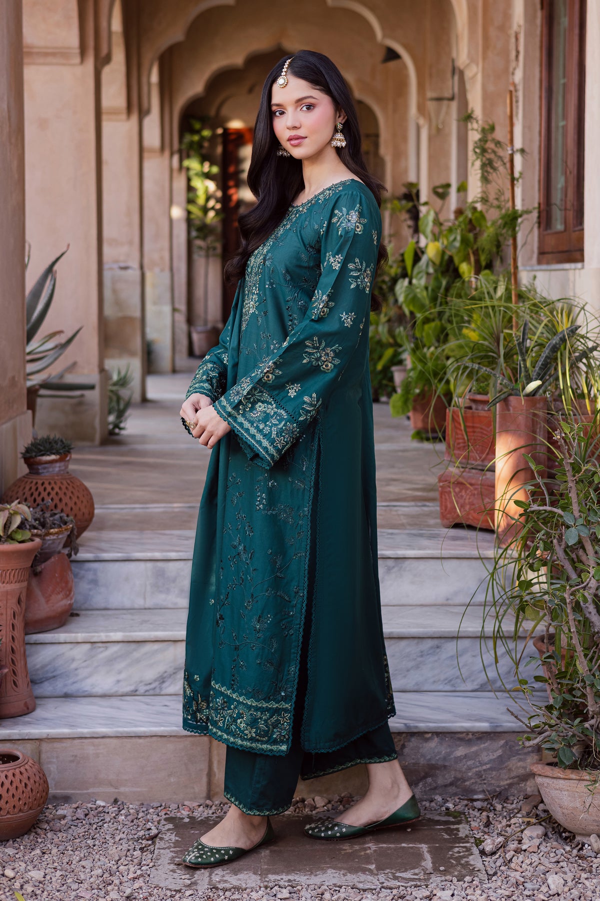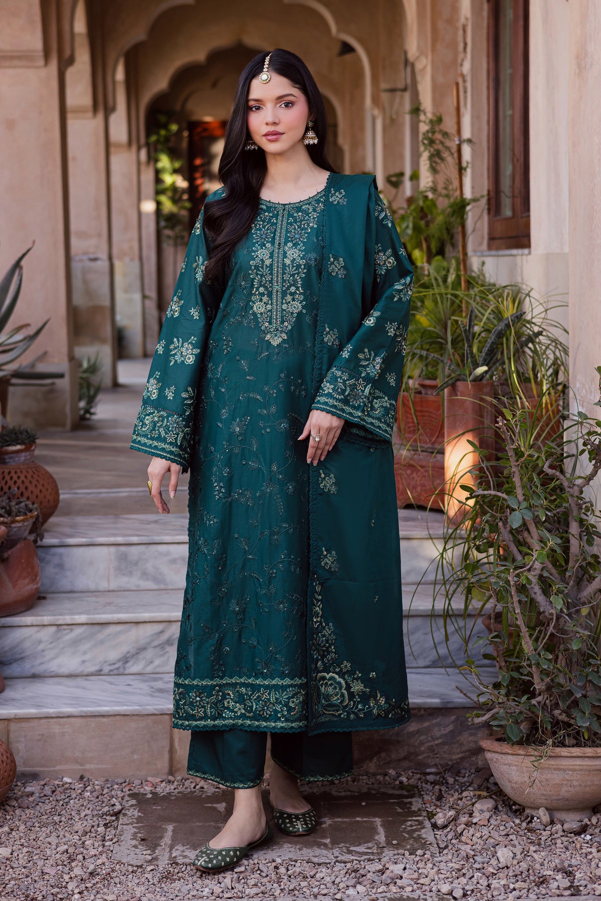 An embroidered lawn dupatta completes the look, adding lightness and graceful movement to this elegant festive ensemble.