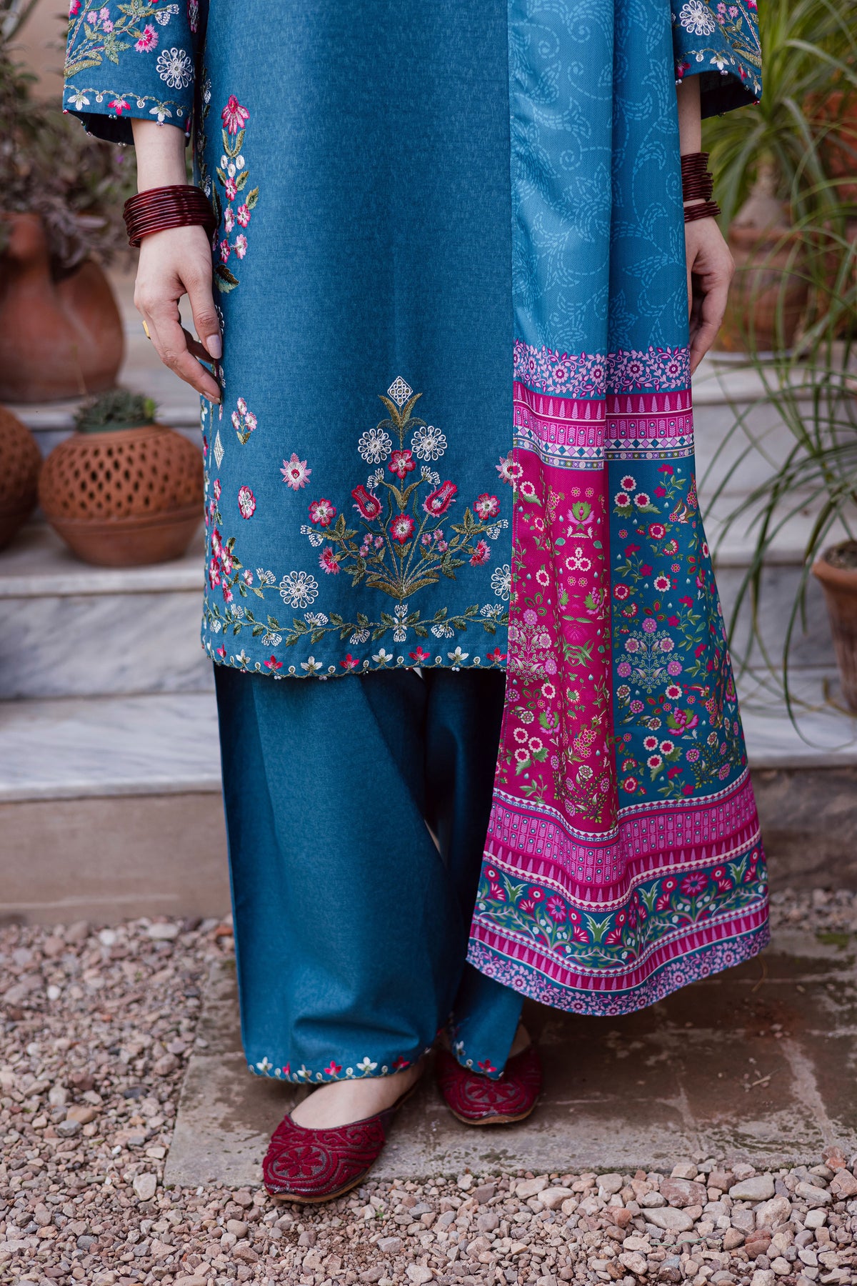 This elegant whale blue three piece karandi ensemble features an embroidered shirt crafted from soft karandi fabric, blending seasonal comfort with refined craftsmanship. The intricate embroidery adds depth and texture, making it a timeless addition to any winter wardrobe. The natural warmth of karandi enhances its graceful drape, offering both style and ease.