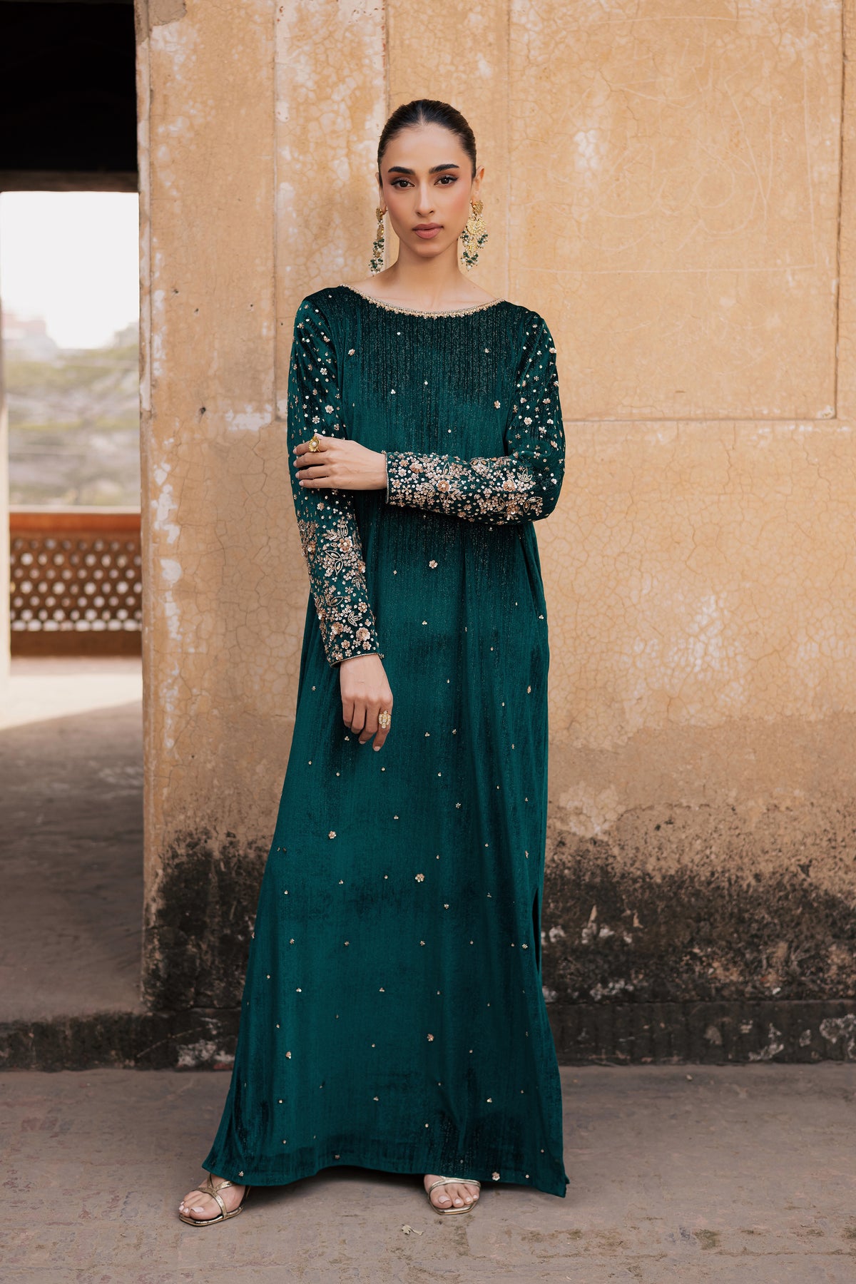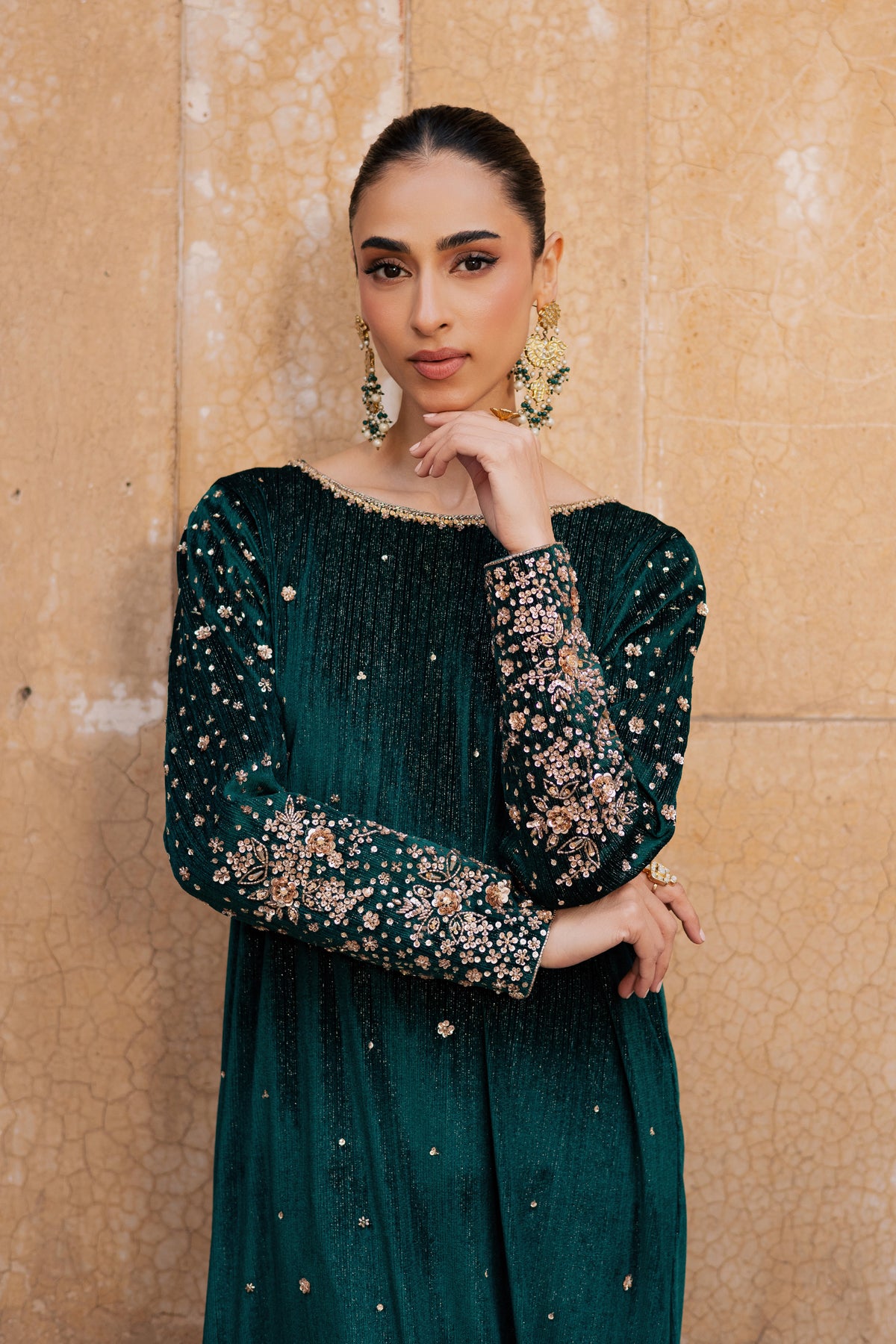 This dark green velvet shirt with zari texture features a long ankle length silhouette with full fitted sleeves and a clean boat neckline. The neckline is hand embellished with cut dana, sequins, and stone work, while adda work spread across the front adds subtle detail and texture.