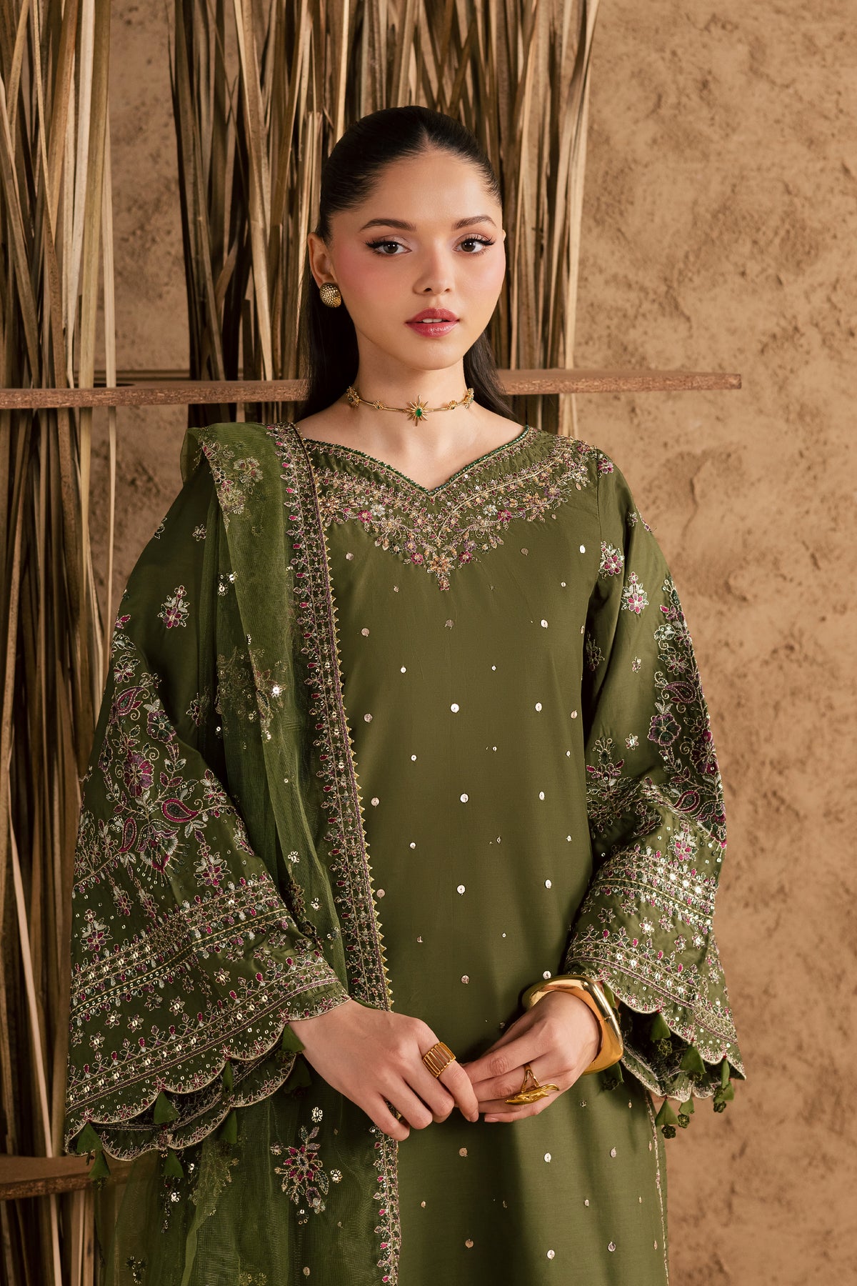 A composed embroidered Mehndi Green shirt featuring intricate tilla embroidery and sparkling sitara detailing, enhanced with subtle handwork that adds depth and refinement, perfect for Festive Eid celebrations.