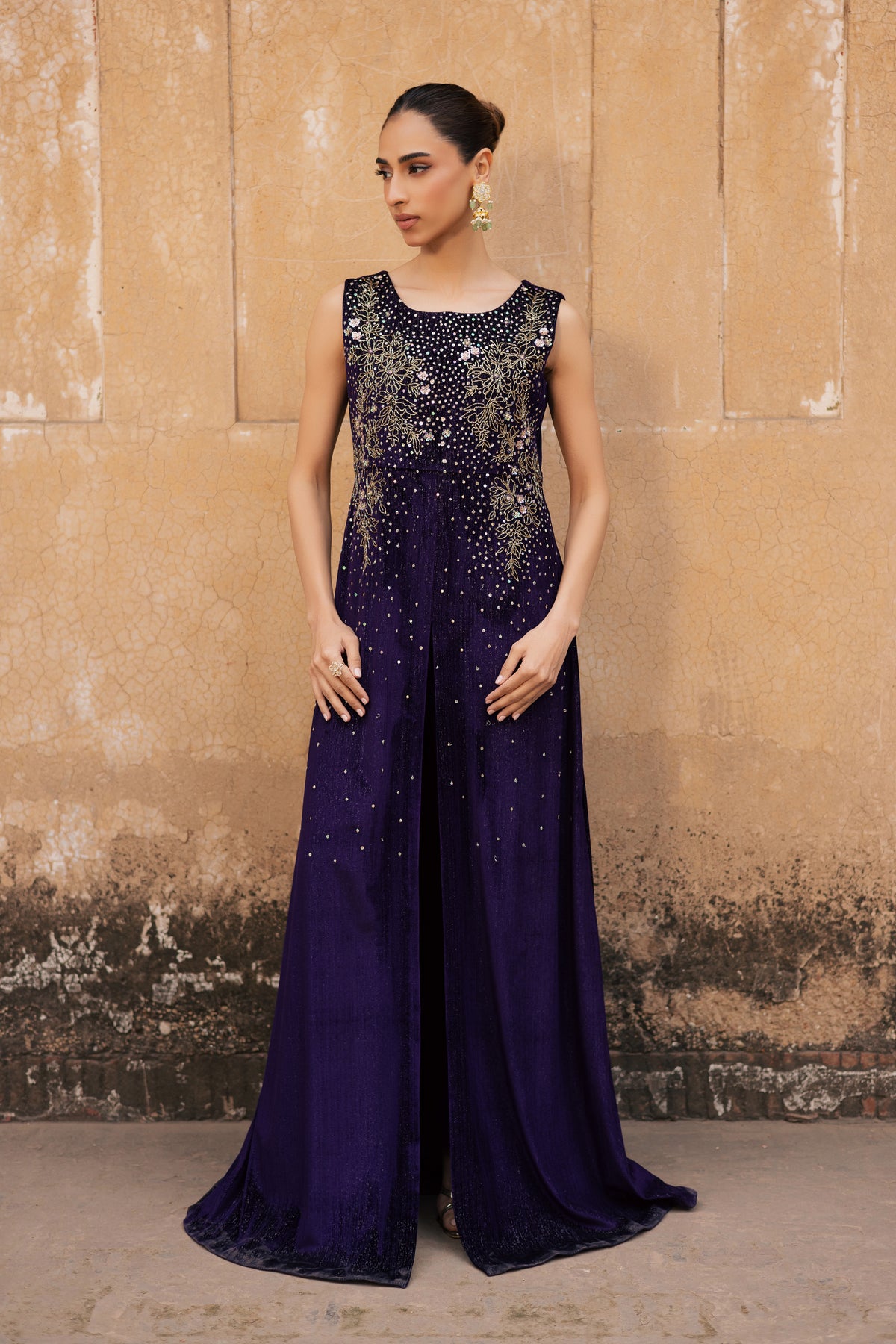 This two piece dark purple velvet set features a long sleeveless shirt with zari texture, designed with a front slit and a boat neckline. The neckline is hand embellished with cut dana, sequins, and stone work, adding a soft shimmer to the clean silhouette.
