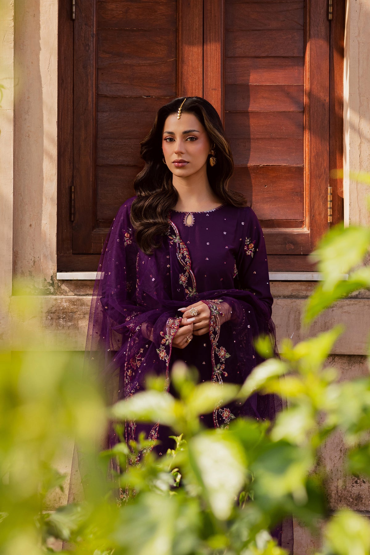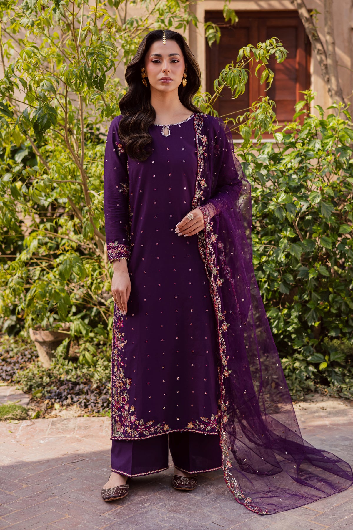 An embroidered net dupatta completes the look, adding lightness and polished charm, making it ideal for graceful Eid celebrations.