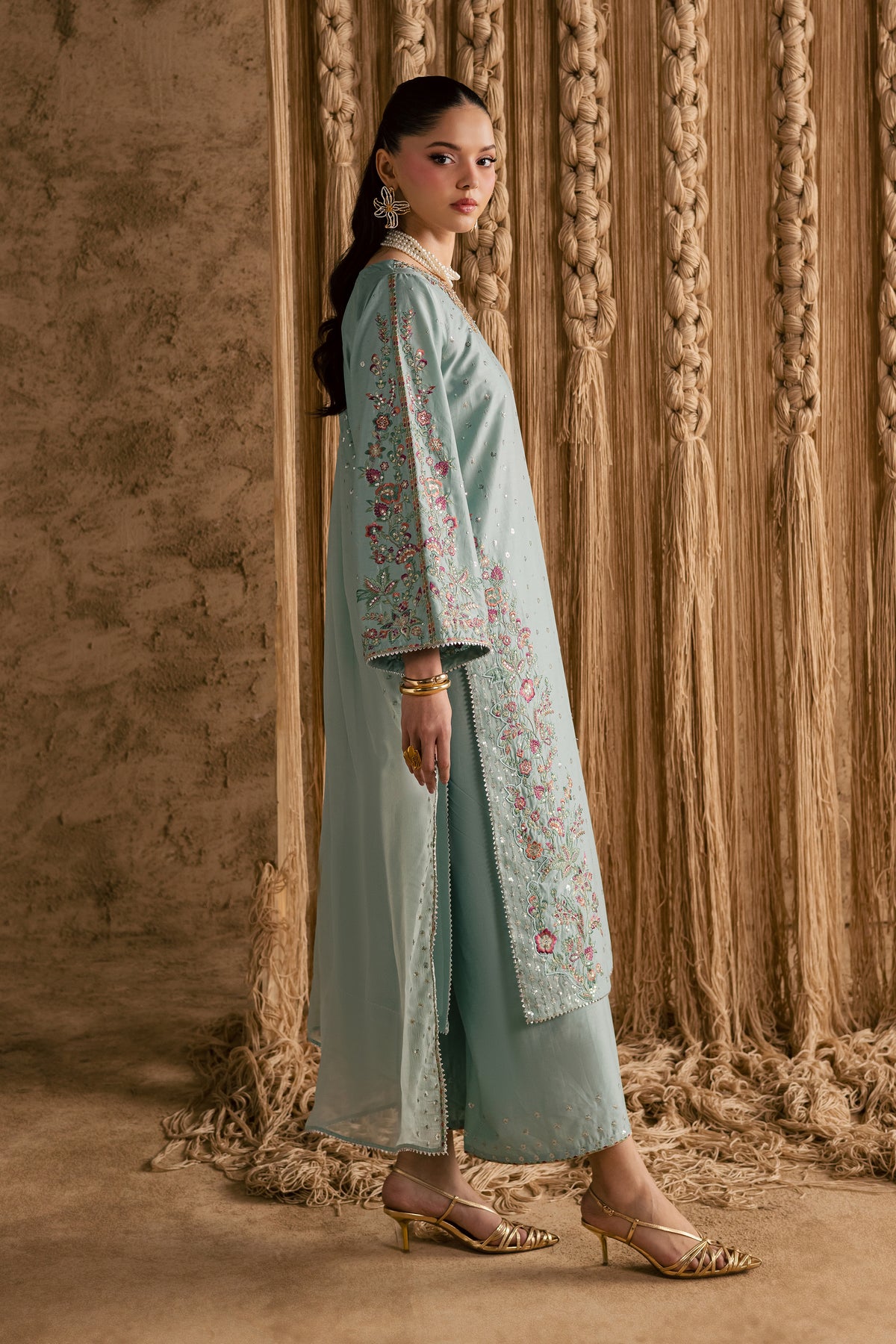 A straight long Ice Blue shirt adorned with composed embroidery across the front, elevated with intricate adda detailing along the neckline. Sequin-embroidered organza patches on the side panels introduce a refined shimmer, while the heavily embroidered flared sleeves add graceful depth.